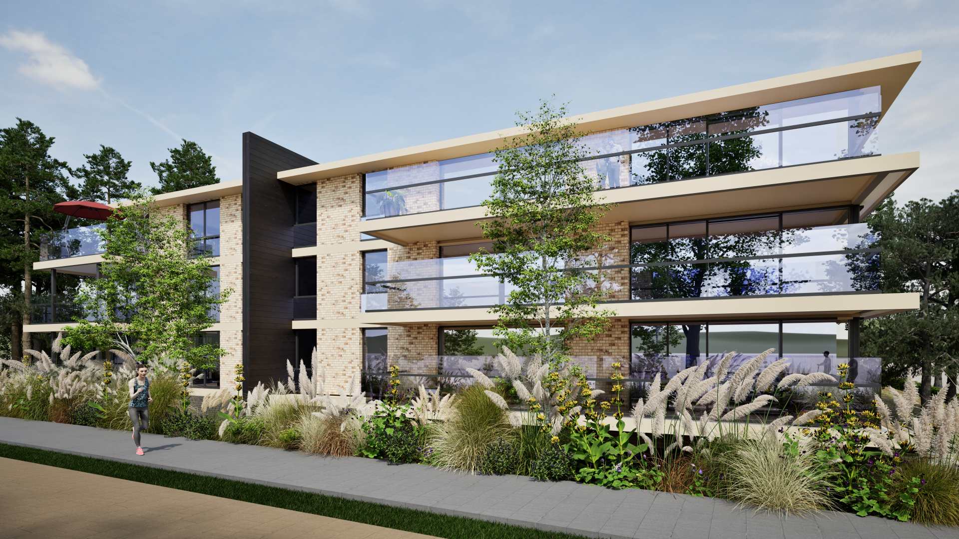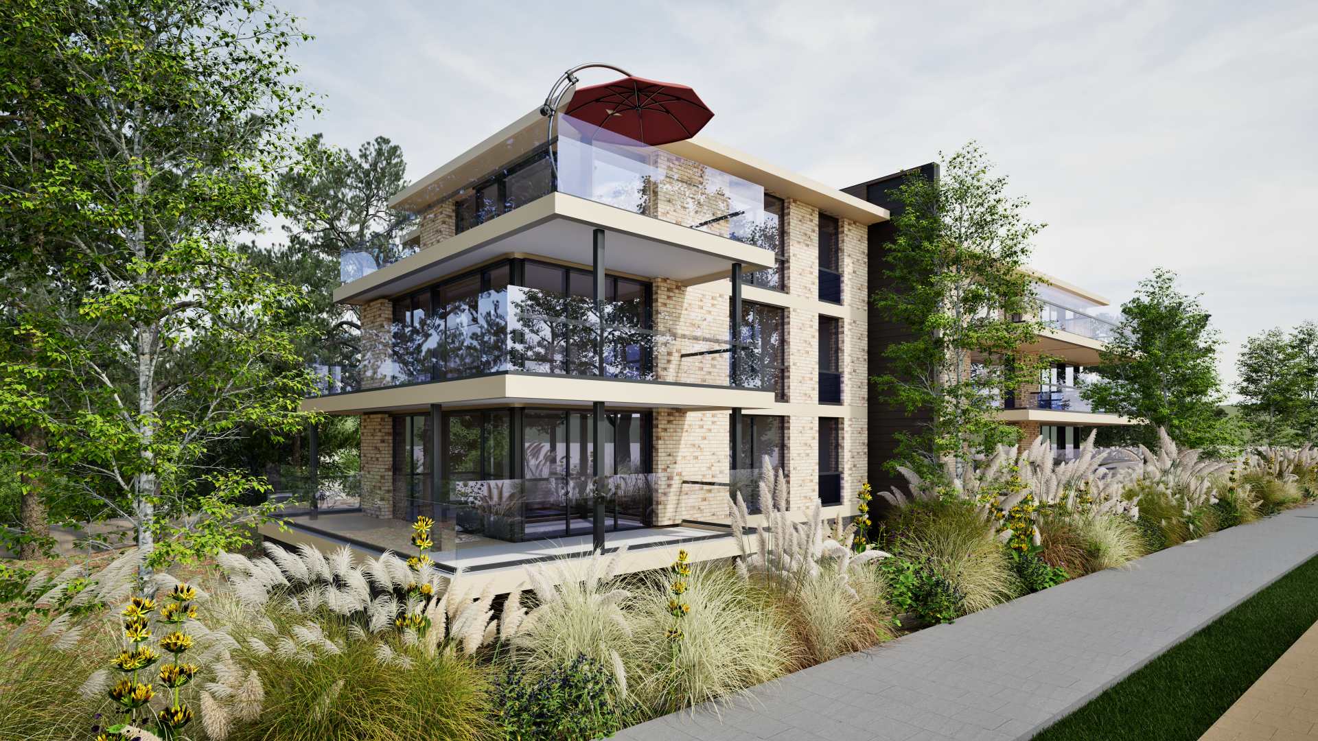 Het gebouw is voornamelijk georiënteerd op het zuidwesten, waardoor veel appartementen genieten van een overvloed aan natuurlijk licht en optimale zonligging. Iedere woning beschikt over een royaal terras of balkon en grote glaspartijen die het daglicht rijkelijk binnenlaten. Zo ontstaat een harmonieuze verbinding tussen binnen en buiten, wat resulteert in een lichte, comfortabele en ontspannen woonervaring.