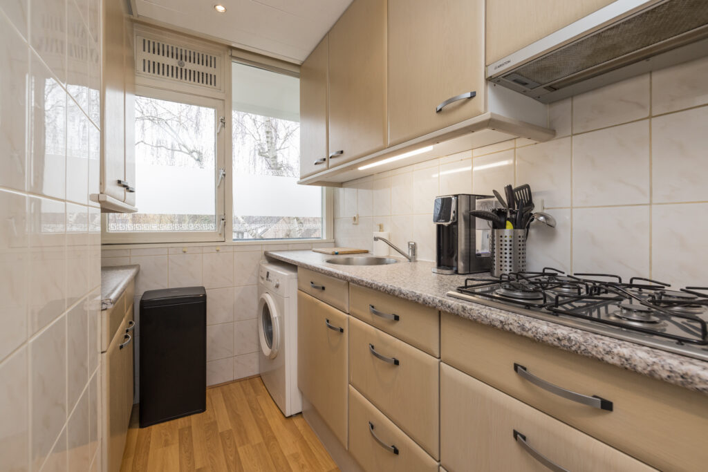 Entree via de hal met meterkast en toegang tot de praktische keuken, voorzien van kastruimte, 4-pits rvs gaskookplaat, afzuigkap en boiler. Nette toiletruimte en badkamer uitgerust met wastafel en douche. De lichte woonkamer beschikt over een schouw met moederhaard en biedt een leuk vrij uitzicht over de parkachtige groene omgeving. De zeer royale hoofdslaapkamer (voorheen bestaande uit twee kamers) is voorzien van een vaste kastenwand. Daarnaast is er een tweede slaapkamer van goed formaat, eveneens met vaste kast. Vanuit de woning is er toegang tot het zonnige balkon op het zuiden.