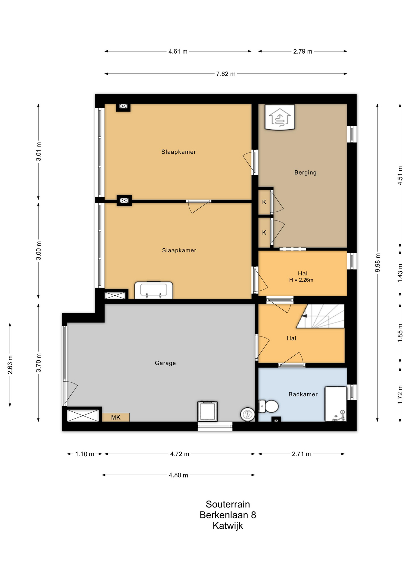 Via een vaste trap gaat u naar het souterrain: hal, eenvoudige badkamer met zitbad/douche en 2e toilet, inpandige garage met aansluiting voor de wasmachine/droger, tussen(werk)kamer met opstelling van de warmtepomp, twee goede slaapkamers voor de kinderen of voor een extra werk/hobbyruimte aan huis.
