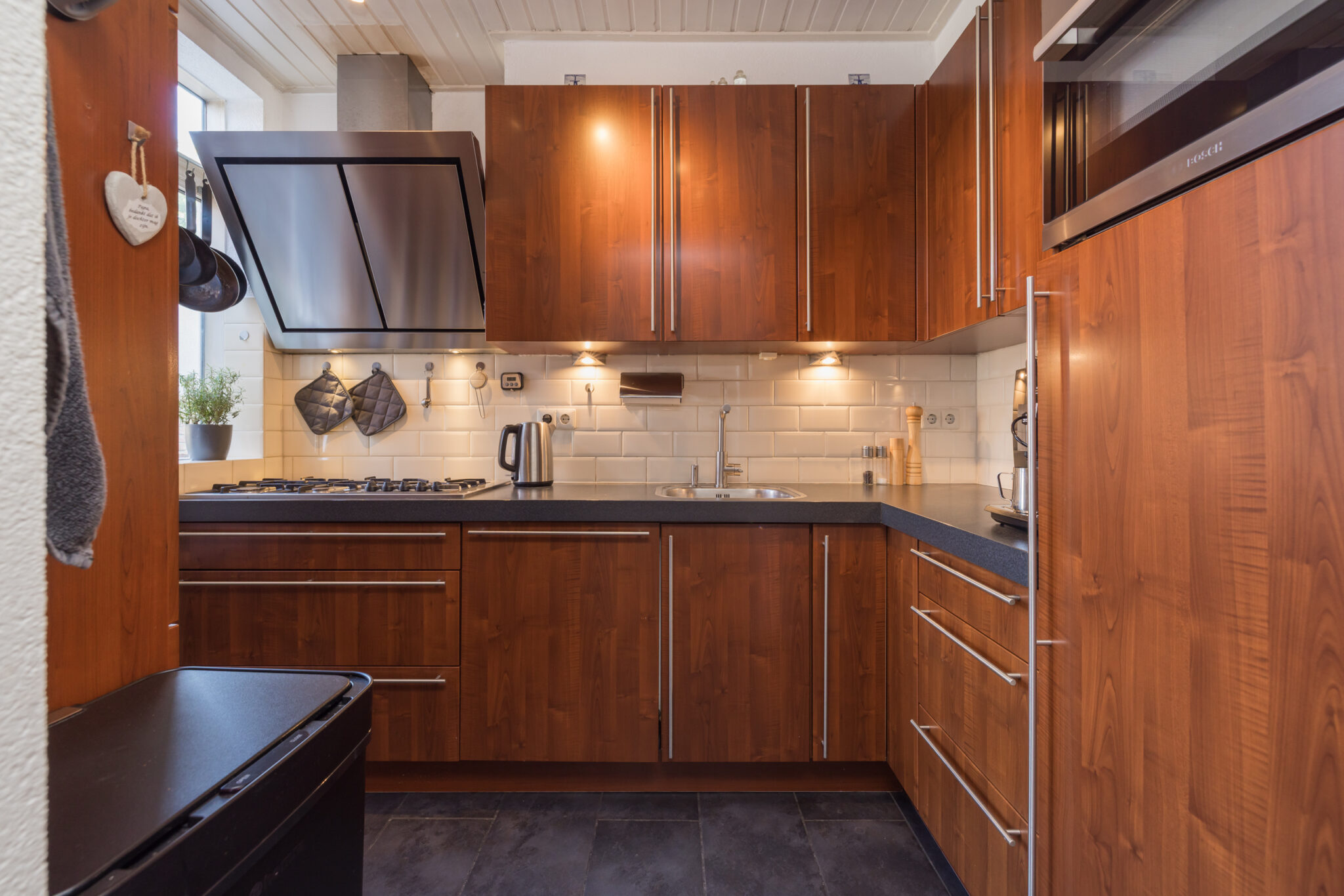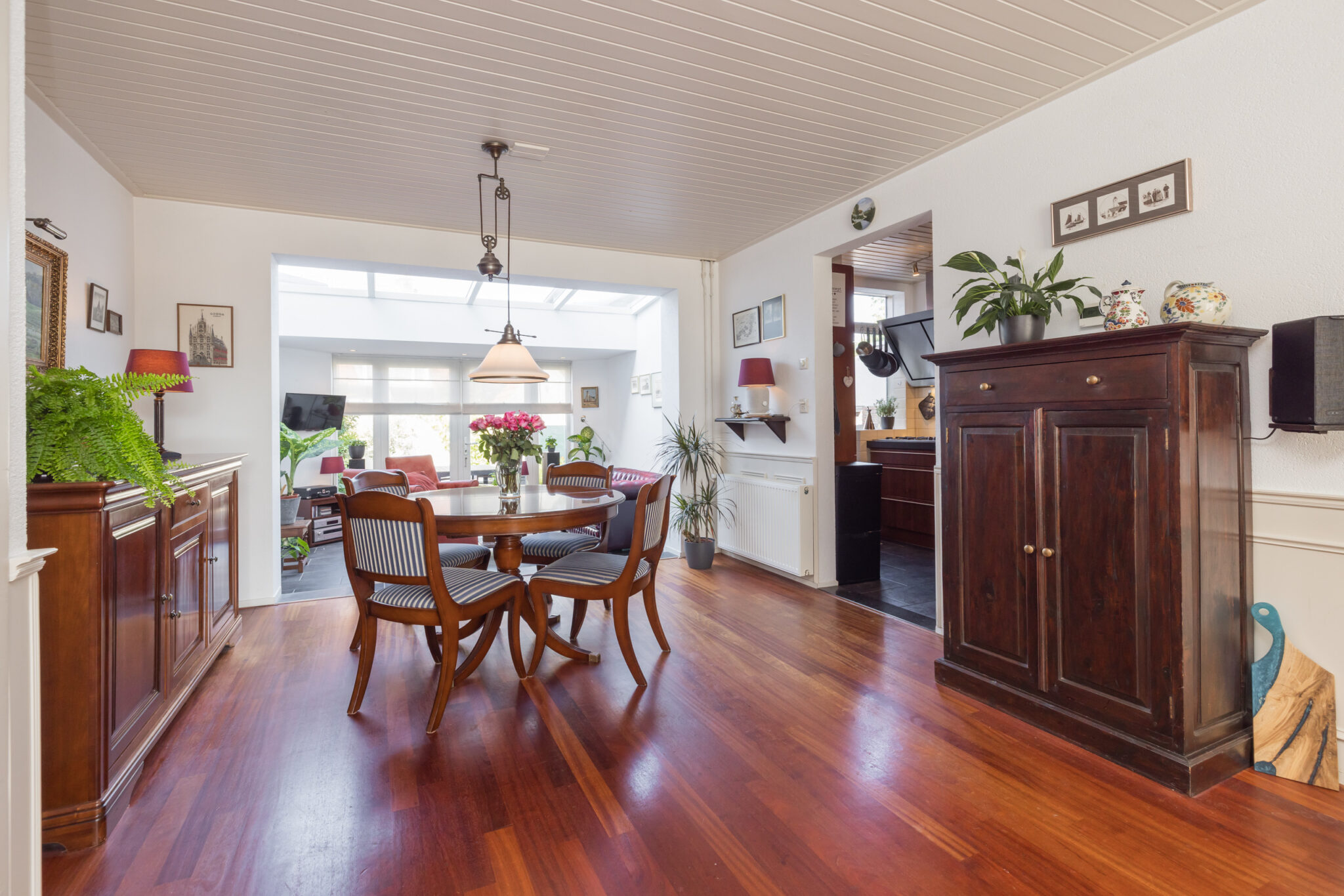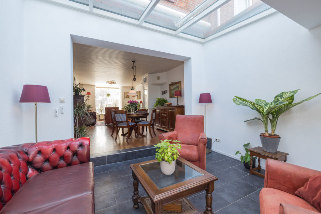Indeling: Entree, ruime hal met moderne meterkast (12 groepen), diepe trapkast en een separaat toilet. Zeer royale woonkamer met erker aan de voorzijde, sierkachel, vaste kast en aangebouwde serre aan de achterzijde v.v. openslaande deuren, lichtstraat en elektrische zonwering. Moderne keuken met veel bergruimte v.v. 5-pits gaskookplaat, afzuigkap, vaatwasser, koelkast met vriesvak en combi-oven.