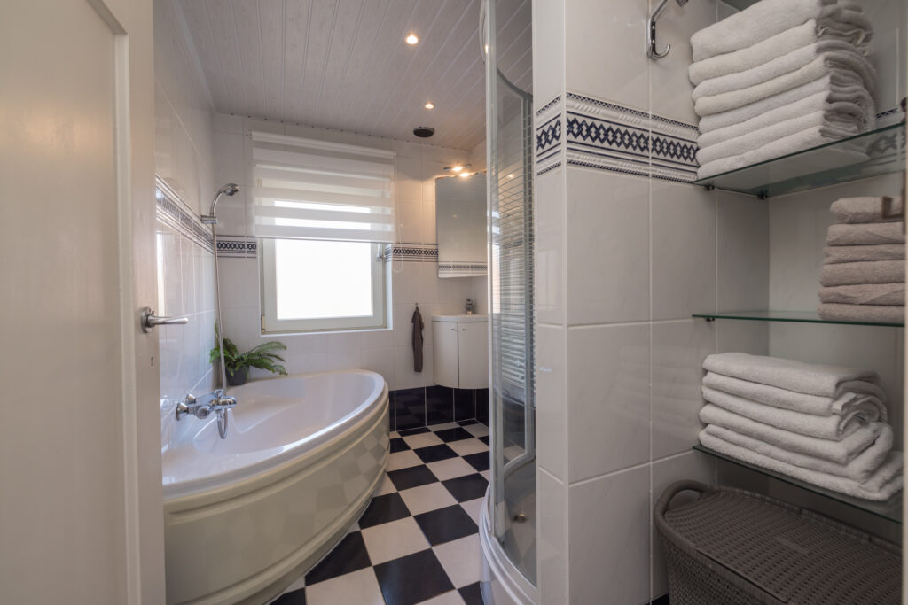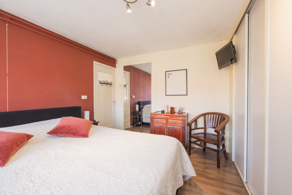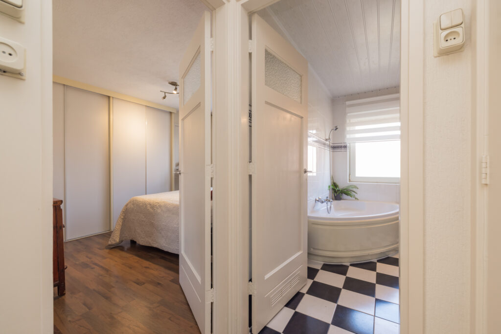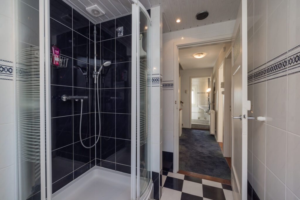 1e Etage v.v. kunststof kozijnen met draai-/kiepramen: overloop met separaat toilet. De voormalige badkamer aan de voorzijde is thans in gebruik als wasruimte en voorzien van wastafel. De huidige badkamer is groot van formaat en uitgerust met douchecabine, groot ligbad, wastafelmeubel en een handig nisje voor de handdoeken. Ouderslaapkamer aan de achterzijde voorzien van schuifkastenwand en aan de voorzijde een tweede ruime slaapkamer met dubbele vaste kast en toegang tot het balkon op de erker.