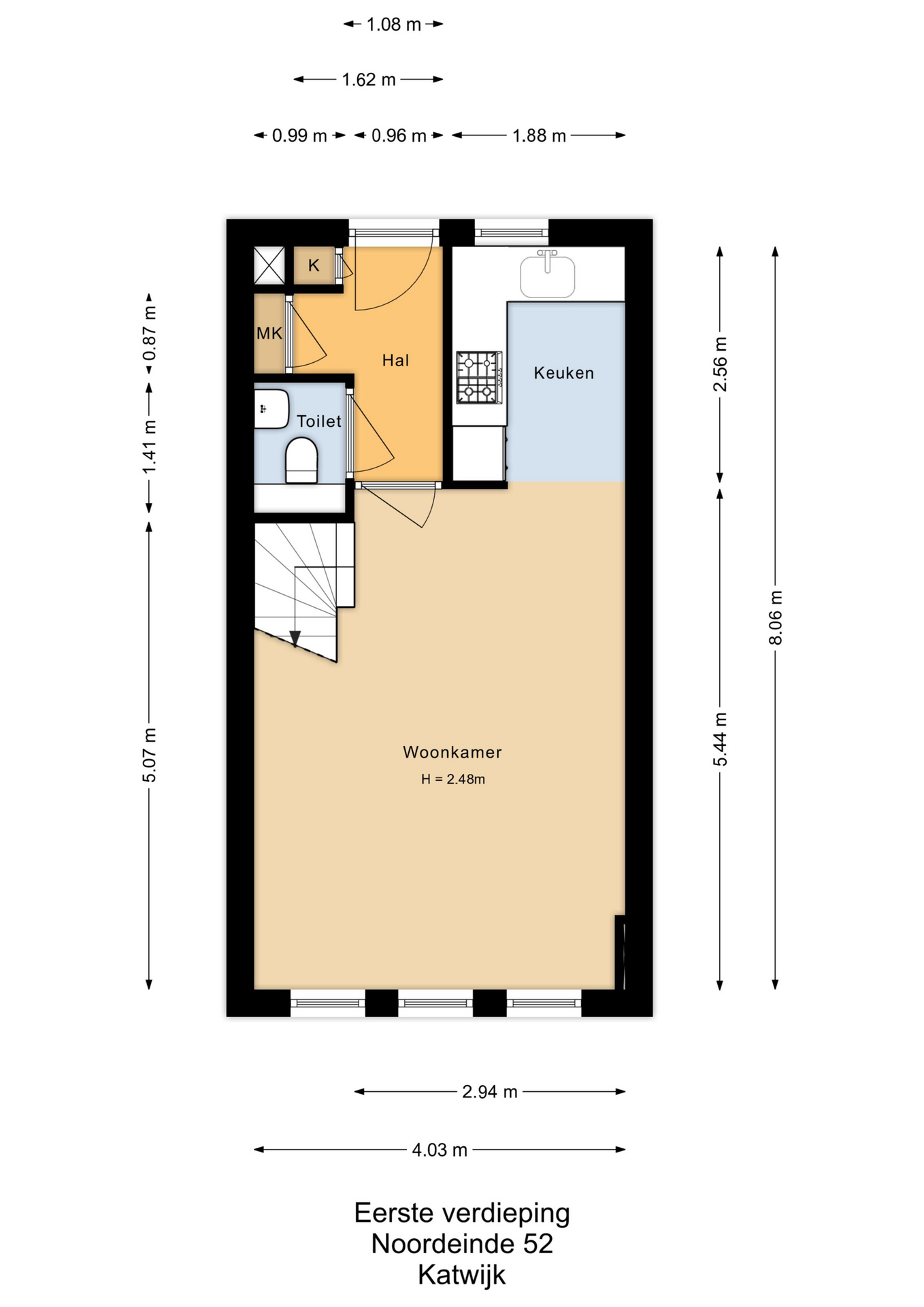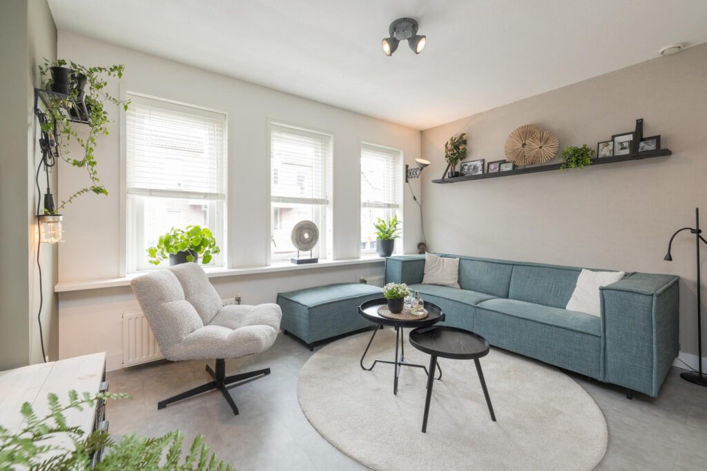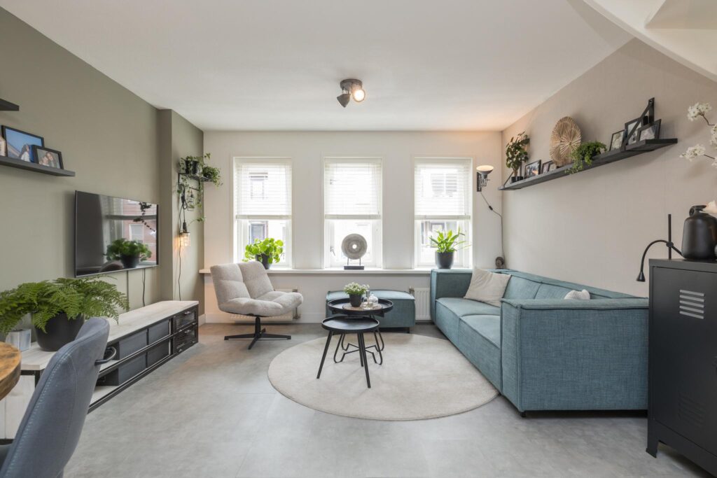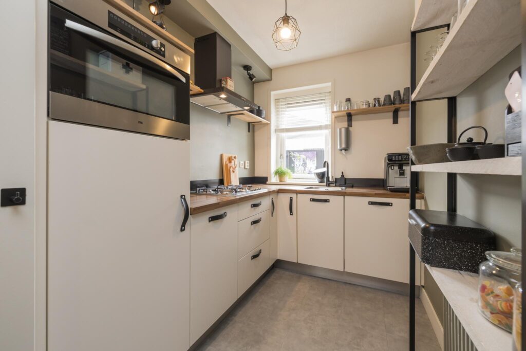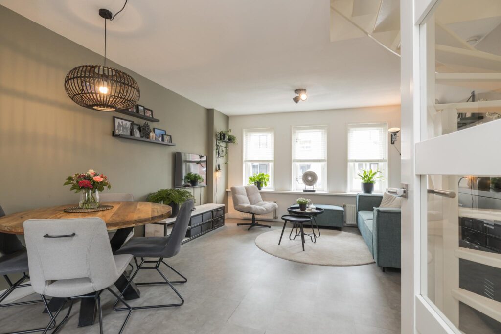 Entree met hal, garderobekast, meterkast en modern vrijhangend toilet met fonteintje. Ruime woonkamer met strak gestuukte wanden, pvc-vloer en levendig uitzicht op het Noordeinde. De moderne open keuken biedt uitzicht op het dakterras en is voorzien van een gaskookplaat, afzuigkap, vaatwasser en koel-/vriescombinatie.