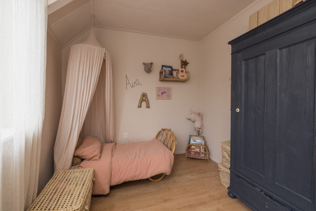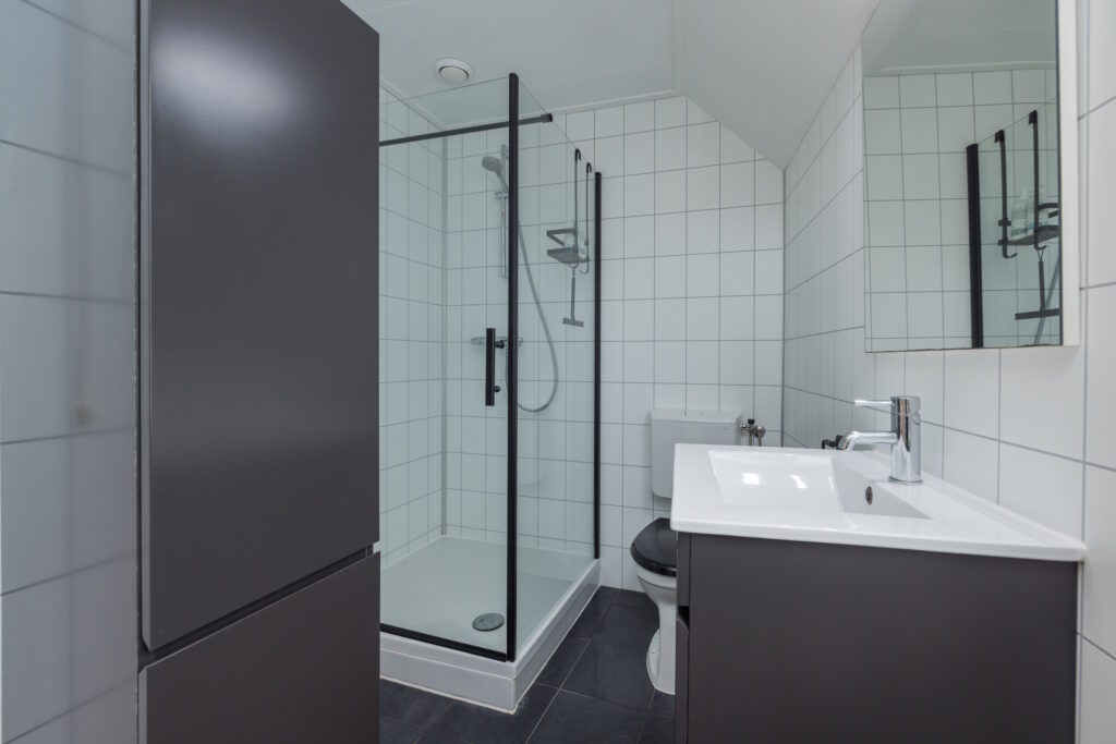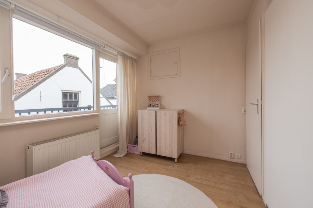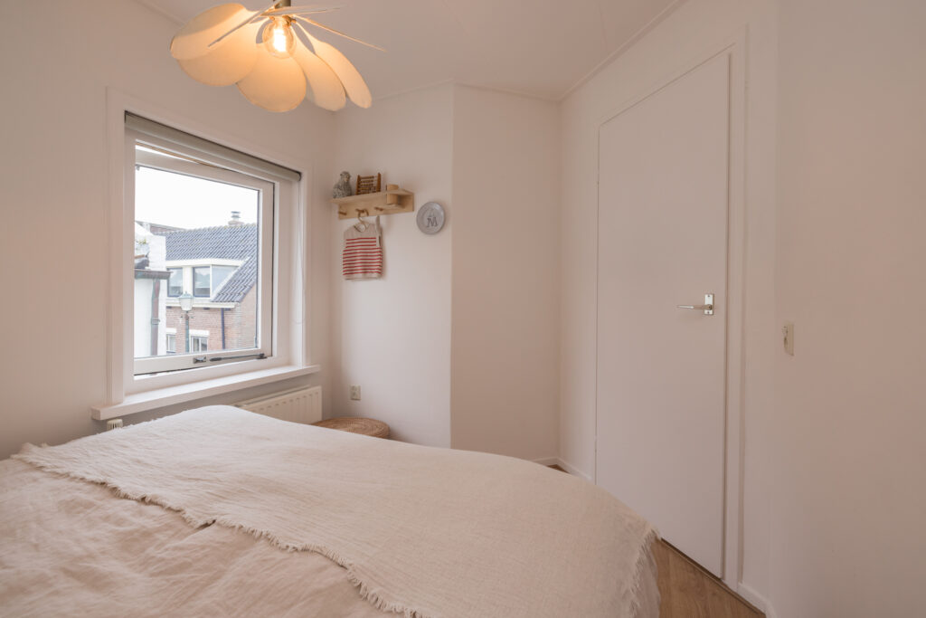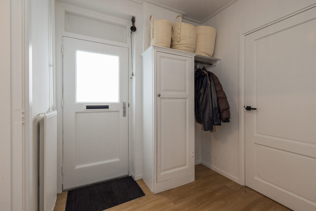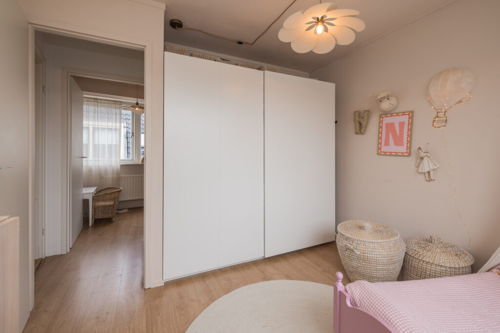 Op de overloop bereik je de ouderslaapkamer aan de voorzijde met laminaatvloer en twee slaapkamers aan de achterzijde, waarvan één directe toegang heeft tot het dakterras – een fijne plek om buiten te zitten. Boven de trap is tussen de kamers op slimme wijze extra bergruimte gecreëerd. Ideaal om spullen netjes uit het zicht op te bergen en daarmee een zeer waardevolle toevoeging aan de woning. De moderne badkamer is compleet uitgevoerd met een tweede toilet, douchecabine, wastafelmeubel en designradiator.
