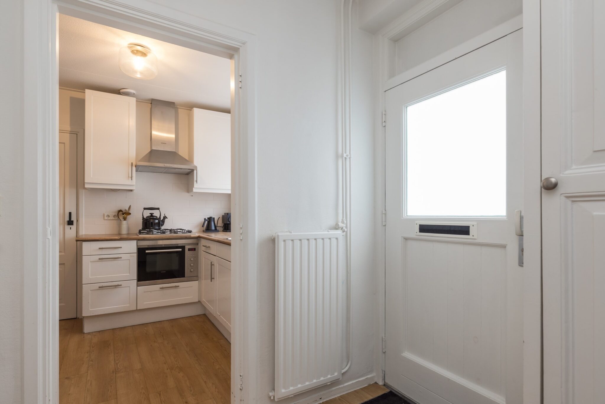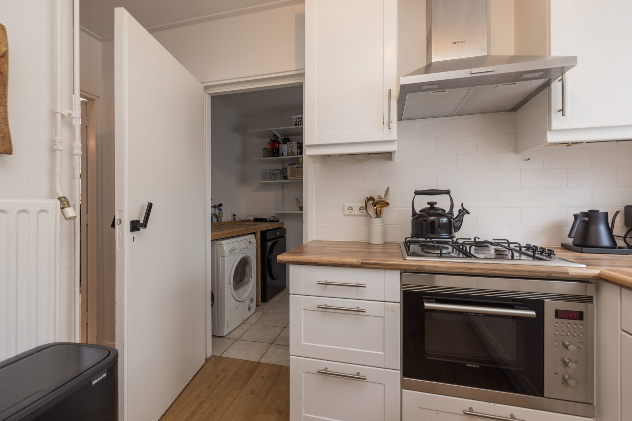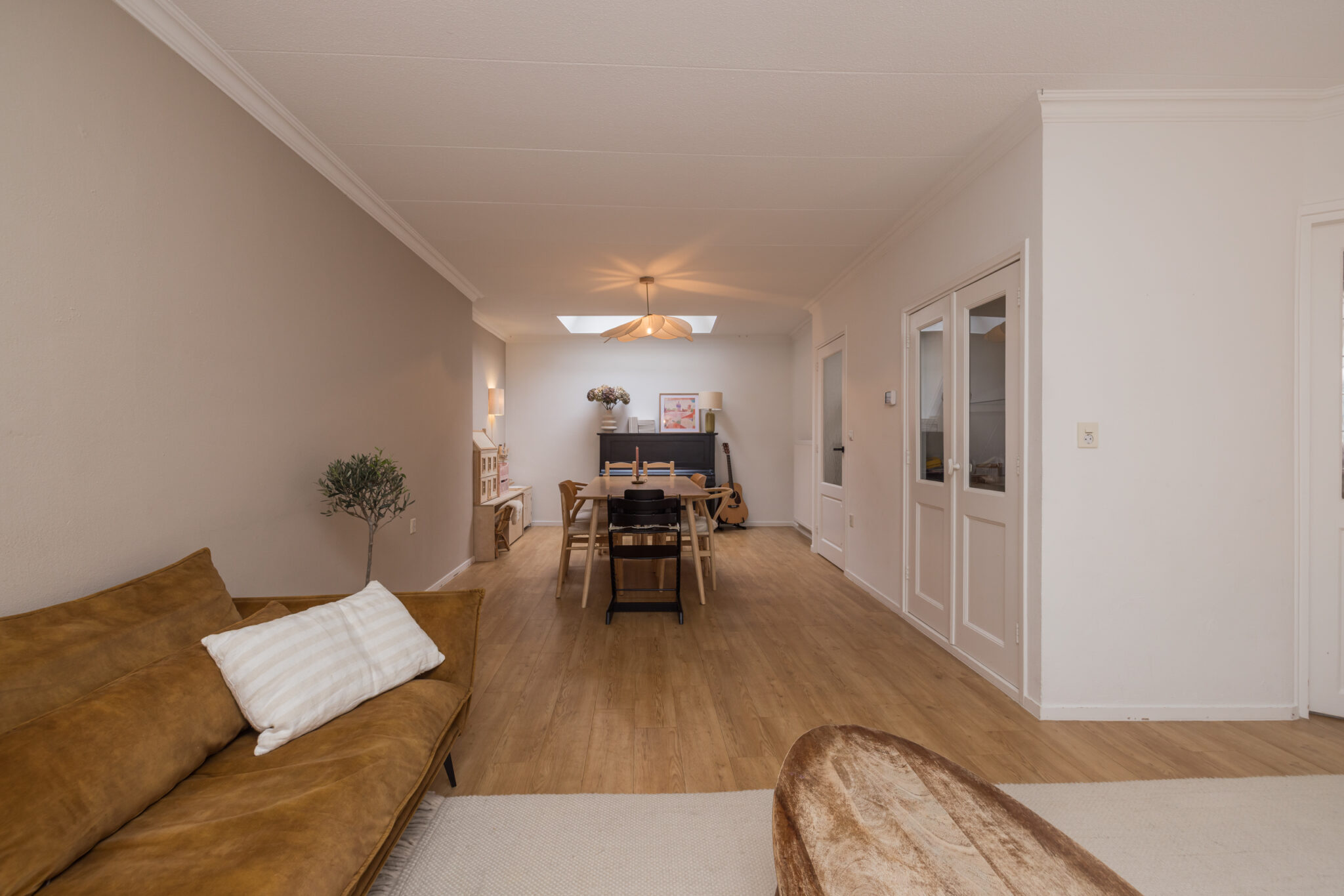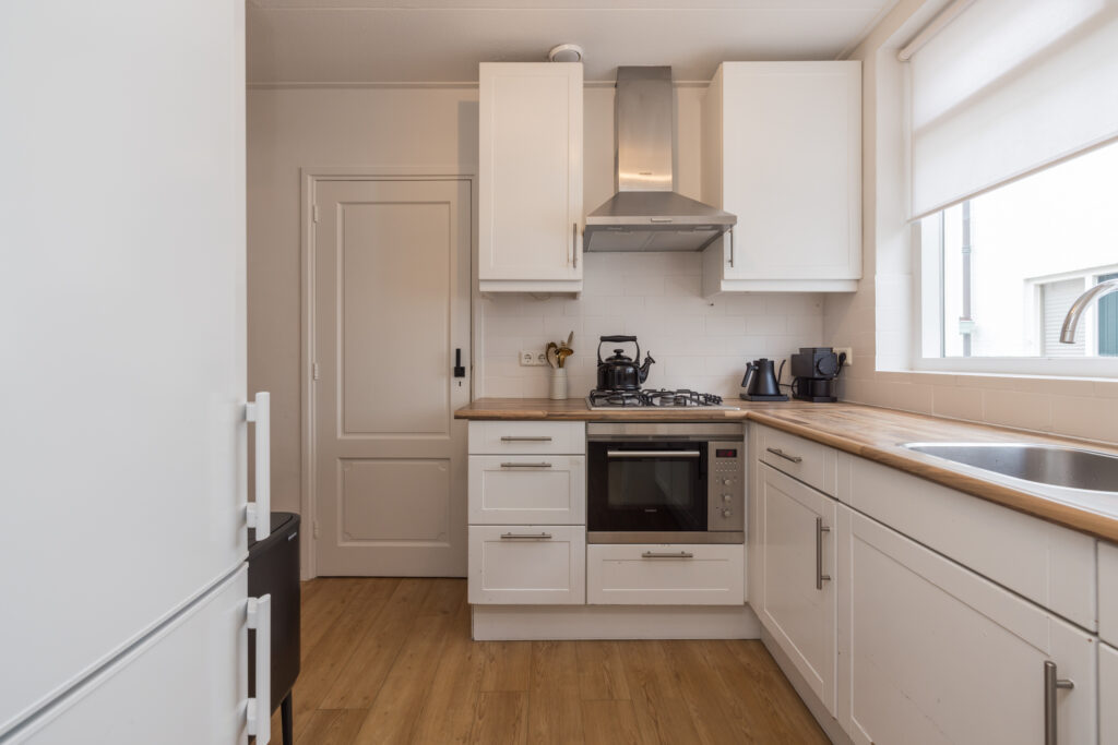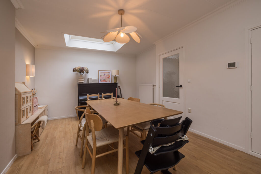 Via de entree kom je in de hal met garderobe, moderne meterkast en toilet met fonteintje. De ruime L-vormige woonkamer voelt prettig licht aan door de lichtkoepel en heeft een vaste vitrinekast die het geheel extra karakter geeft. De keuken bevindt zich aan de voorzijde en is afgesloten, voorzien van diverse inbouwapparatuur zoals een gaskookplaat, afzuigkap, combimagnetron en vaatwasser. Aansluitend vind je de praktische bijkeuken met plek voor de wasapparatuur, de c.v.-combiketel (Nefit HR, augustus 2017) én ruimte voor fietsen.