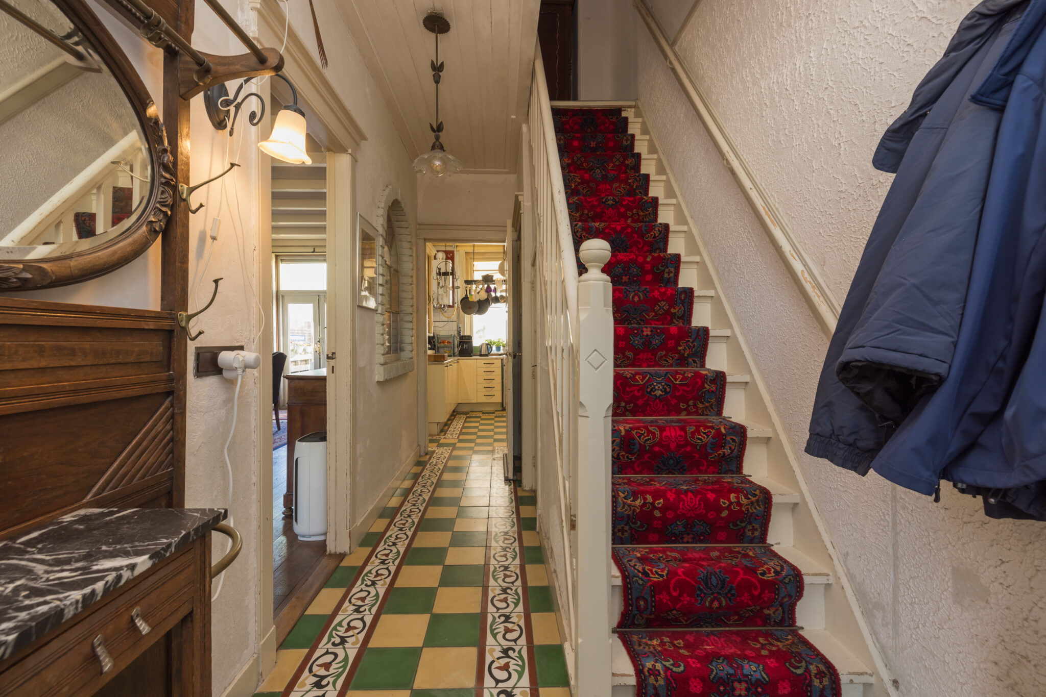 Entree, brede hal met toilet, trapkast en een uitgebreide, moderne meterkast. Direct vallen de Portugese tegeltjes, de fraaie kozijnlijst en de sierlijke trapafwerking op.
