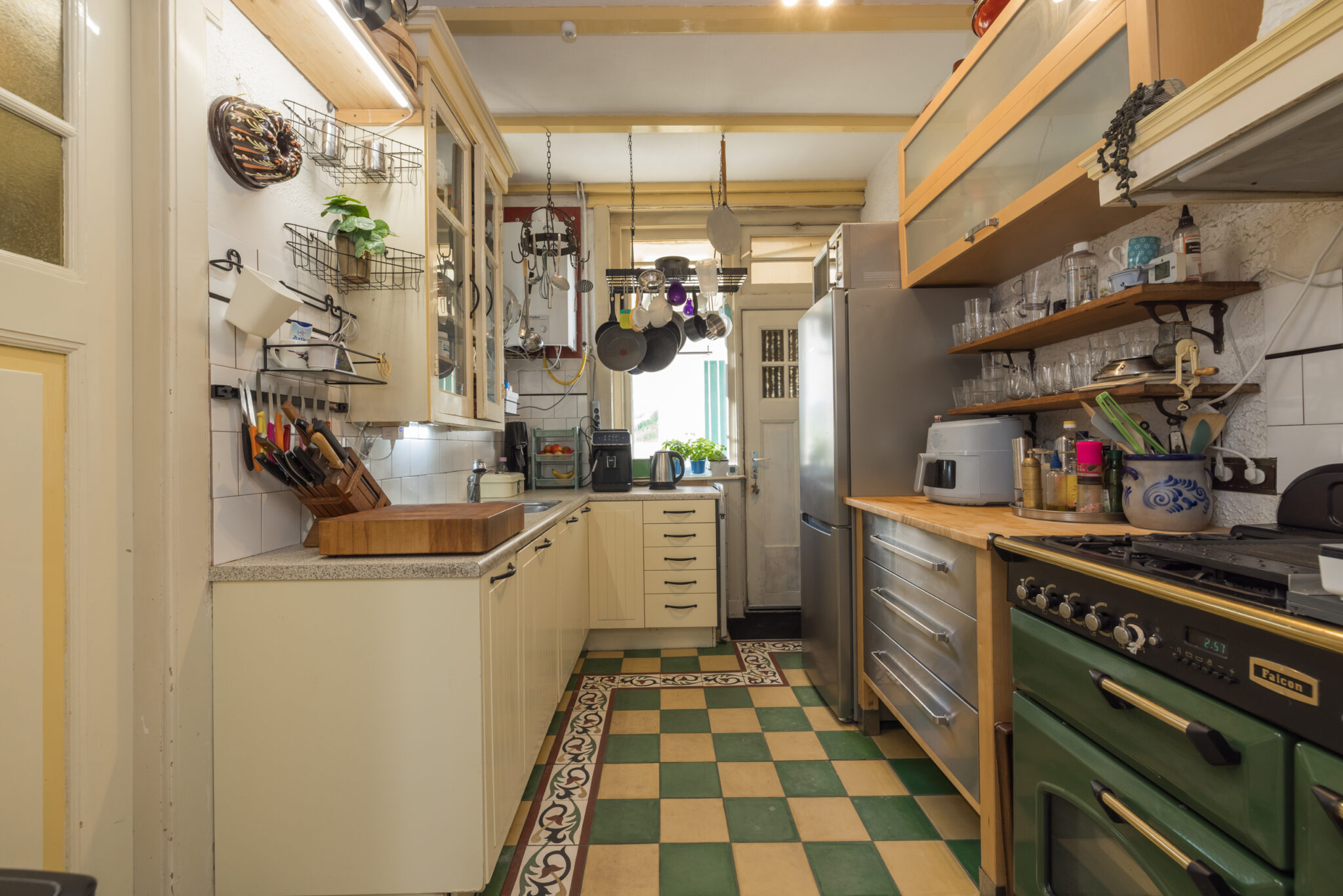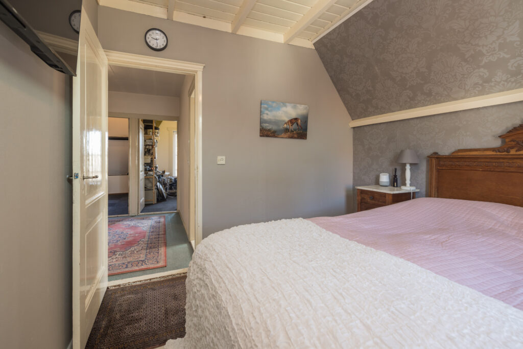 De royale woonkamer met een plafondhoogte van circa 2,80 meter ademt karakter. Het originele balkenplafond, de erker, de gashaard met schouw, paneeldeuren, het charmante tussenraam en de openslaande deuren naar de tuin geven de ruimte een warme en sfeervolle uitstraling. De keuken bevindt zich aan de achterzijde en is uitgerust met een vaatwasser en een Falcon gasfornuis. Vanuit de keuken bereik je de achtertuin met vrijstaande stenen schuur, die je eventueel bij de woning kunt betrekken om de keuken te vergroten of een bijkeuken te realiseren.