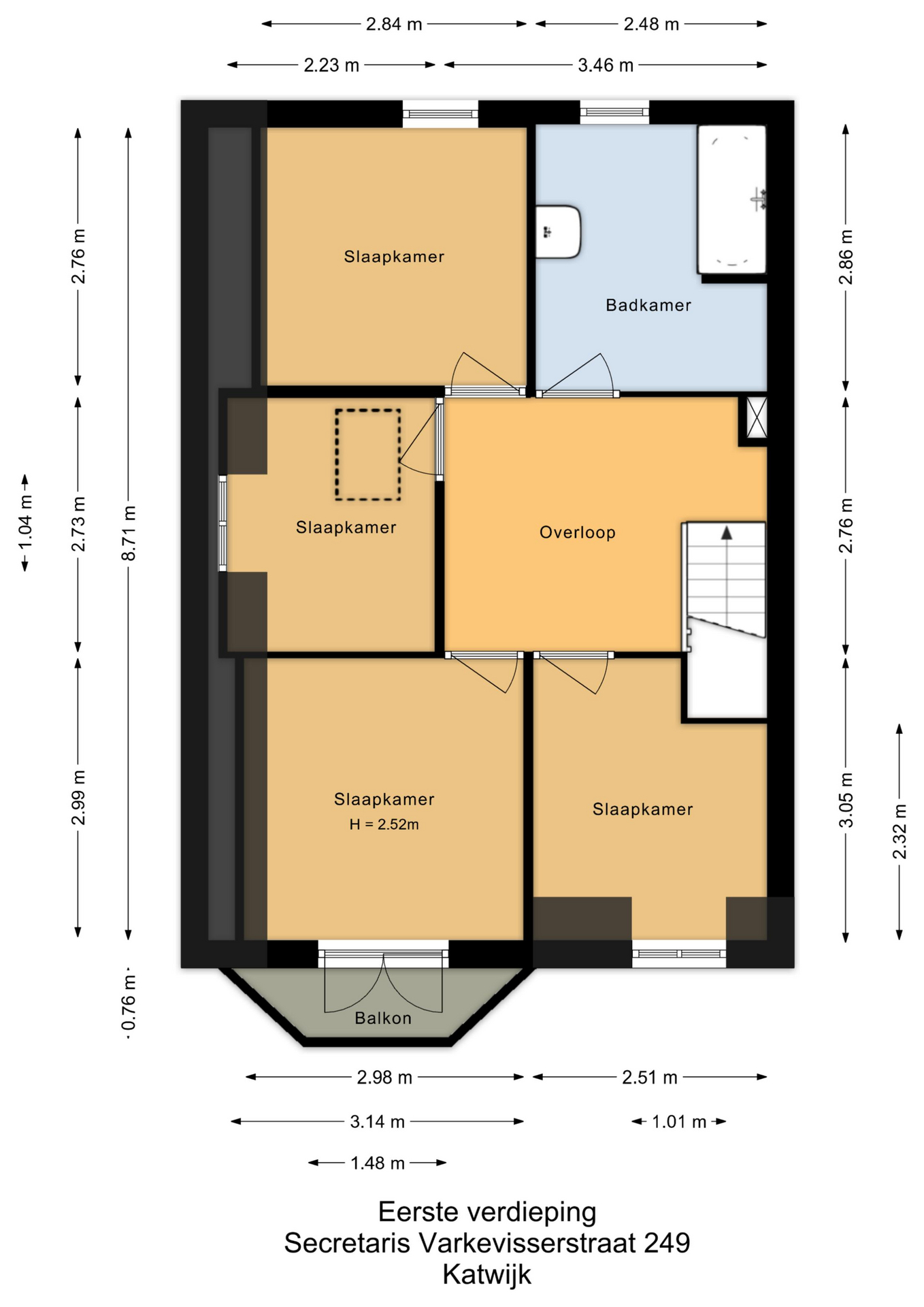 Eerste verdieping: ruime overloop met fraaie paneeldeuren naar de kamers. De ouderslaapkamer bevindt zich aan de achterzijde en beschikt over een origineel balkenplafond met fraaie kraaldelen. Aan de voorzijde liggen twee slaapkamers, waarvan één met kunststof dakkapel en één met toegang tot het balkon op de erker. De vierde kamer bevindt zich aan de zijkant, eveneens met kunststof dakkapel, en beschikt over een steektrap naar een bergvliering. De badkamer is ruim en volledig betegeld, en voorzien van een tweede toilet, ligbad, wastafelmeubel met spiegel en een aansluiting voor de wasapparatuur.