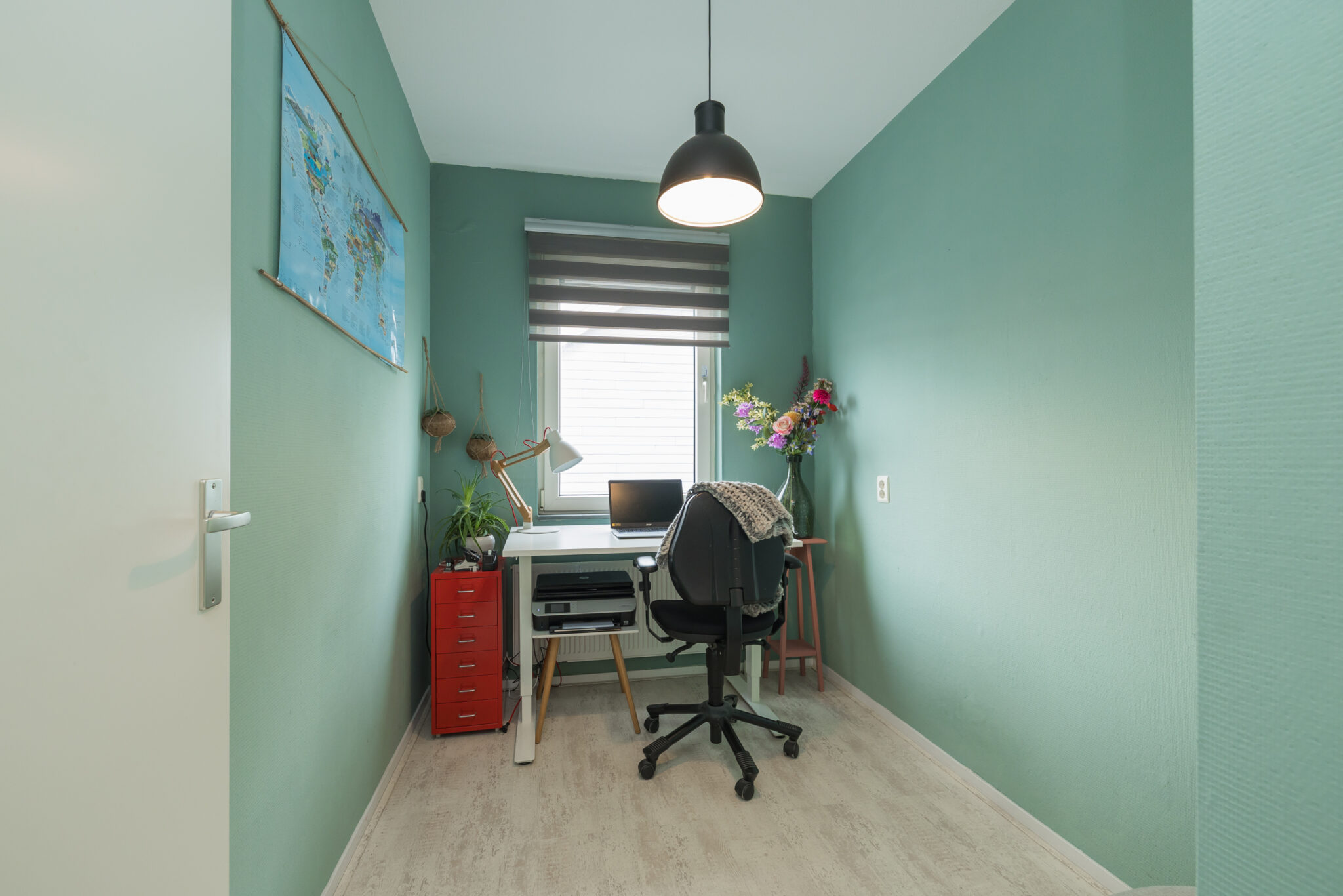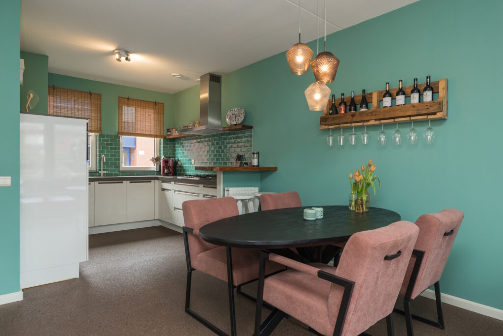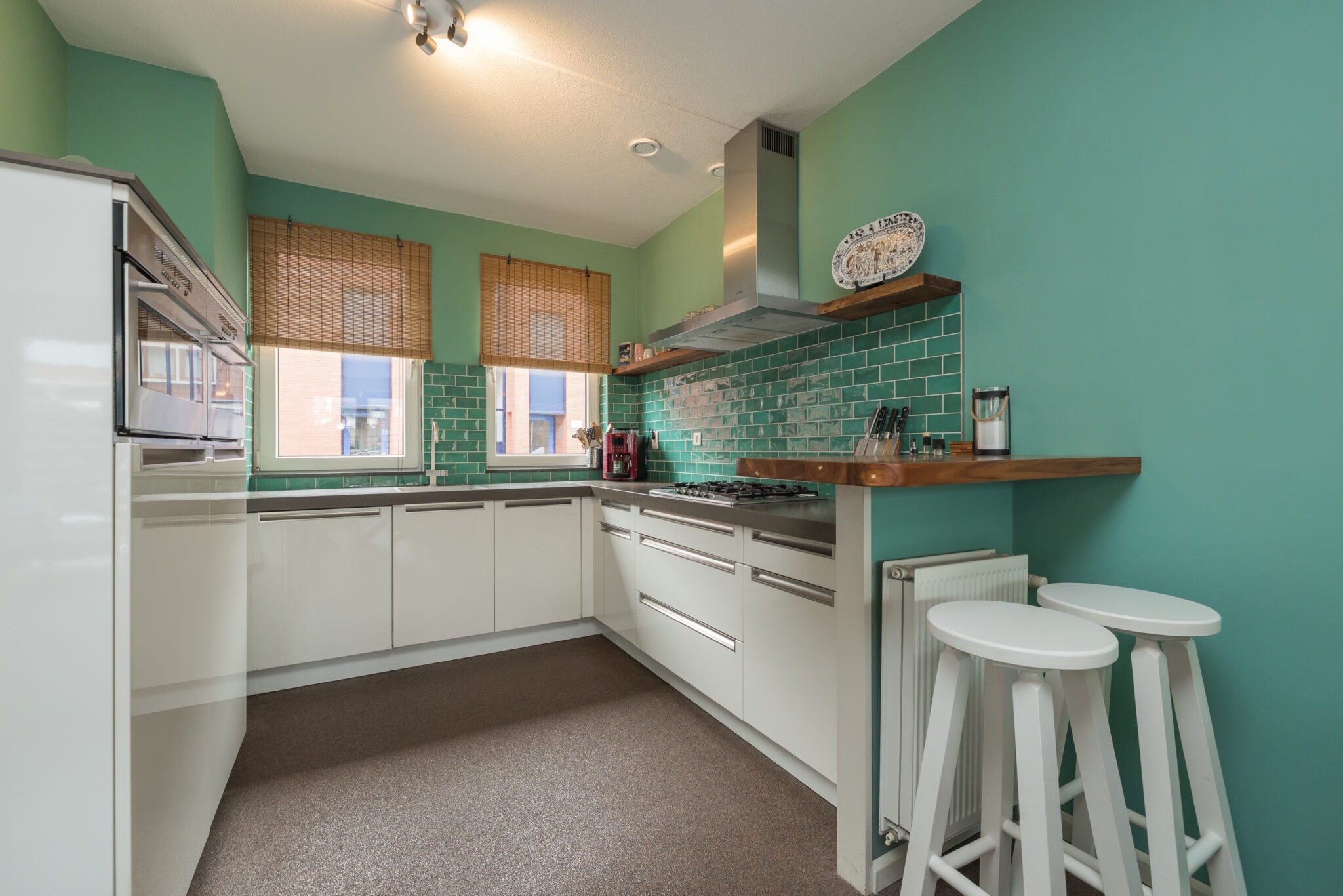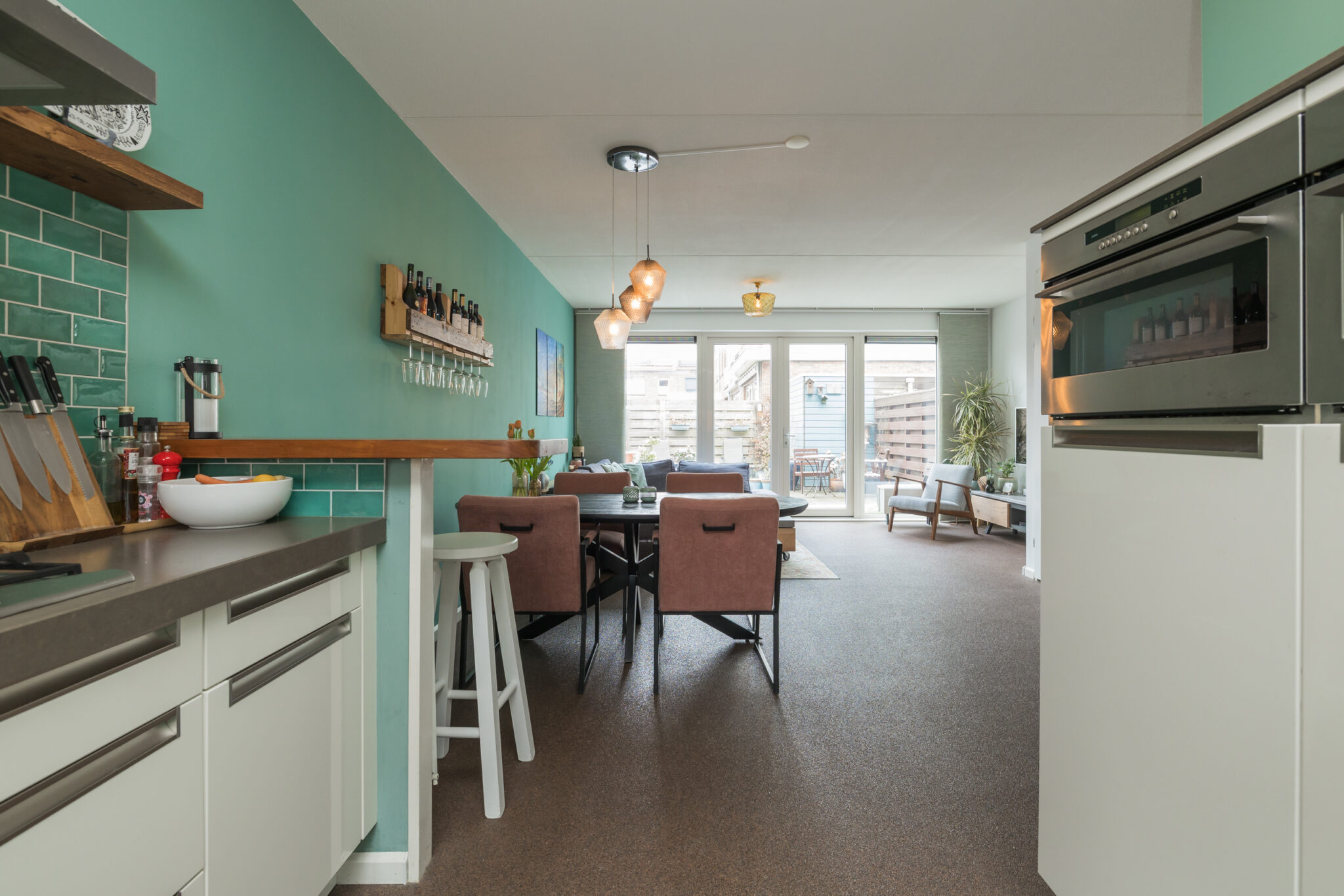 Entree, hal met meterkast en modern vrijhangend toilet met fonteinmeubel. Lichte woonkamer met praktische trapkast, siergrindvloer met vloerverwarming en openslaande deuren naar de verzorgde achtertuin met achterom en fietsenberging v.v. sedum dak. Moderne open keuken aan de voorzijde, voorzien van een bar en een composiet aanrechtblad, uitgevoerd met diverse inbouwapparatuur, waaronder een 5-pits gaskookplaat, afzuigkap, vaatwasser, oven, magnetron, ruime koelkast en een 4-ladenvriezer.