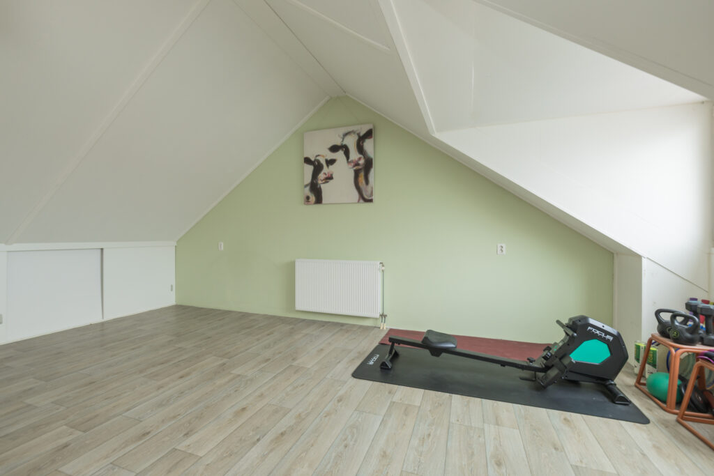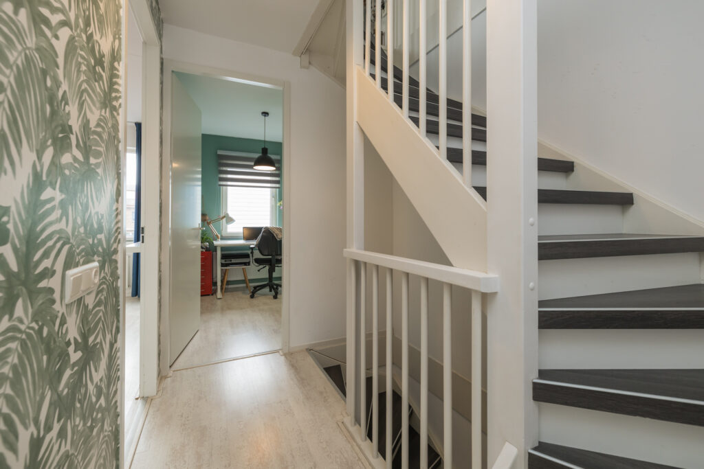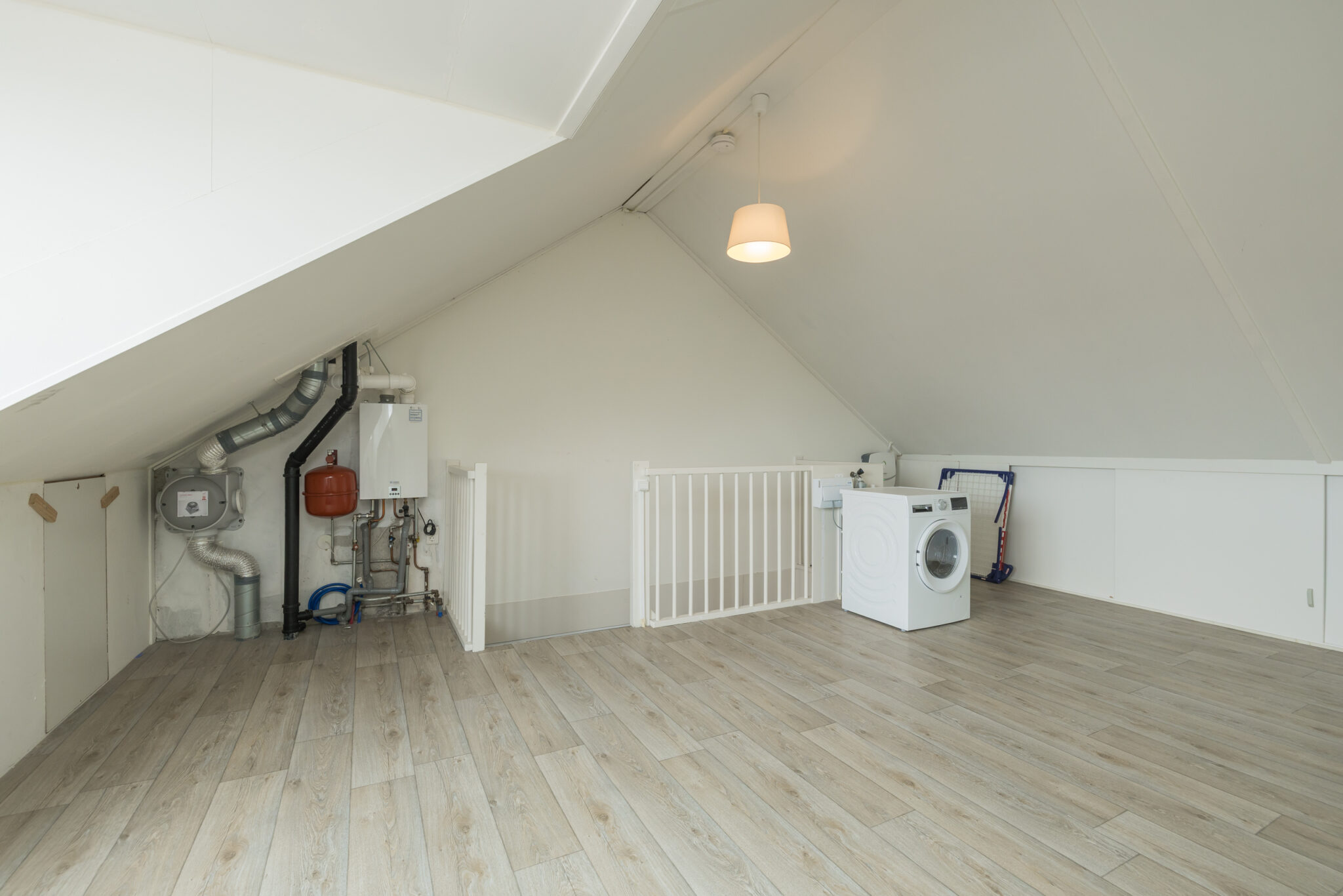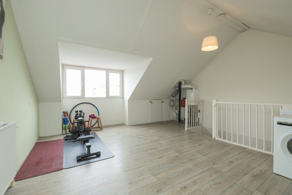 Vaste trap naar de zolderverdieping met een nokhoogte van circa 2,90 meter. De verdieping is voorzien van een groot dakkapel aan de achterzijde, bergruimte achter de knieschotten, aansluitingen voor de wasmachine en de c.v.-ketel.