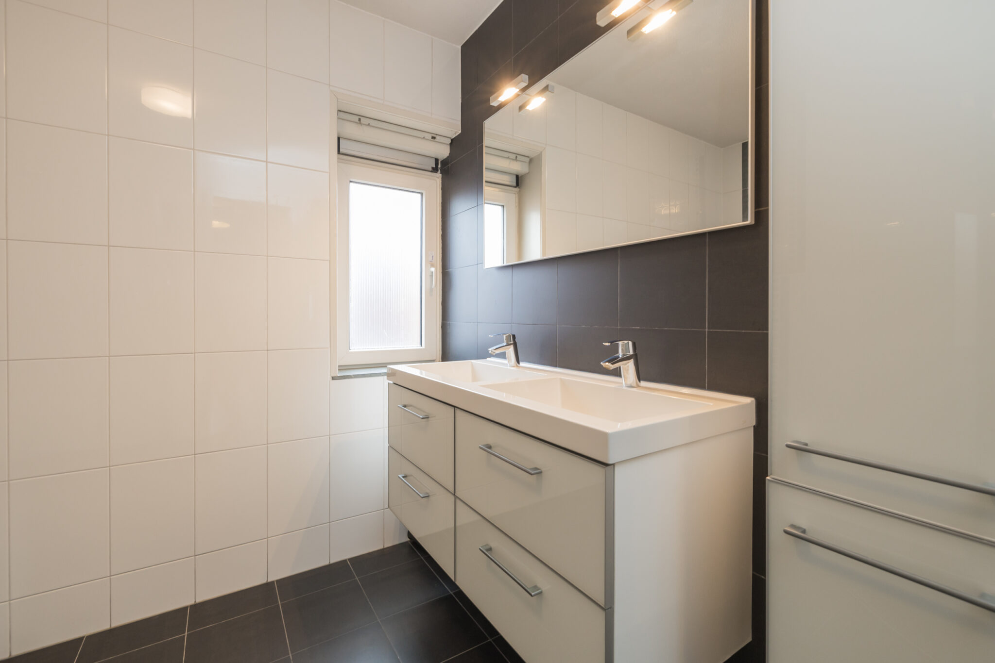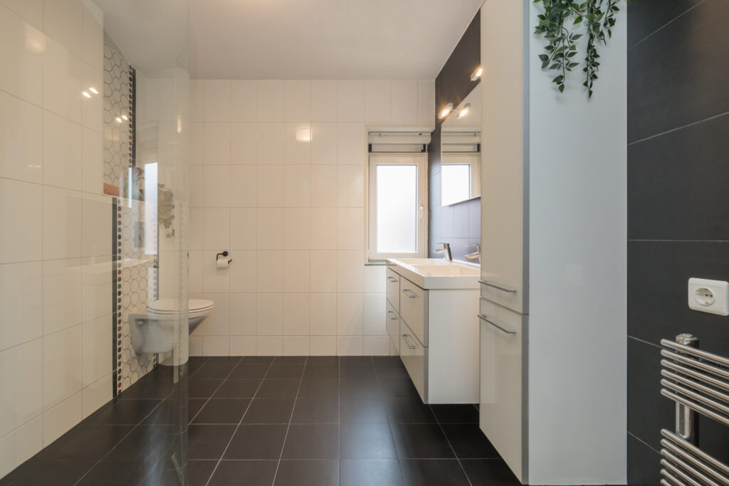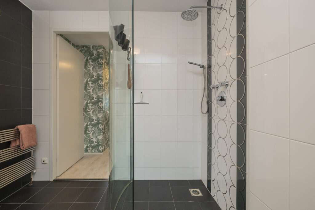 Overloop, ouderslaapkamer aan de achterzijde met moderne kastenwand en twee overige slaapkamers. De verdieping is voorzien van een moderne laminaatvloer. Zeer ruime, volledig betegelde badkamer v.v. vloerverwarming en uitgerust met tweede vrijhangend toilet, royale inloopdouche met ingebouwde kranen en regendouche, designradiator en een modern wastafelmeubel met vier lades, dubbele wastafel, spiegel en handdoekenkast.