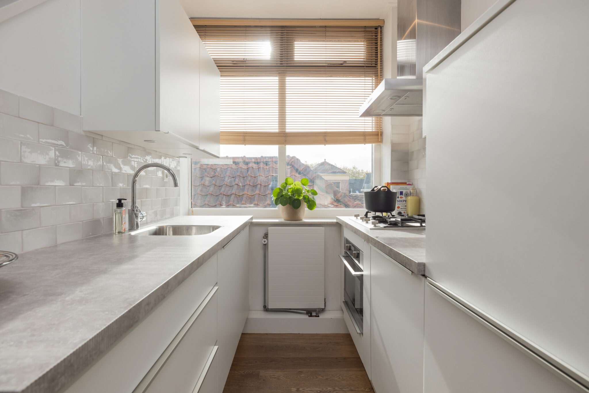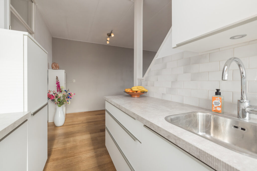 De inloopkeuken sluit daar mooi op aan en is netjes en praktisch ingericht, voorzien van een gaskookplaat, koel-/vriescombinatie en combi-oven/magnetron.