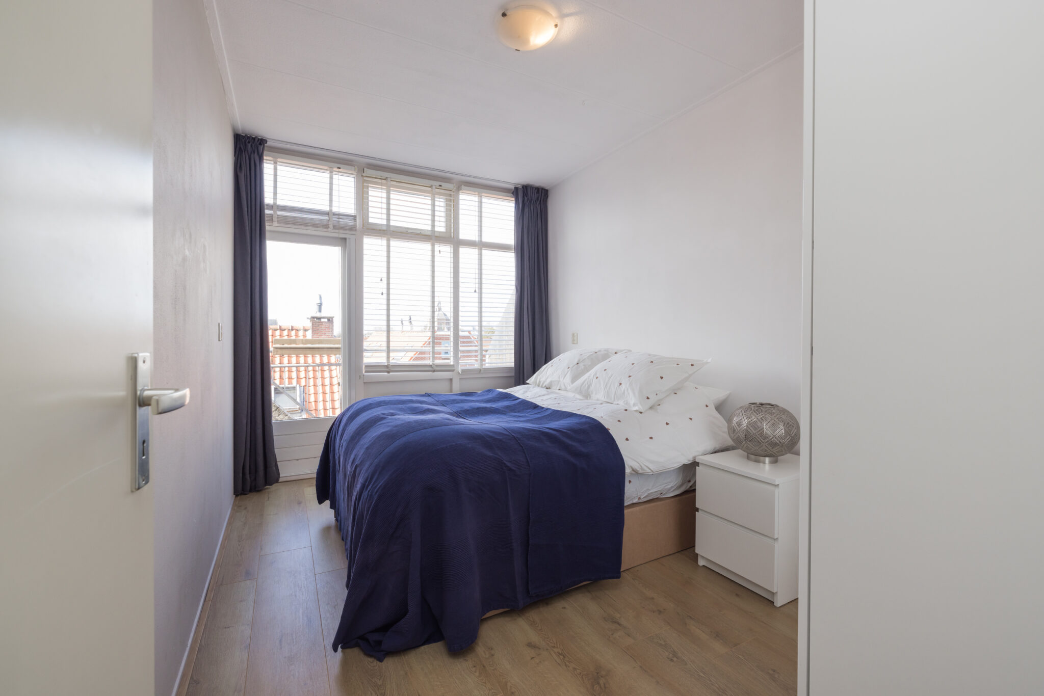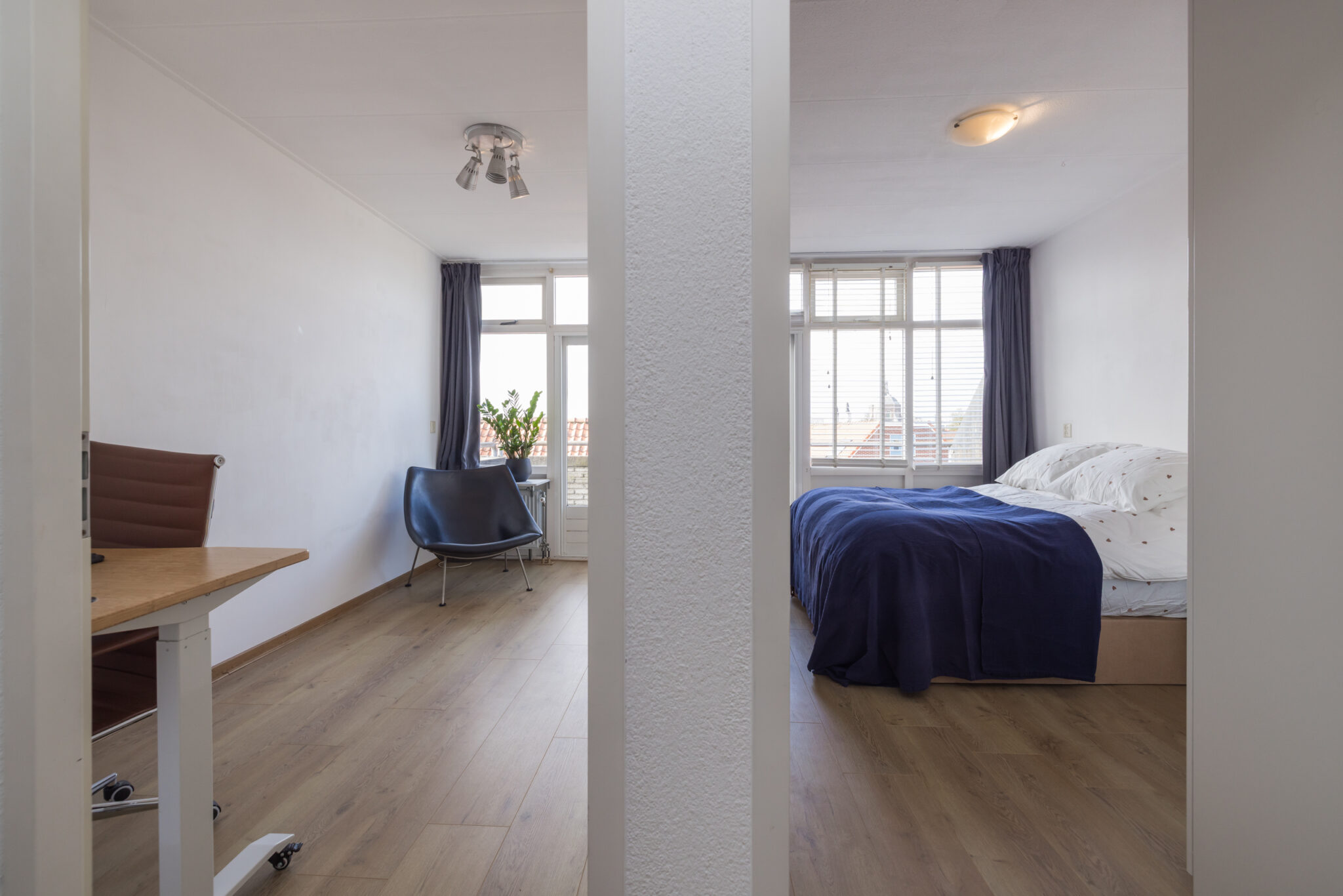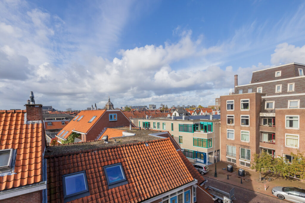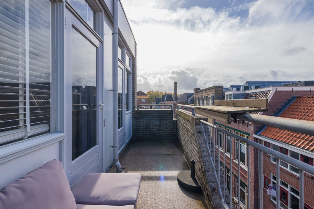 Er zijn twee slaapkamers, beide met een deur naar het balkon. Vanaf hier kijk je uit over de karakteristieke daken van de Leidse binnenstad – een uitzicht dat direct sfeer geeft.