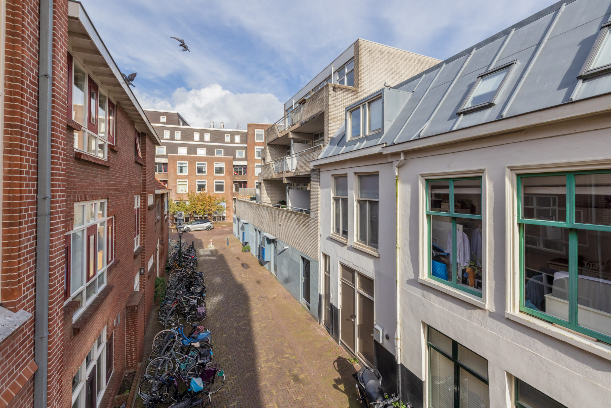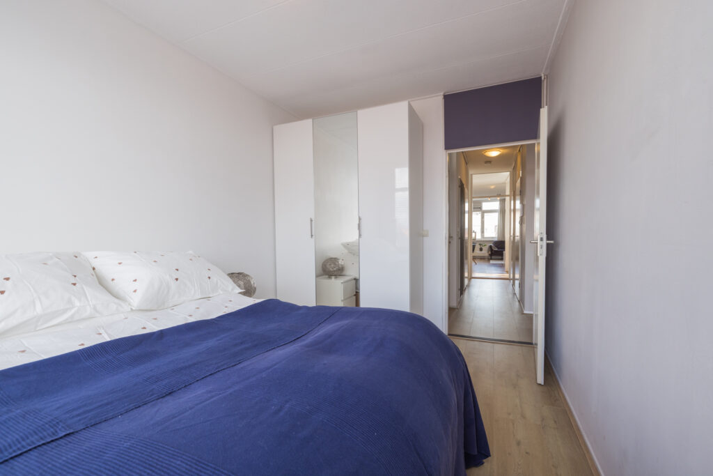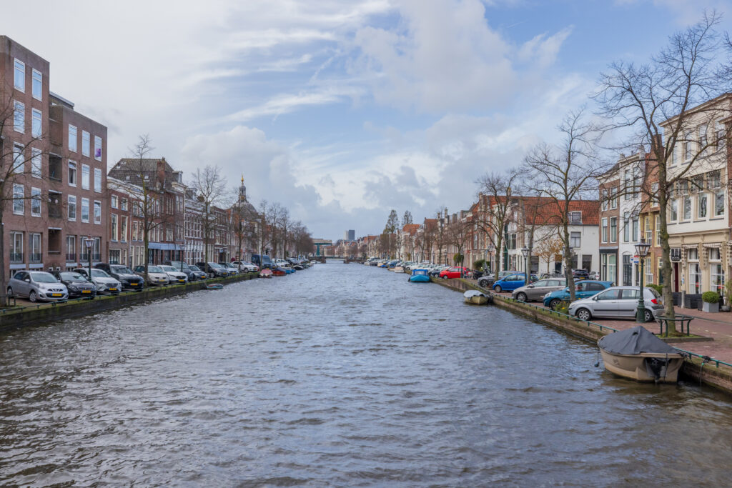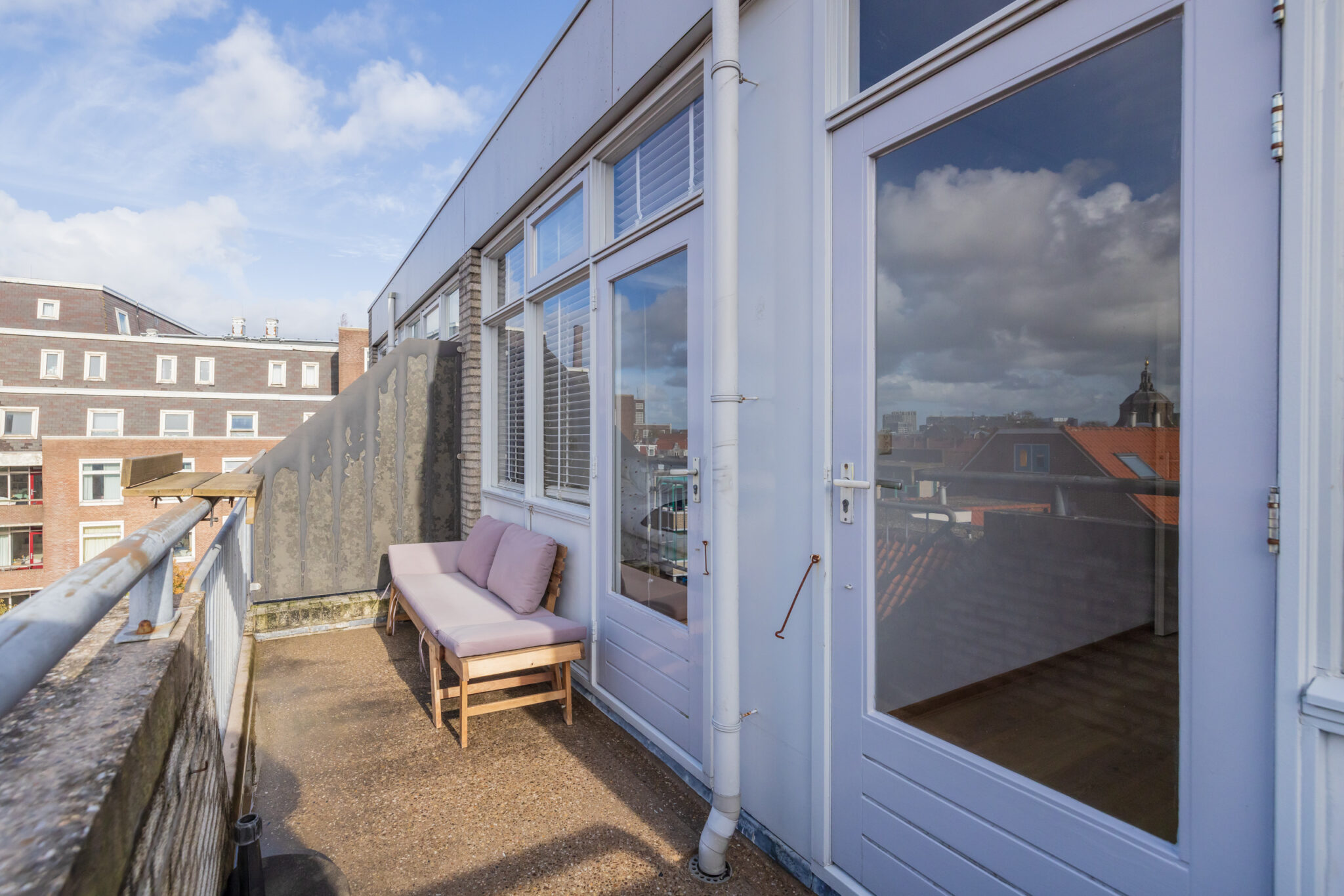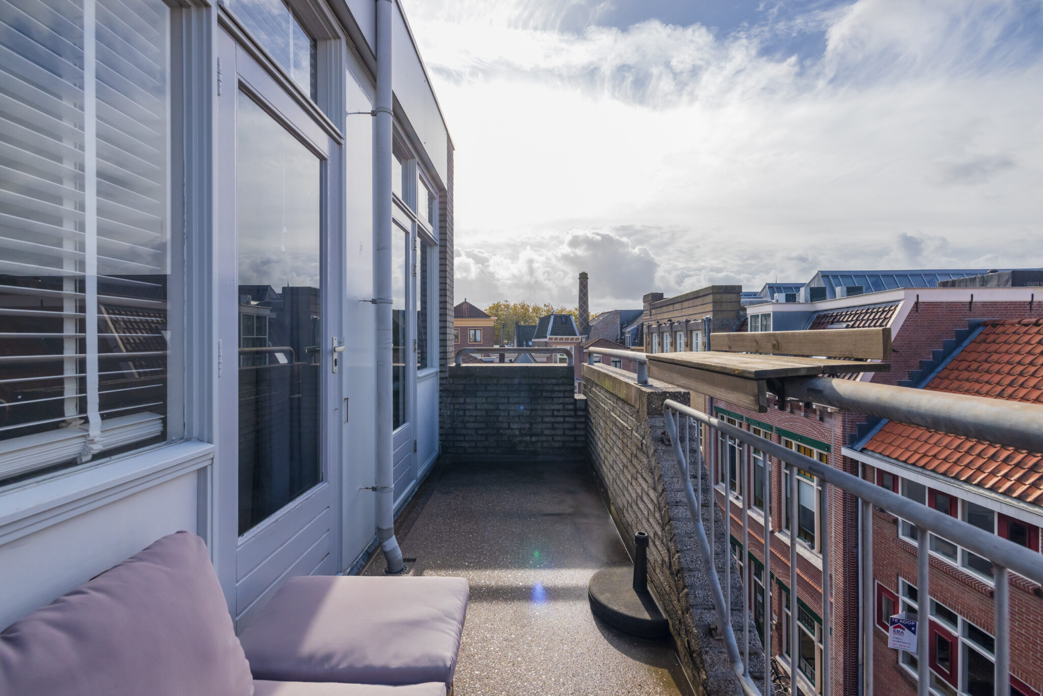 Er zijn twee slaapkamers, beide met een deur naar het balkon. Vanaf hier kijk je uit over de karakteristieke daken van de Leidse binnenstad – een uitzicht dat direct sfeer geeft.