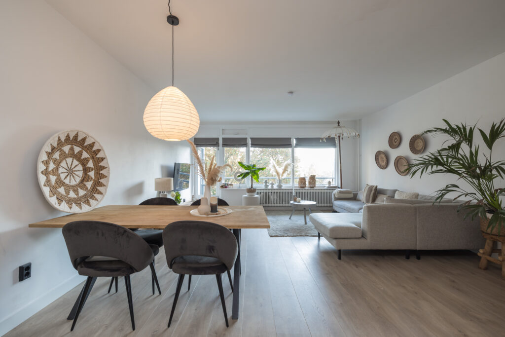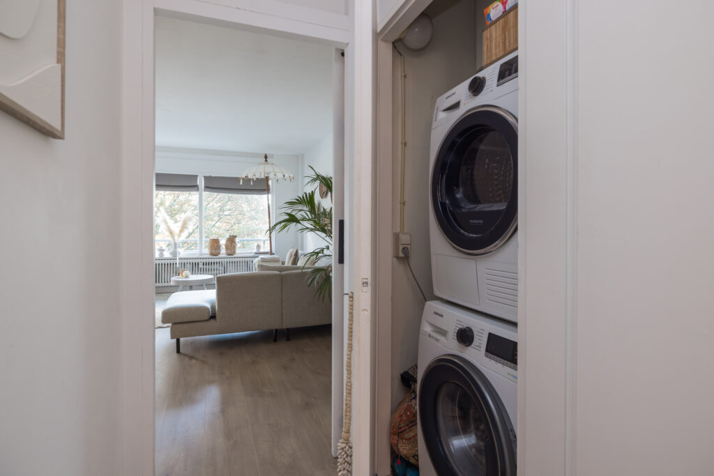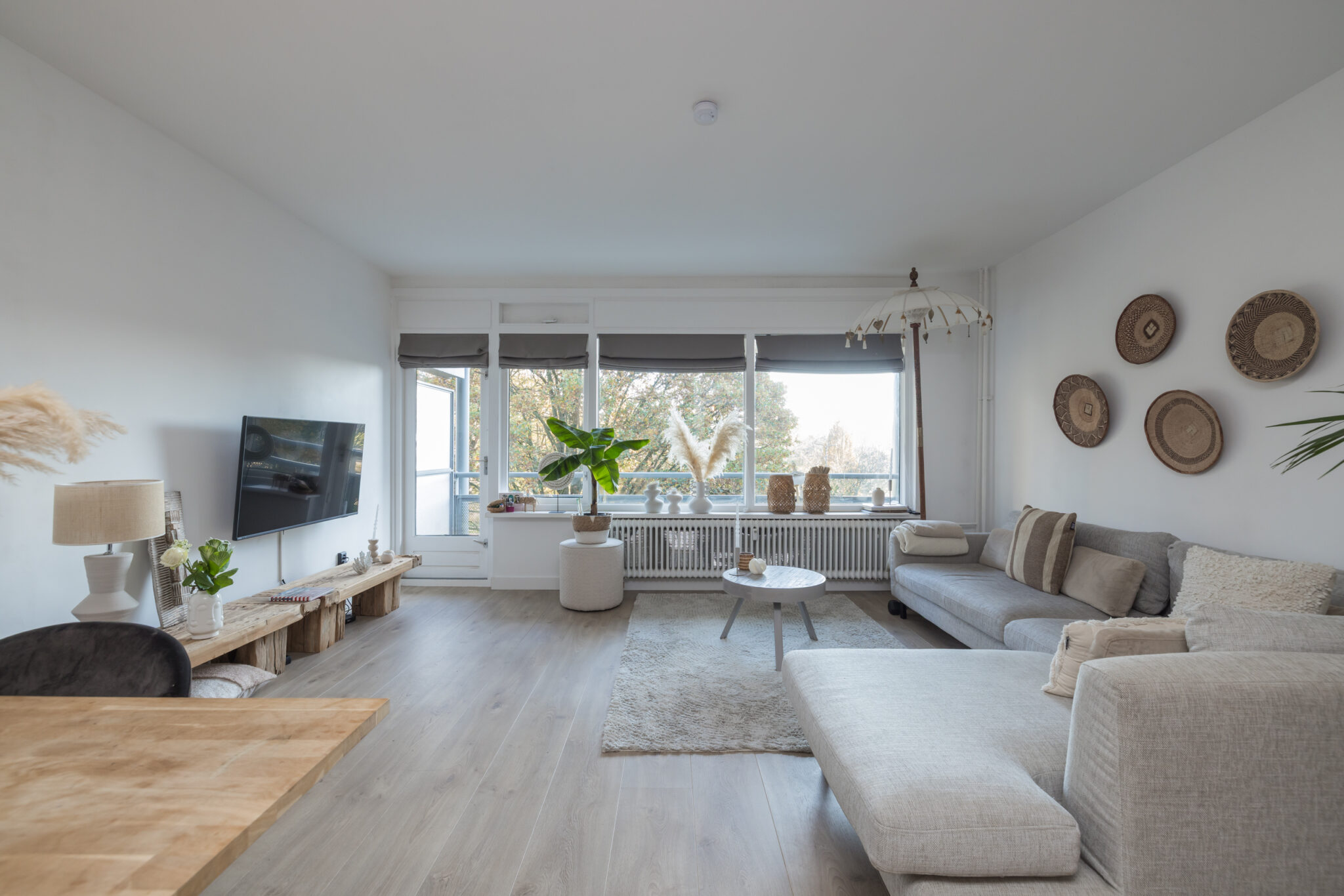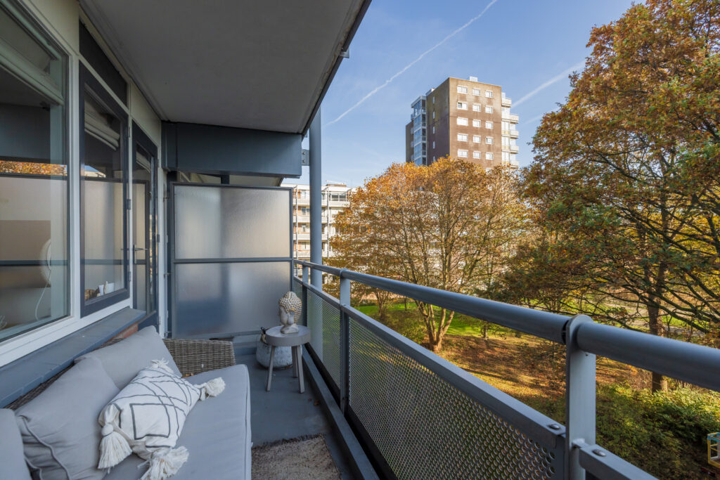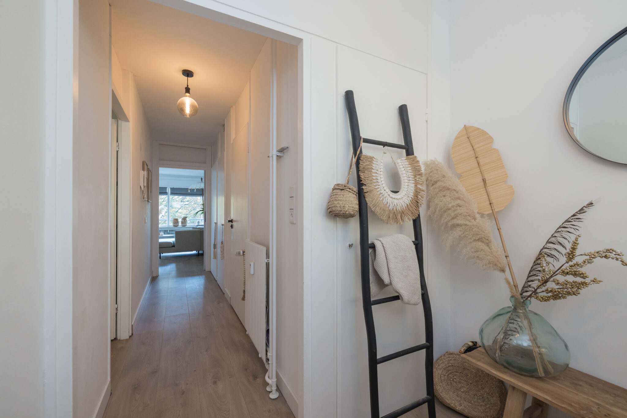 Entree, ruime hal, uitgebreide moderne meterkast (2021) en aansluitend de gang met 2 vaste kasten, waarvan één voorzien van aansluitingen wasapparatuur en elektrische boiler. Ruime woonkamer aan de zonnige zuidoostzijde met grote ramen en moderne laminaatvloer (2021) die drempelloos is aangelegd door het hele appartement. Opvallend zijn tevens de op maat gemaakte barndeur die de hal van de woonkamer scheidt en de fraai gestuukte wanden en plafonds. Het balkon is over de volledige breedte van het appartement gesitueerd, hier zit je midden in het groen en heb je een uitzicht richting het park “De Houtkamp”.