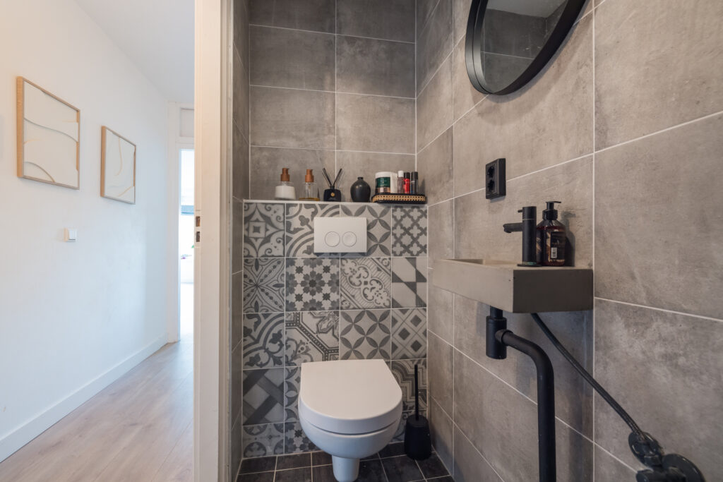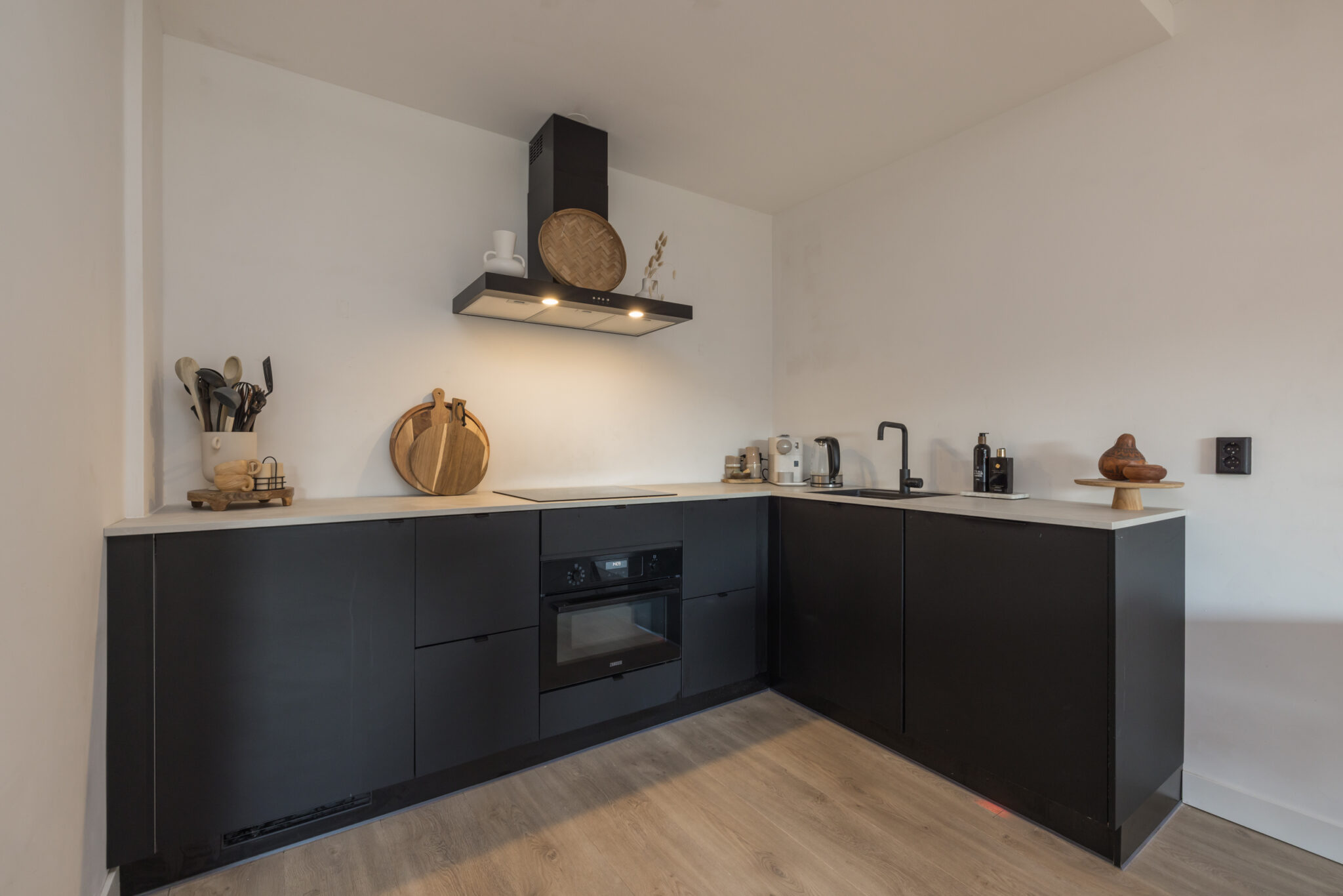 De open keuken uit 2022 is luxe uitgevoerd, voorzien van composieten aanrechtblad en diverse inbouwapparatuur zoals een inductiekookplaat en afzuigkap, koelkast met vriesvak, combimagnetron en een vaatwasser. De ruime slaapkamer van 4,30 x 2,76 meter bevindt zich aan de voorzijde en heeft een handige indeling waardoor u achter de deur kledingkasten over de volledige breedte kwijt kunt. De badkamer uit 2021 is fraai betegeld, voorzien van regendouche, modern vrijhangend toilet, wastafel met spiegel en mechanische ventilatie.