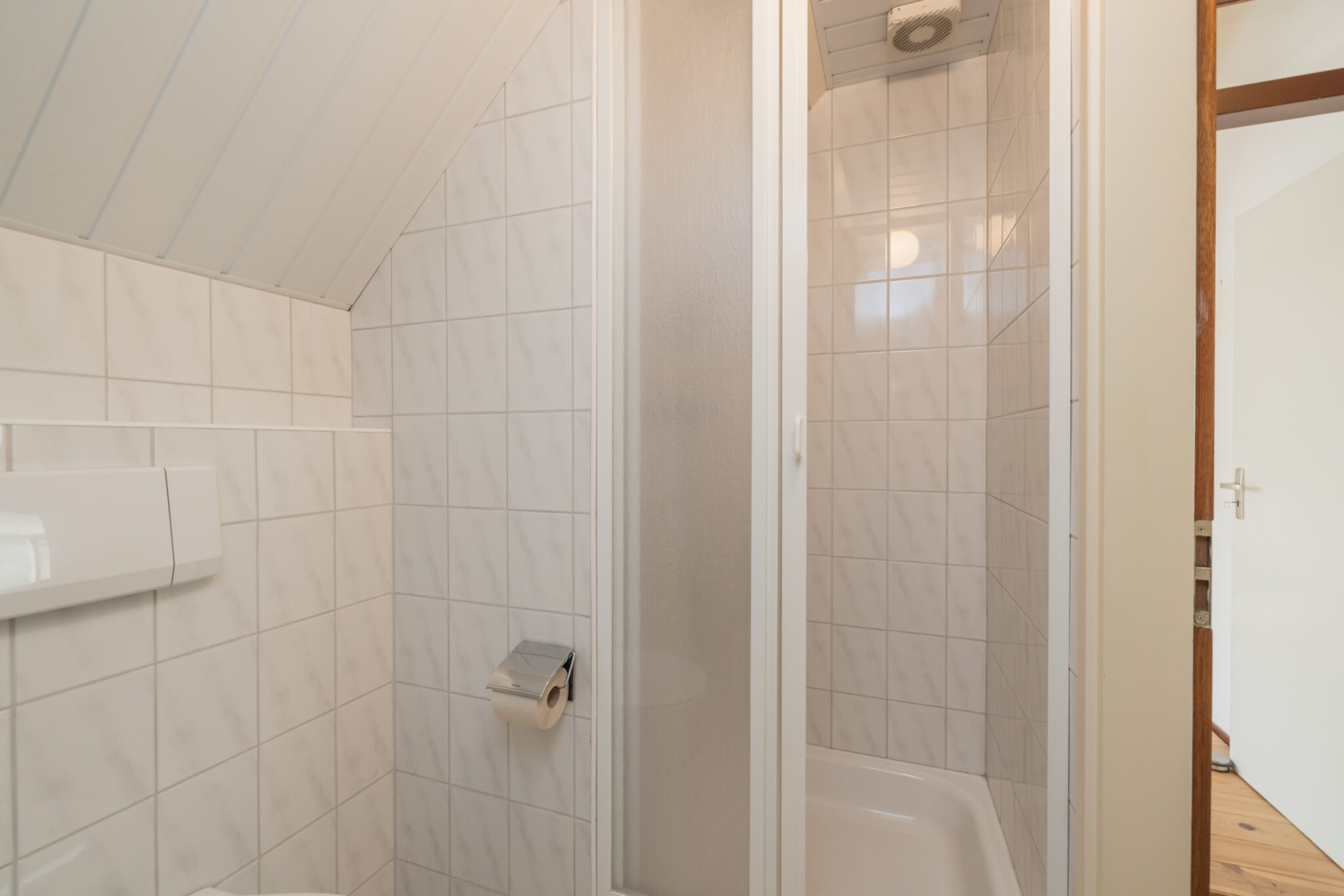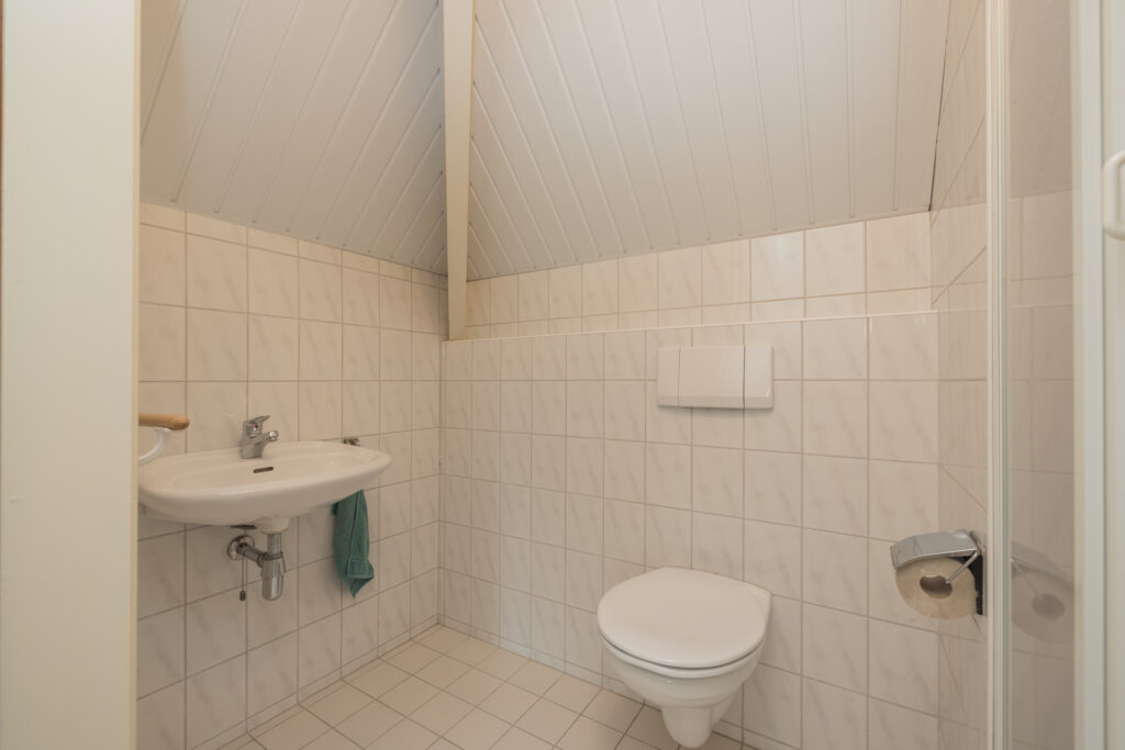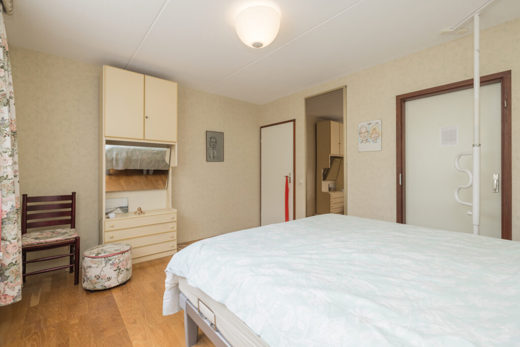 Achterin de woning ligt de grote hoofdslaapkamer met ruime inloopkast en eigen badkamer, voorzien van douchecabine, toilet en wastafelmeubel.