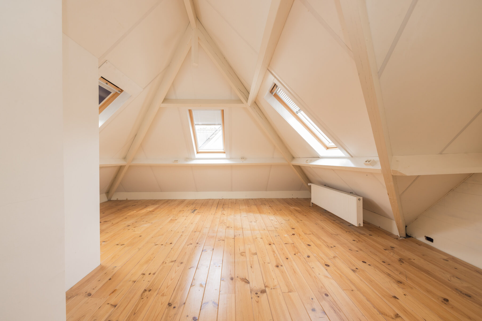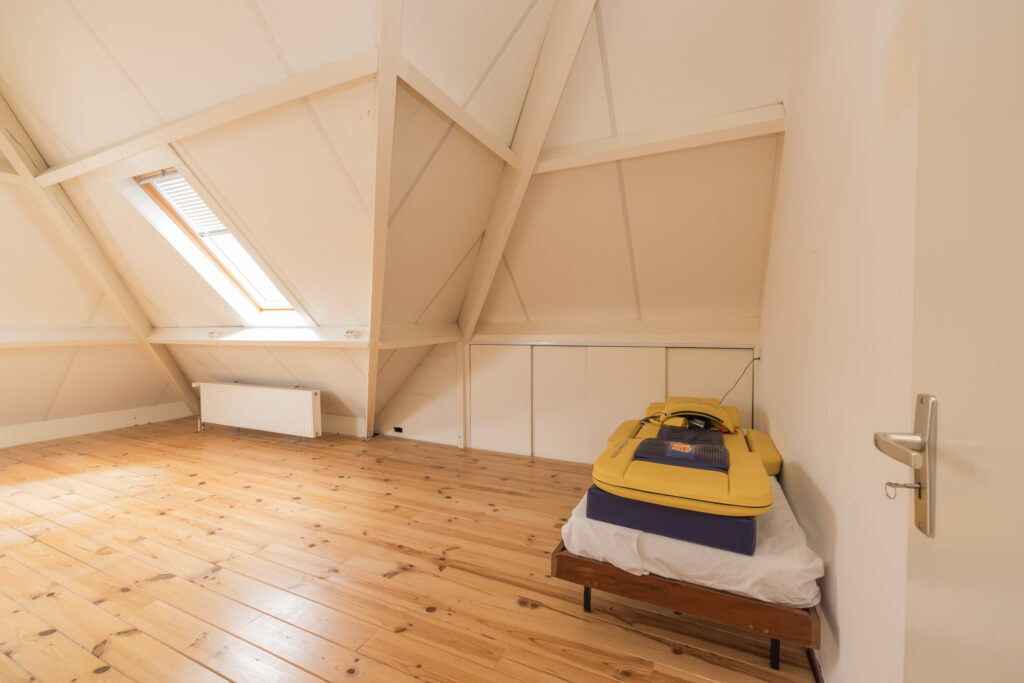 Kleine overloop, royale slaapkamer met dakkapel, tweede badkamer met douchecabine, wastafel en toilet, en een extra zeer ruime slaapkamer.