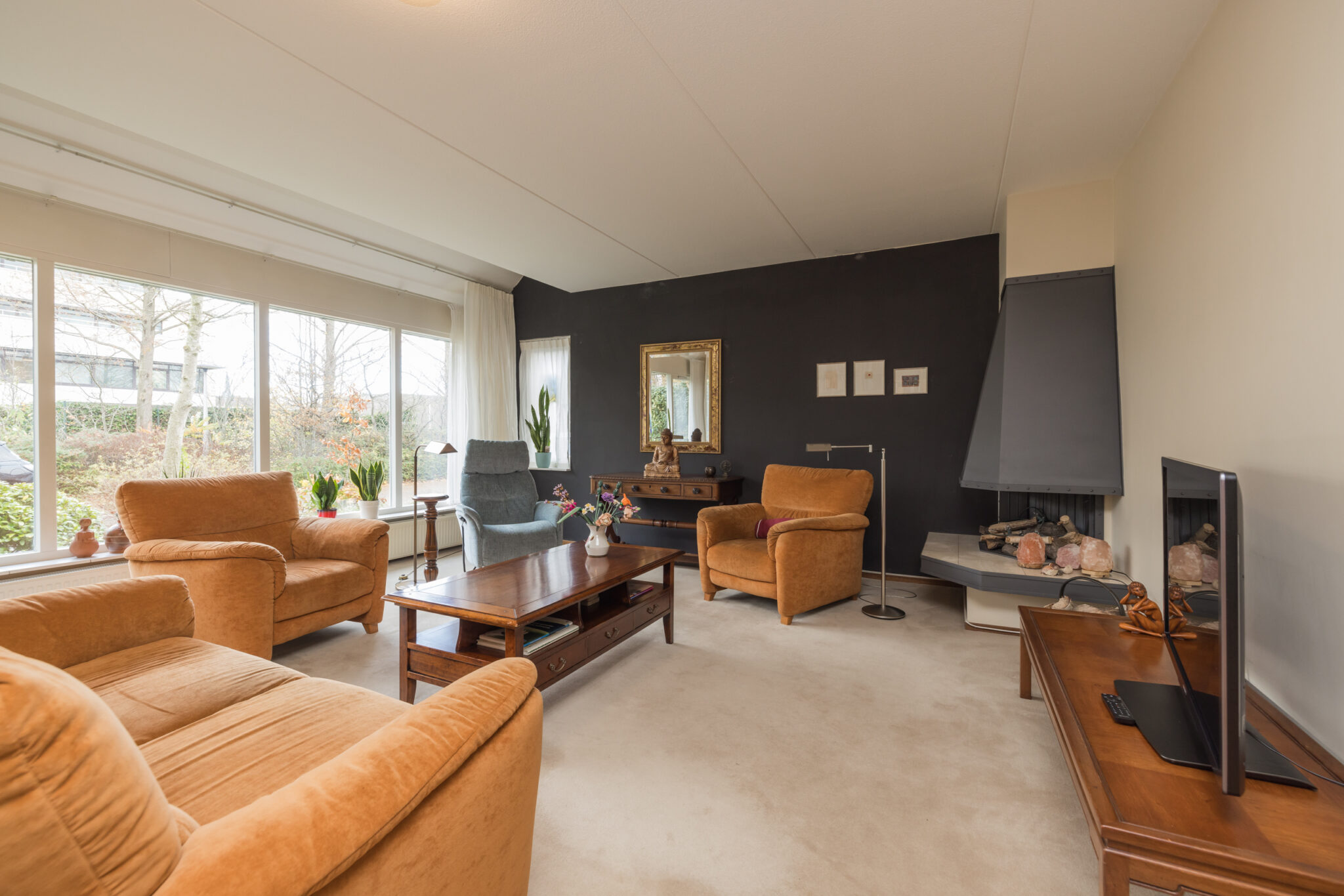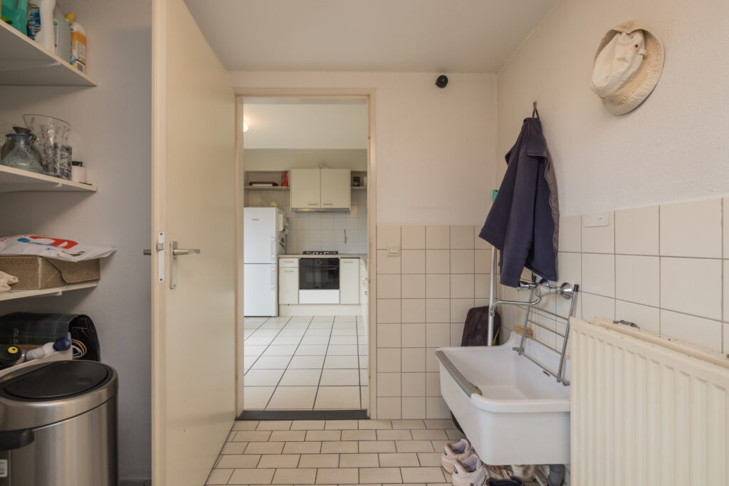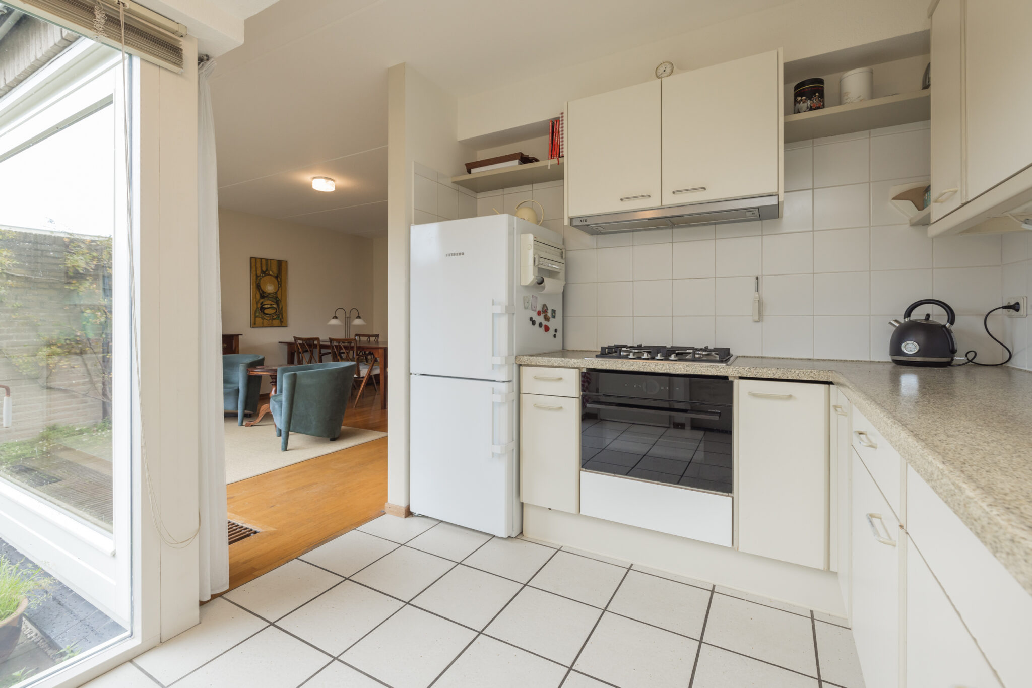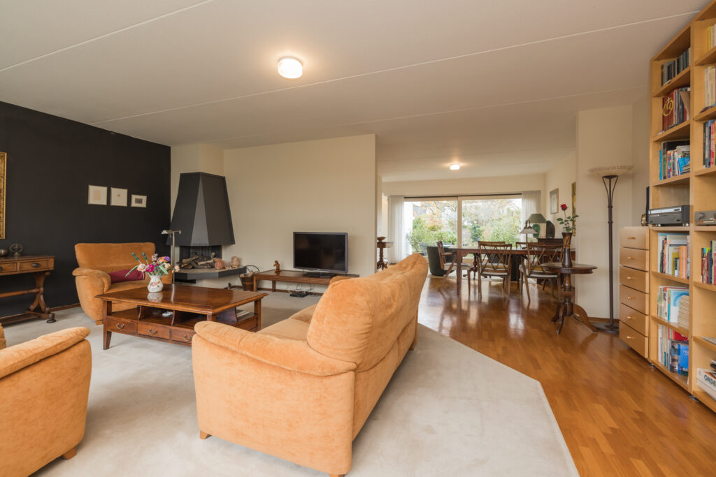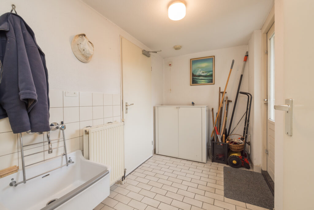 Entree, hal, vernieuwde meterkast en toiletruimte met toilet en fonteintje. Ruime L-vormige woonkamer met veel lichtinval, open haard en een prettig uitzicht op de tuin. Aansluitend een open keuken met toegang tot bijkeuken met aansluitingen ten behoeve van wasapparatuur. Vanuit deze bijkeuken is er toegang tot de achtertuin en tot de voormalige garage, die is omgebouwd tot een praktische berging en extra werkruimte – ideaal voor kantoor of hobby, maar eenvoudig weer als garage te gebruiken.