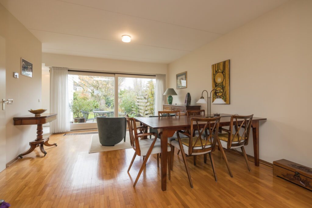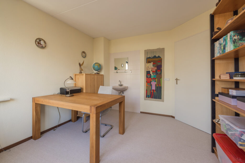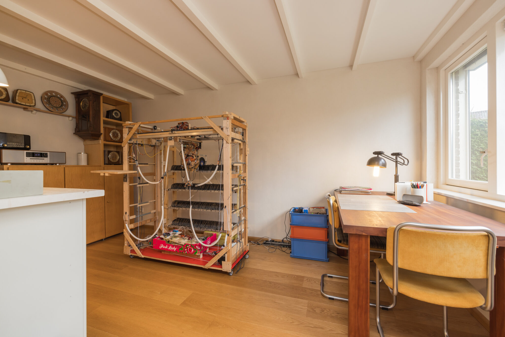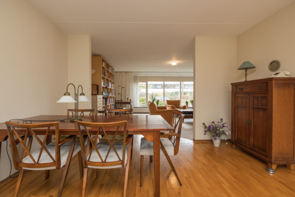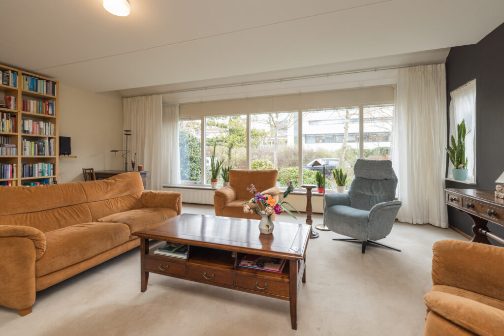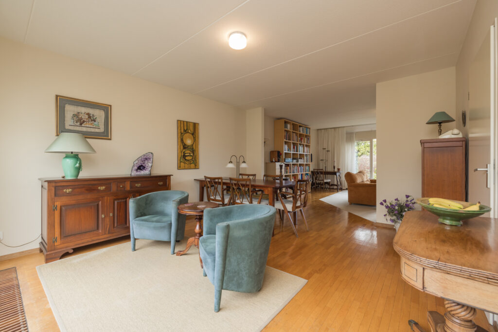 Entree, hal, vernieuwde meterkast en toiletruimte met toilet en fonteintje. Ruime L-vormige woonkamer met veel lichtinval, open haard en een prettig uitzicht op de tuin. Aansluitend een open keuken met toegang tot bijkeuken met aansluitingen ten behoeve van wasapparatuur. Vanuit deze bijkeuken is er toegang tot de achtertuin en tot de voormalige garage, die is omgebouwd tot een praktische berging en extra werkruimte – ideaal voor kantoor of hobby, maar eenvoudig weer als garage te gebruiken.