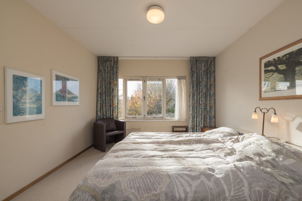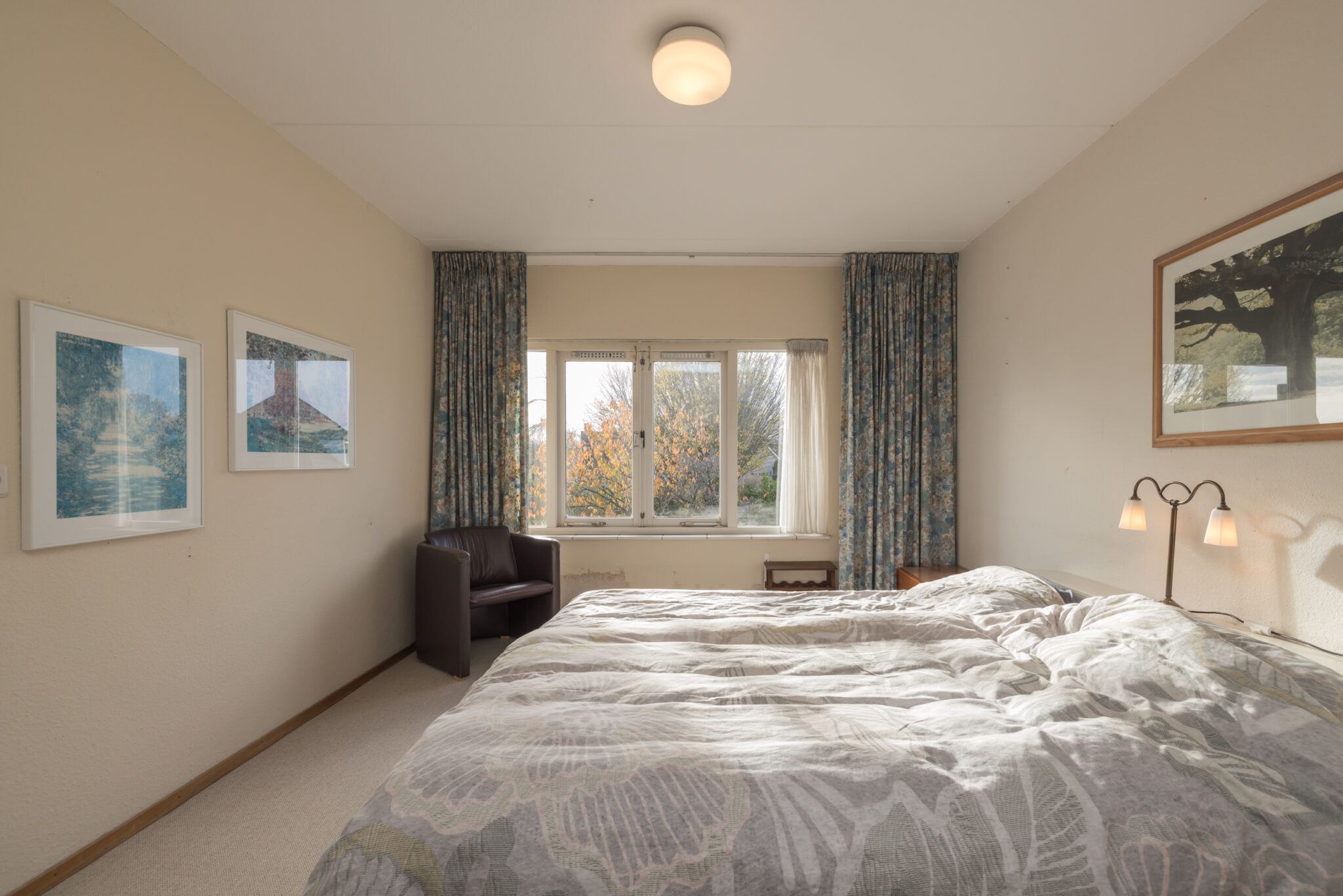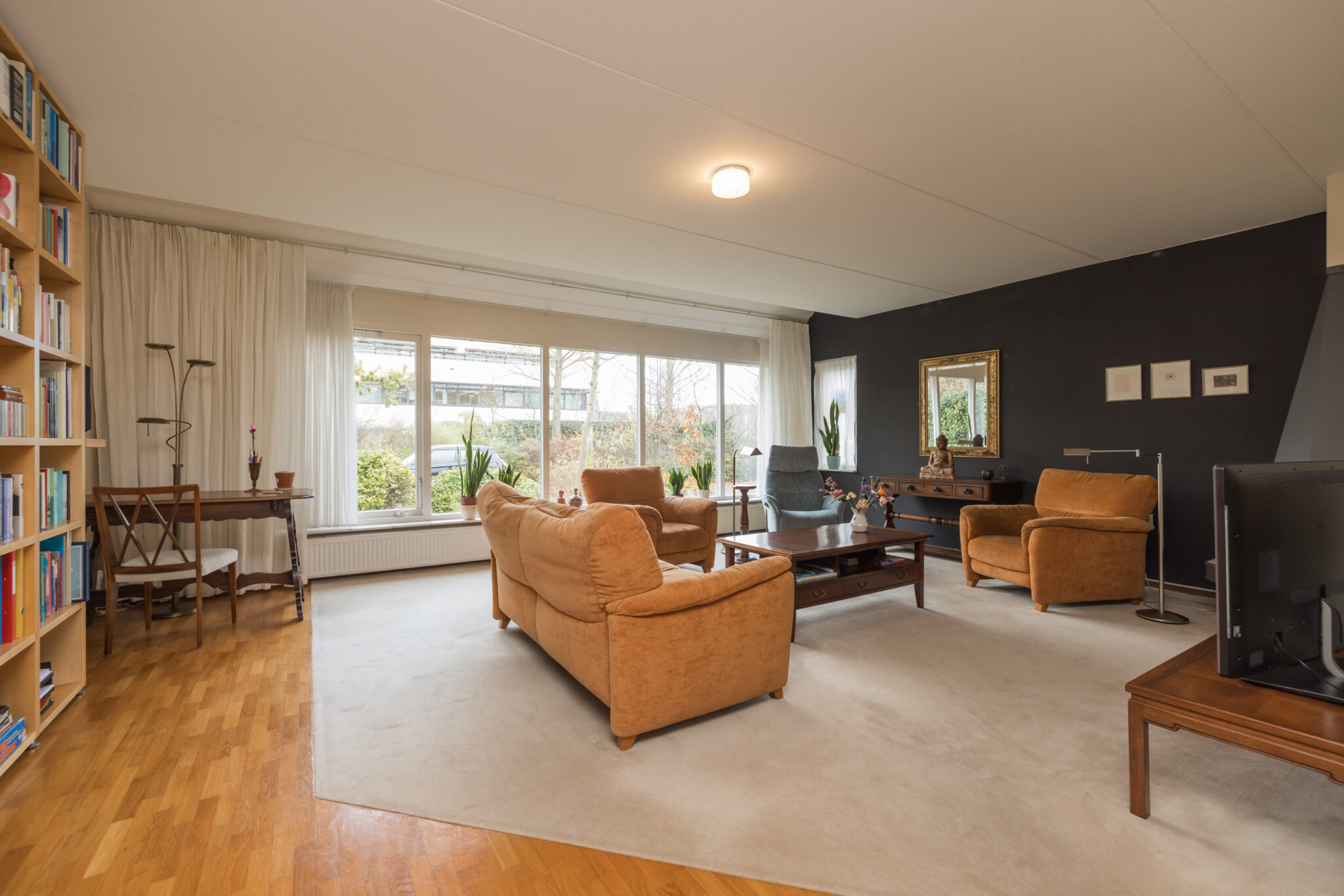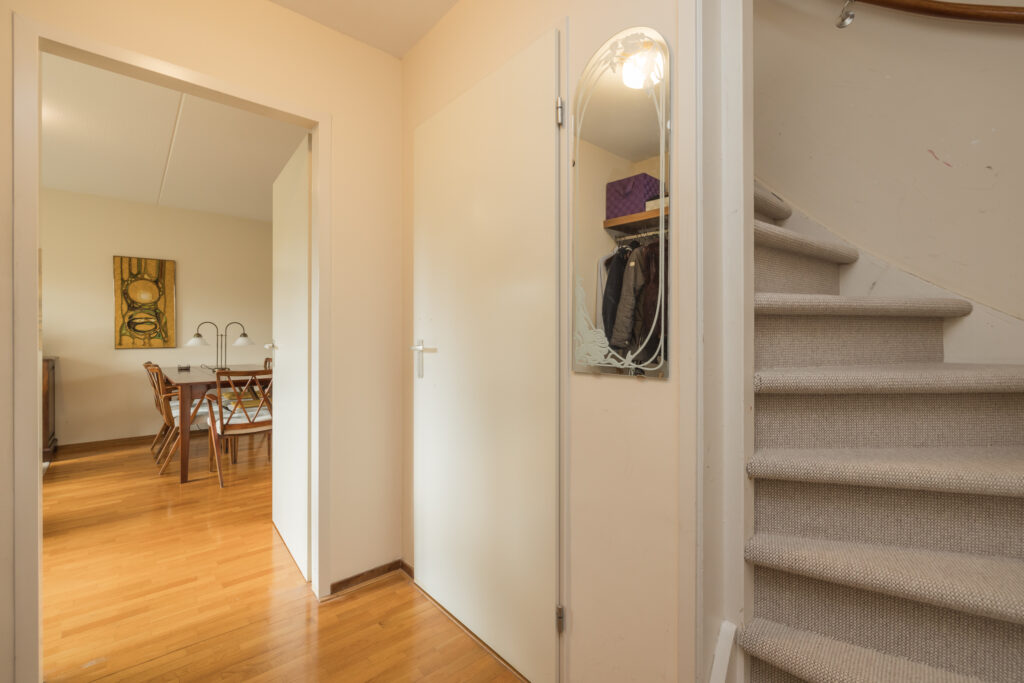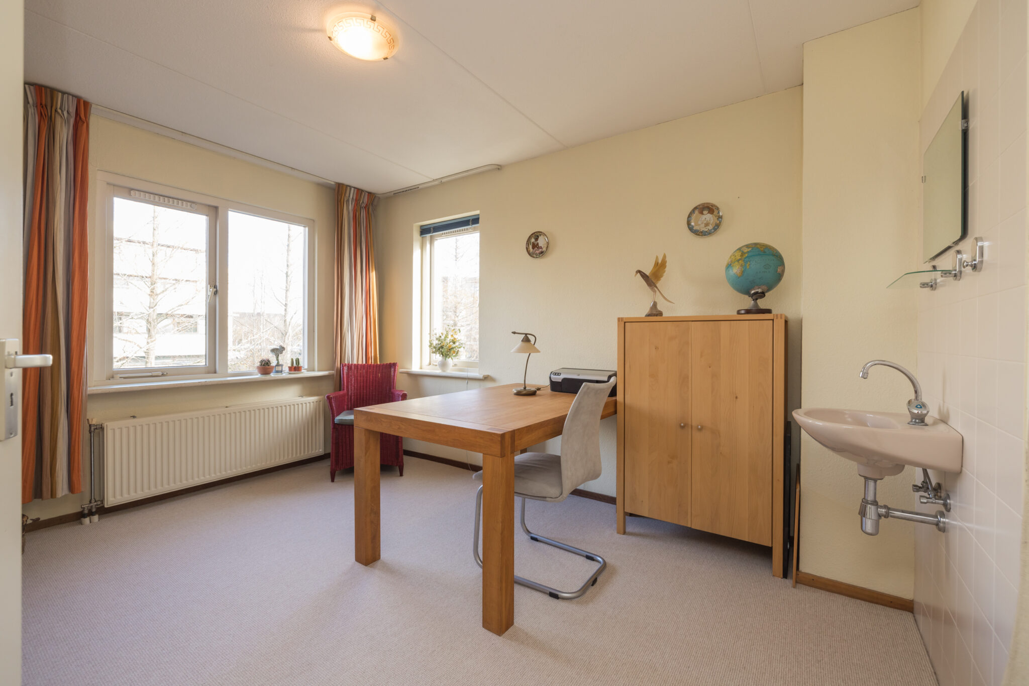 Entree, hal, vernieuwde meterkast en toiletruimte met toilet en fonteintje. Ruime L-vormige woonkamer met veel lichtinval, open haard en een prettig uitzicht op de tuin. Aansluitend een open keuken met toegang tot bijkeuken met aansluitingen ten behoeve van wasapparatuur. Vanuit deze bijkeuken is er toegang tot de achtertuin en tot de voormalige garage, die is omgebouwd tot een praktische berging en extra werkruimte – ideaal voor kantoor of hobby, maar eenvoudig weer als garage te gebruiken.