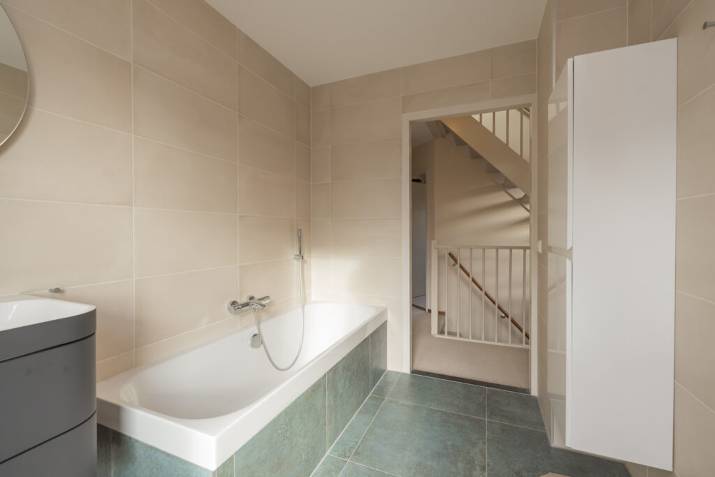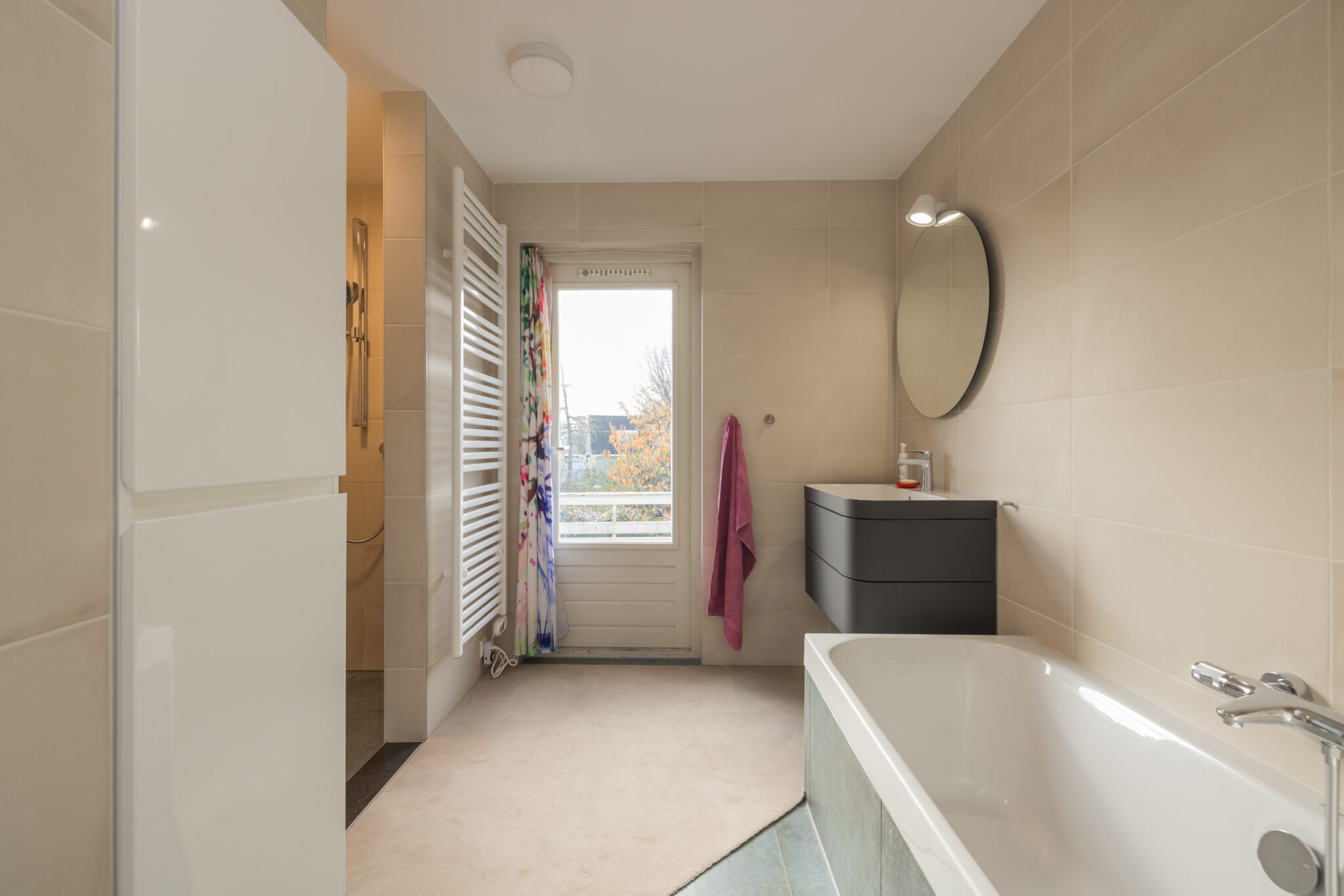 Overloop met drie ruime slaapkamers en een badkamer voorzien van wastafel, ligbad, en douche, toegang tot het dakterras. Separaat tweede toilet.