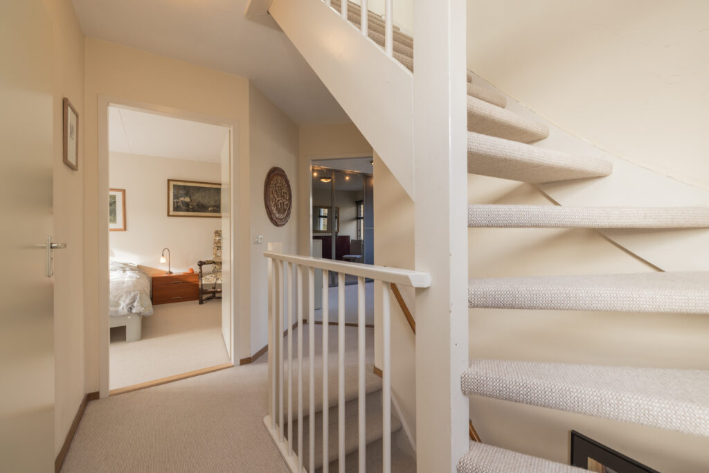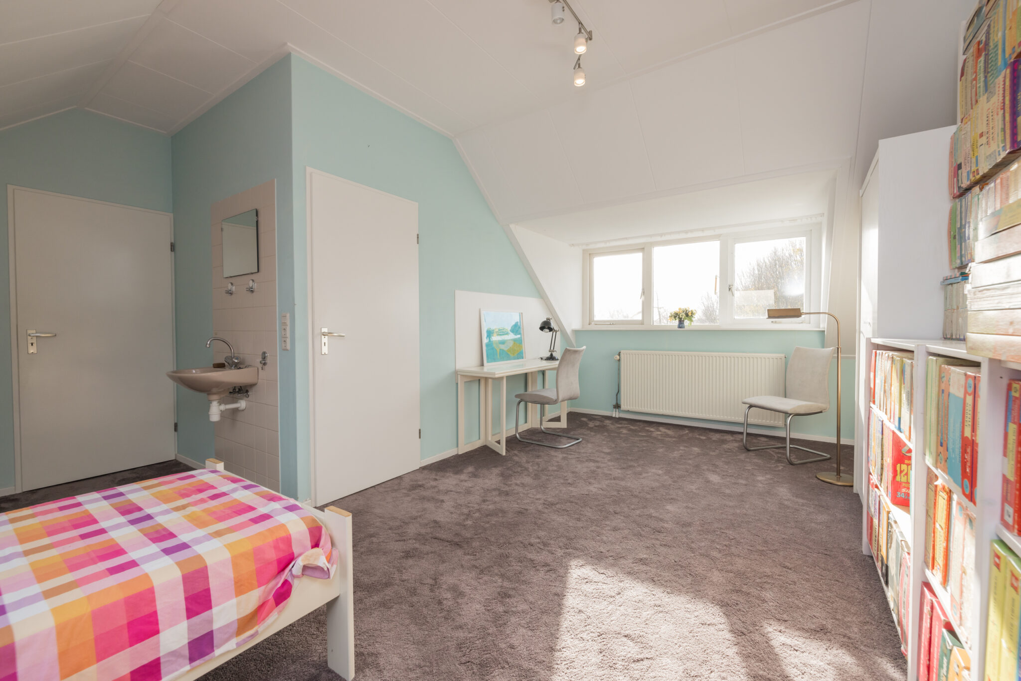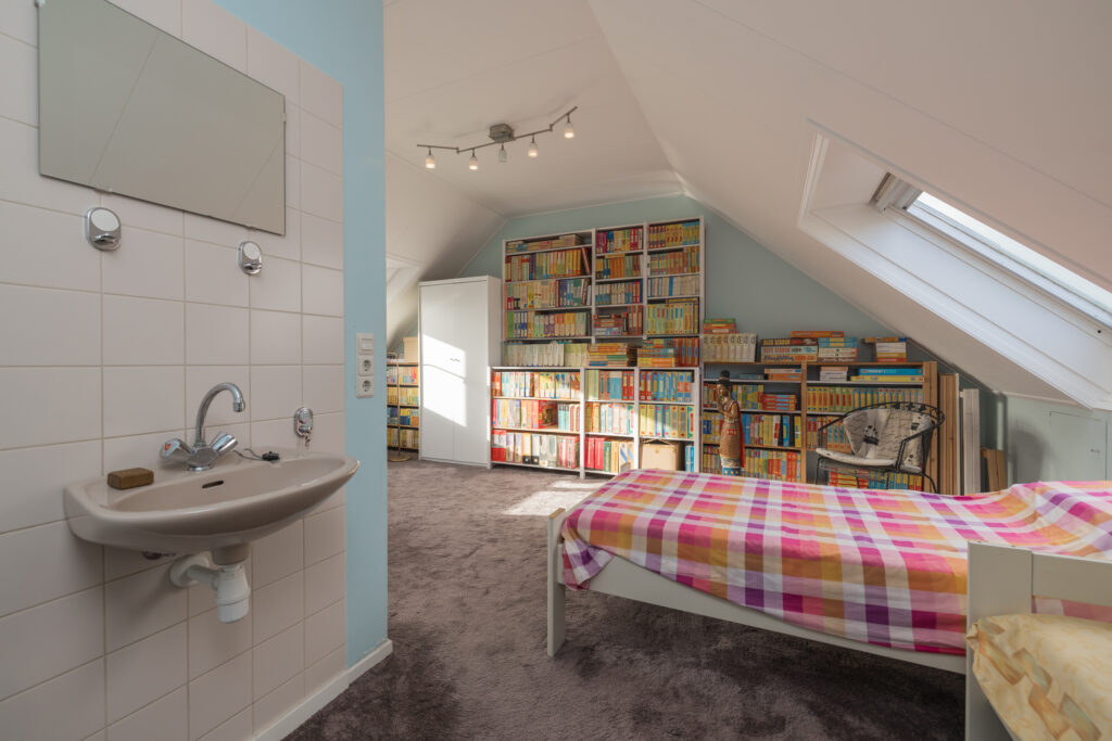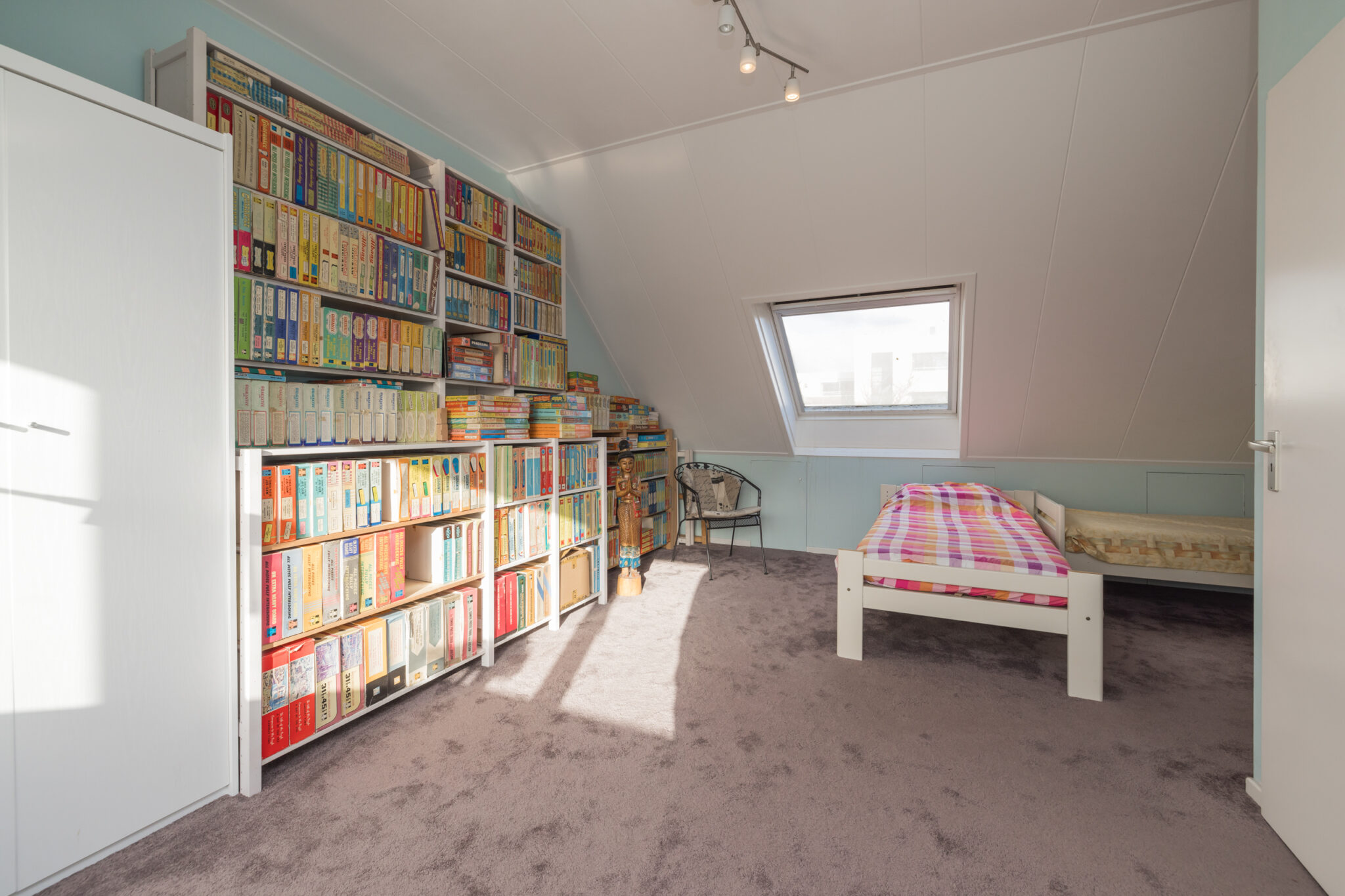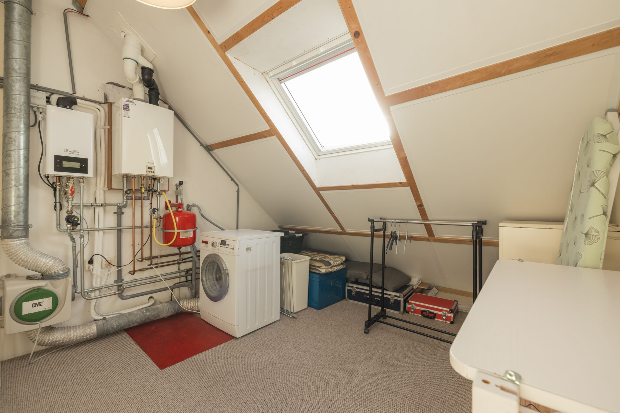 Overloop met opstelling CV combiketel (Remeha 2016), mechanische ventilatie en warmtepomp (bouwjaar 2024, buitenunit staat op de garage). Vierde slaapkamer met dakraam en een aparte bergruimte met omvormer voor de zonnepanelen.