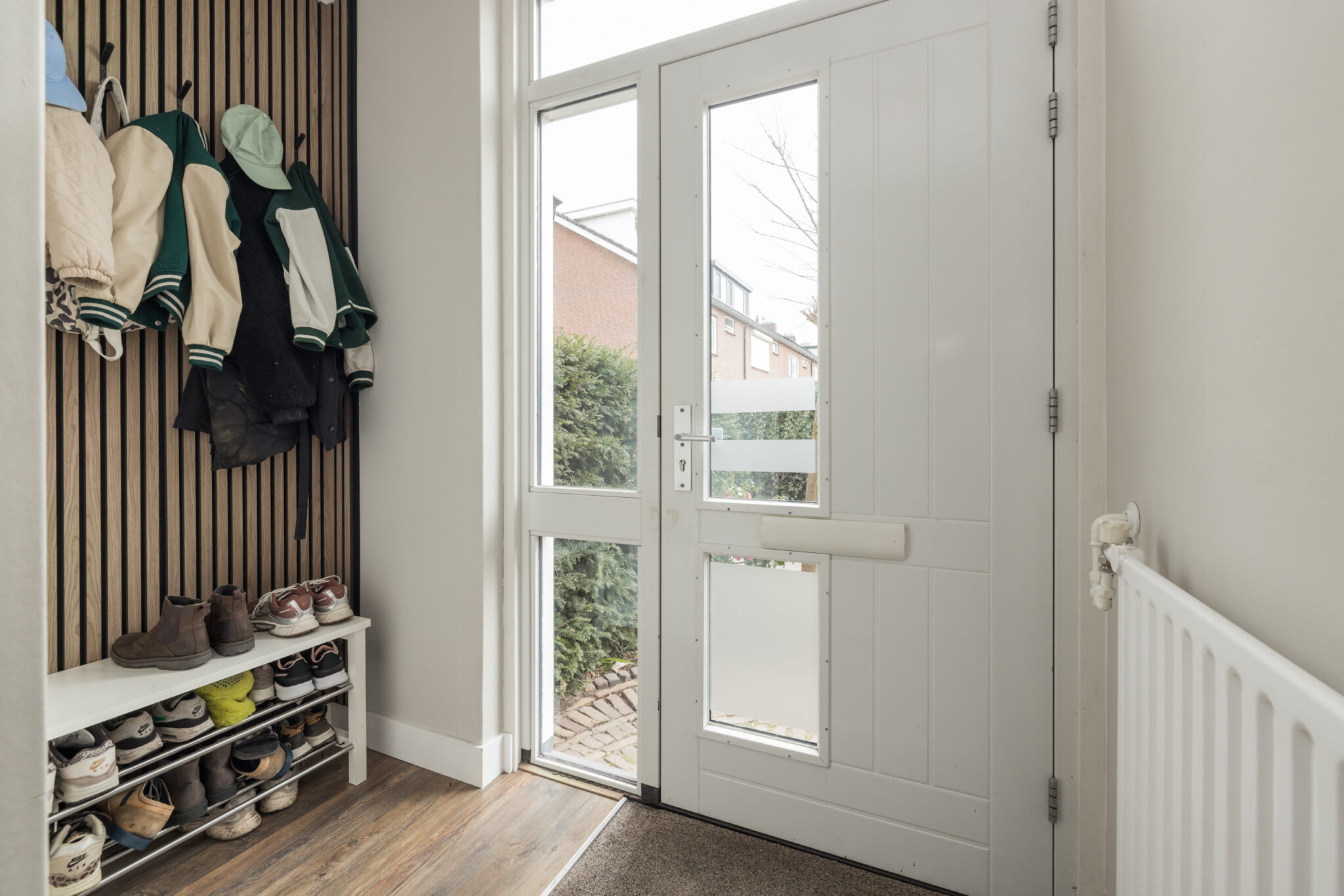 Via de voortuin kom je binnen in de ruime hal met garderobe, meterkast, apart toilet en een praktische bergkast. Vanuit hier heb je toegang tot de woonkamer en de trap naar boven.