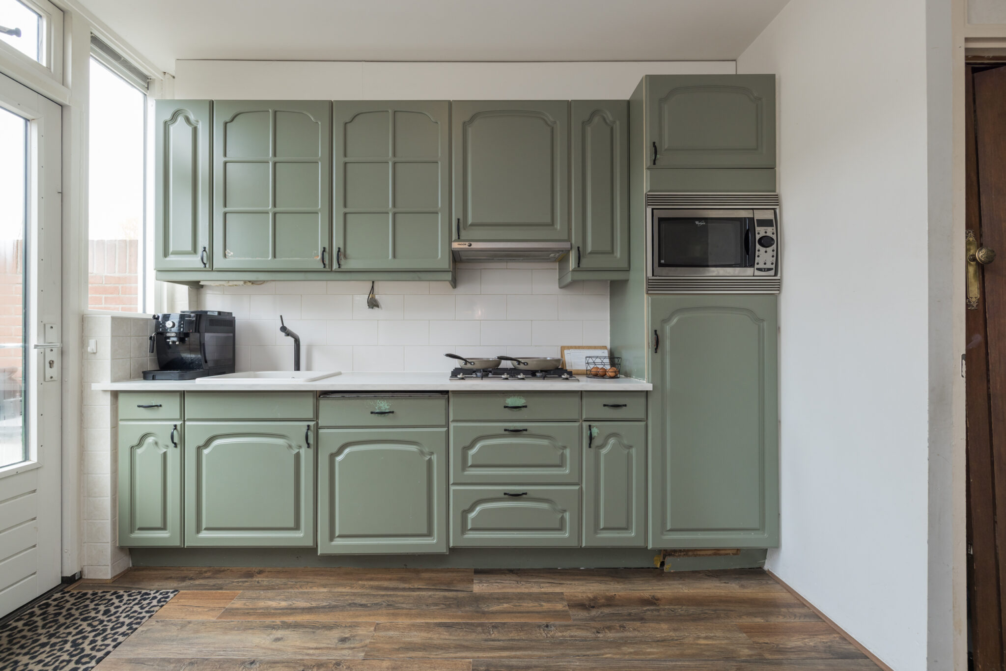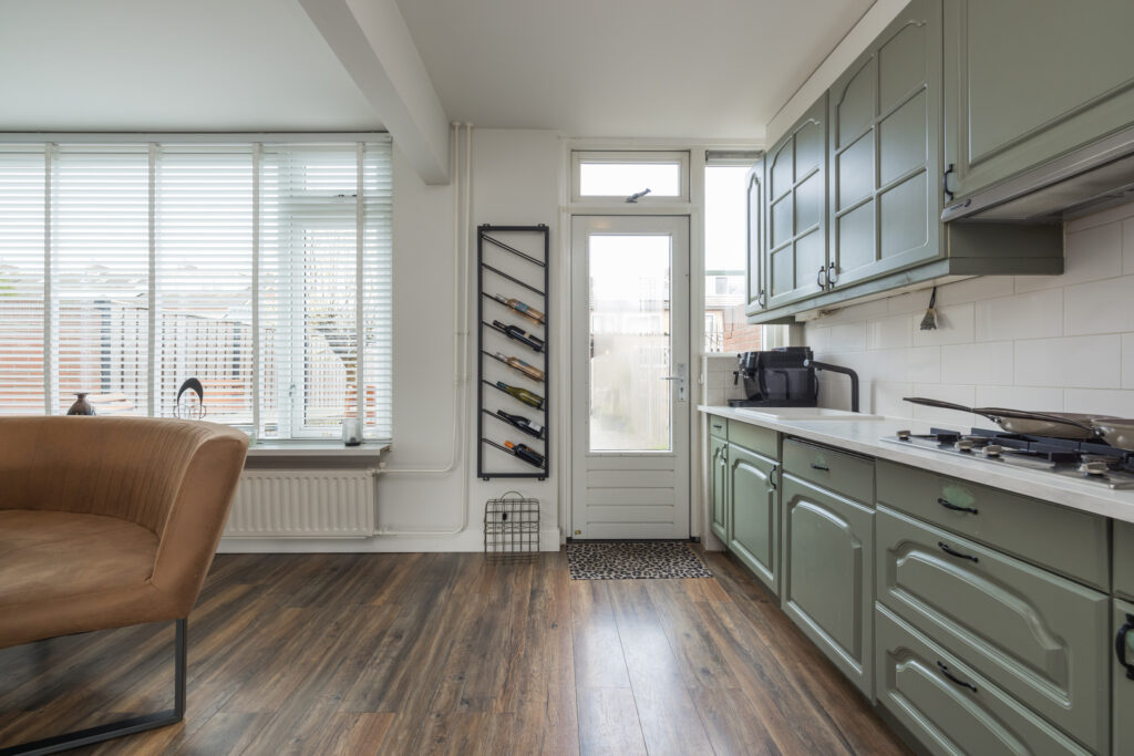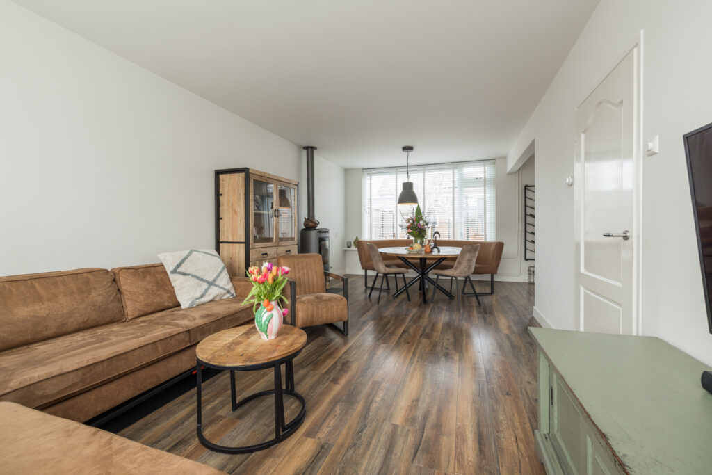 De woonkamer is opvallend ruim voor dit type woning en heeft een prettige lichtinval dankzij de grote raampartijen. Er is voldoende plek voor een gezellige zithoek én een ruime eethoek. De keuken bevindt zich aan de zijkant van de woonkamer. Deze is eenvoudig en aan vervanging toe, maar biedt juist de kans om hier jouw droomkeuken te realiseren. Naast de keuken zit nog een extra bergkast en via de achterdeur loop je zo de tuin in.