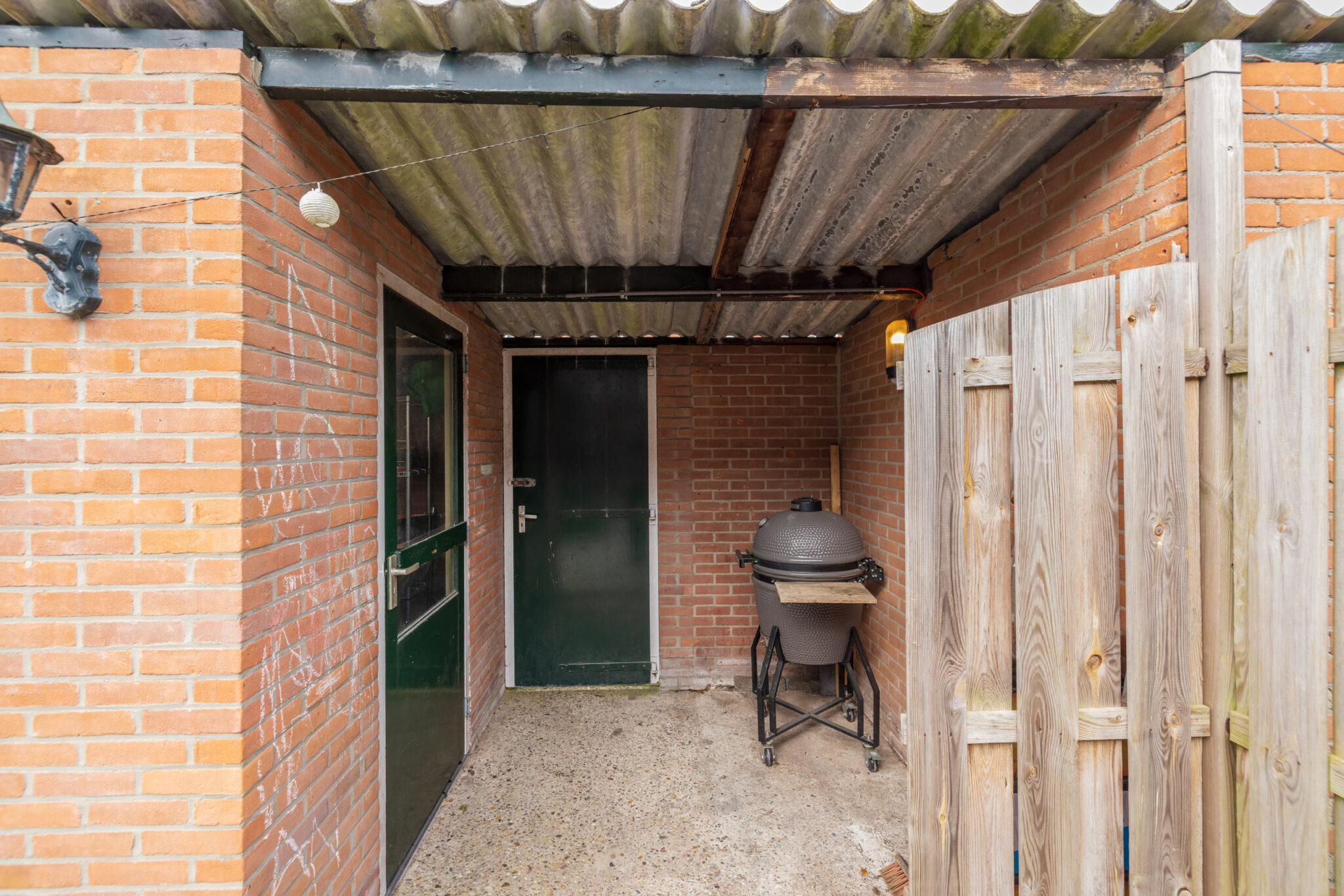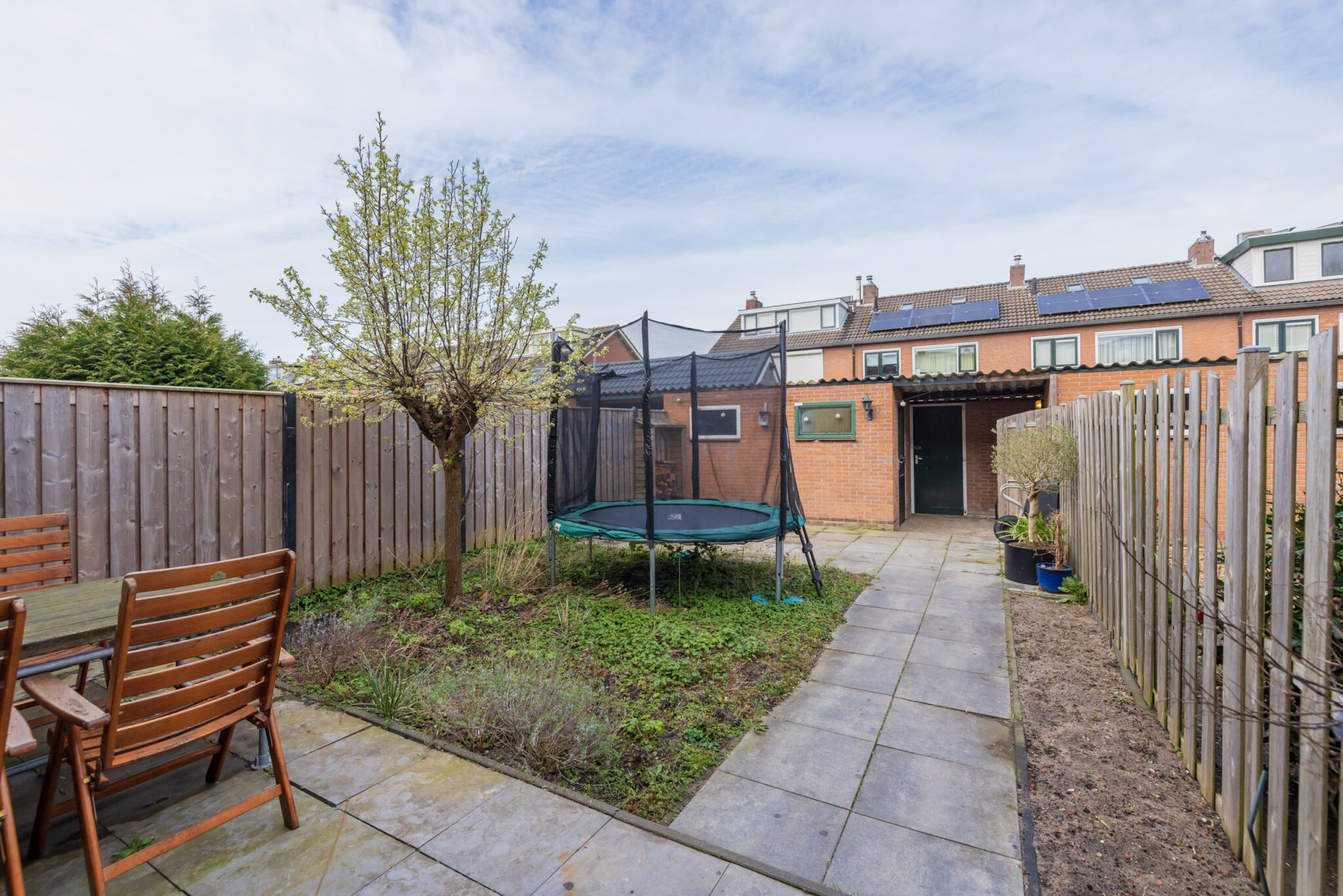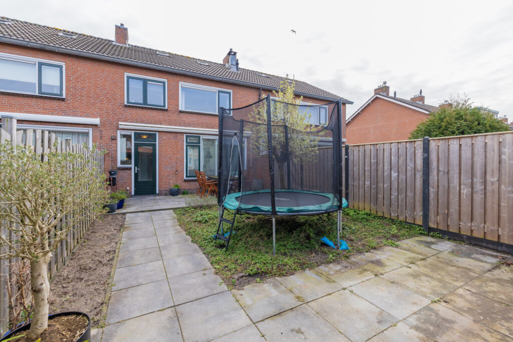 De achtertuin is ruim en biedt volop mogelijkheden om er een fijne buitenplek van te maken. Achterin vind je een grote stenen berging, ideaal voor fietsen en opslag, met daarnaast een overkapping. Ook is er een handige achterom aanwezig.