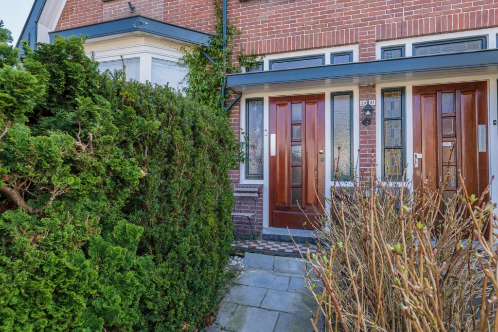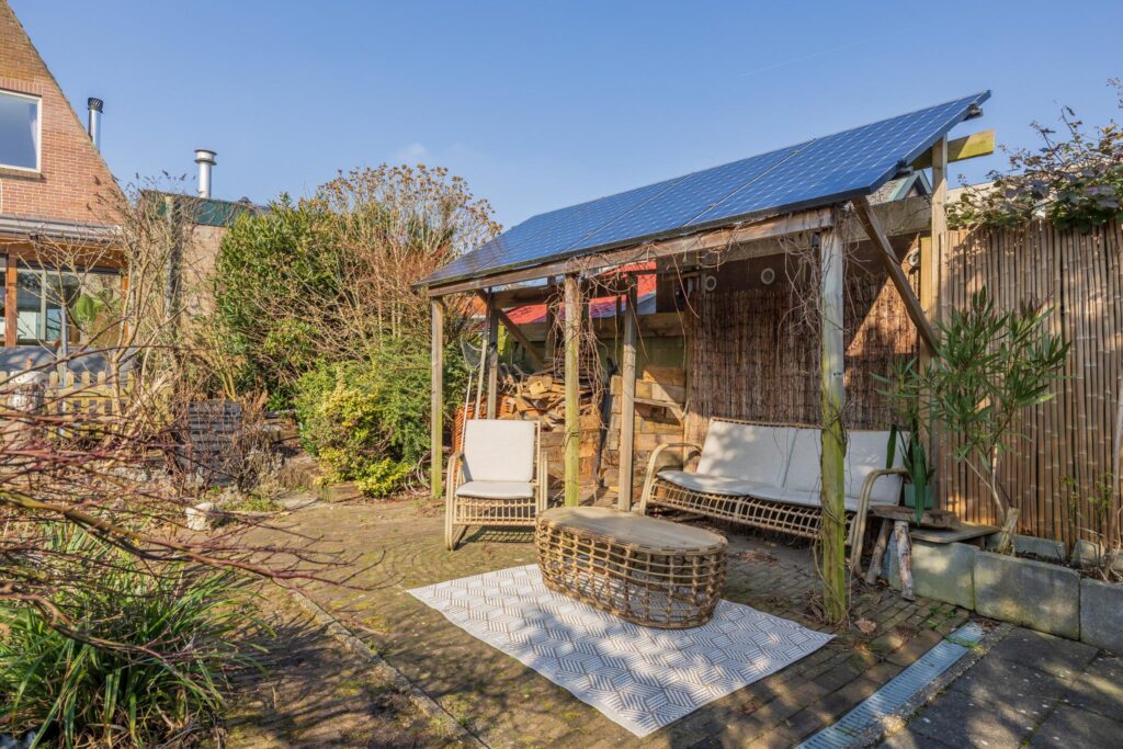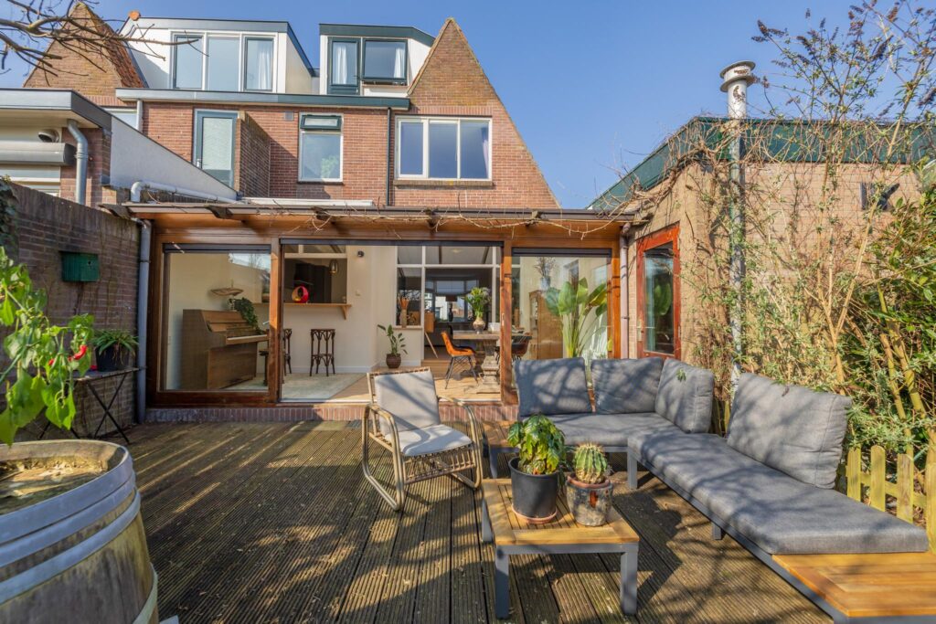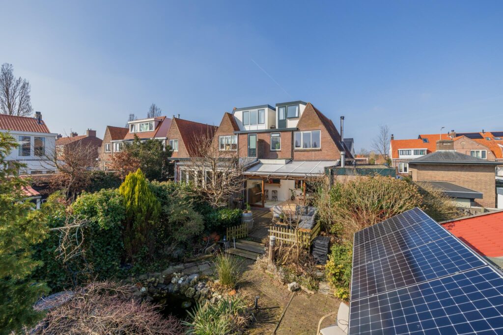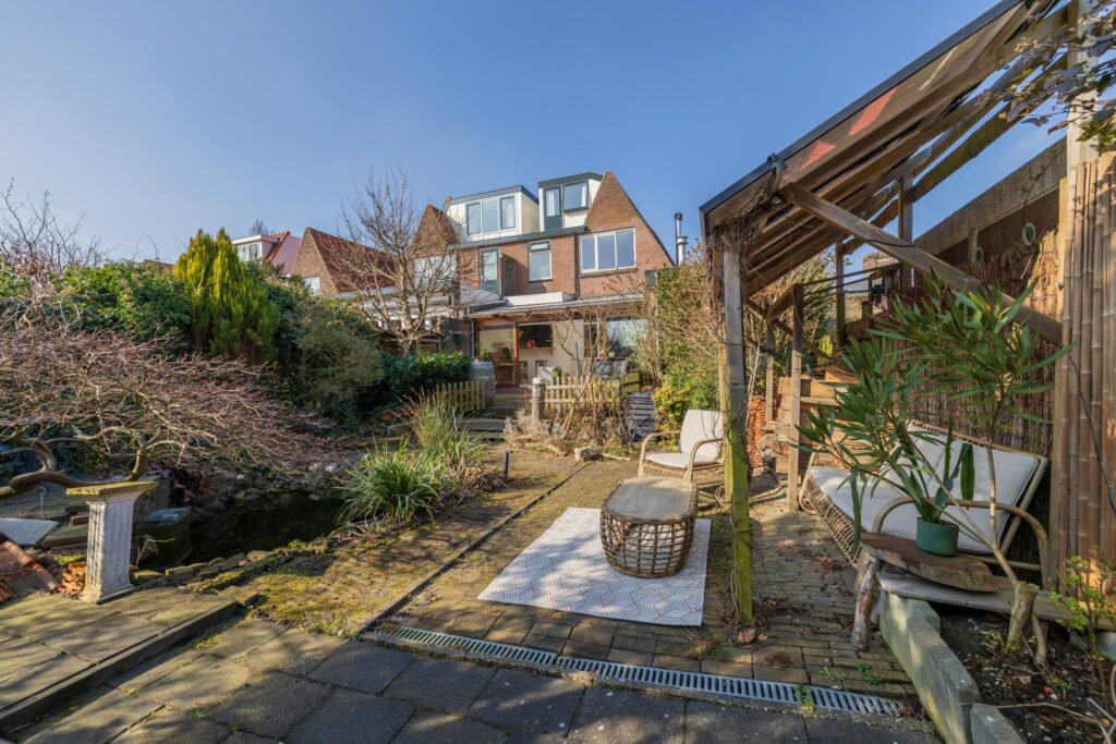 De achtertuin is een van de grote pluspunten van deze woning. Het achterterras sluit aan op de serre en biedt uitzicht op de diepe, fraai aangelegde tuin met een kleine overkapping en houthok. De tuin biedt volop privacy en ruimte voor ontspanning.