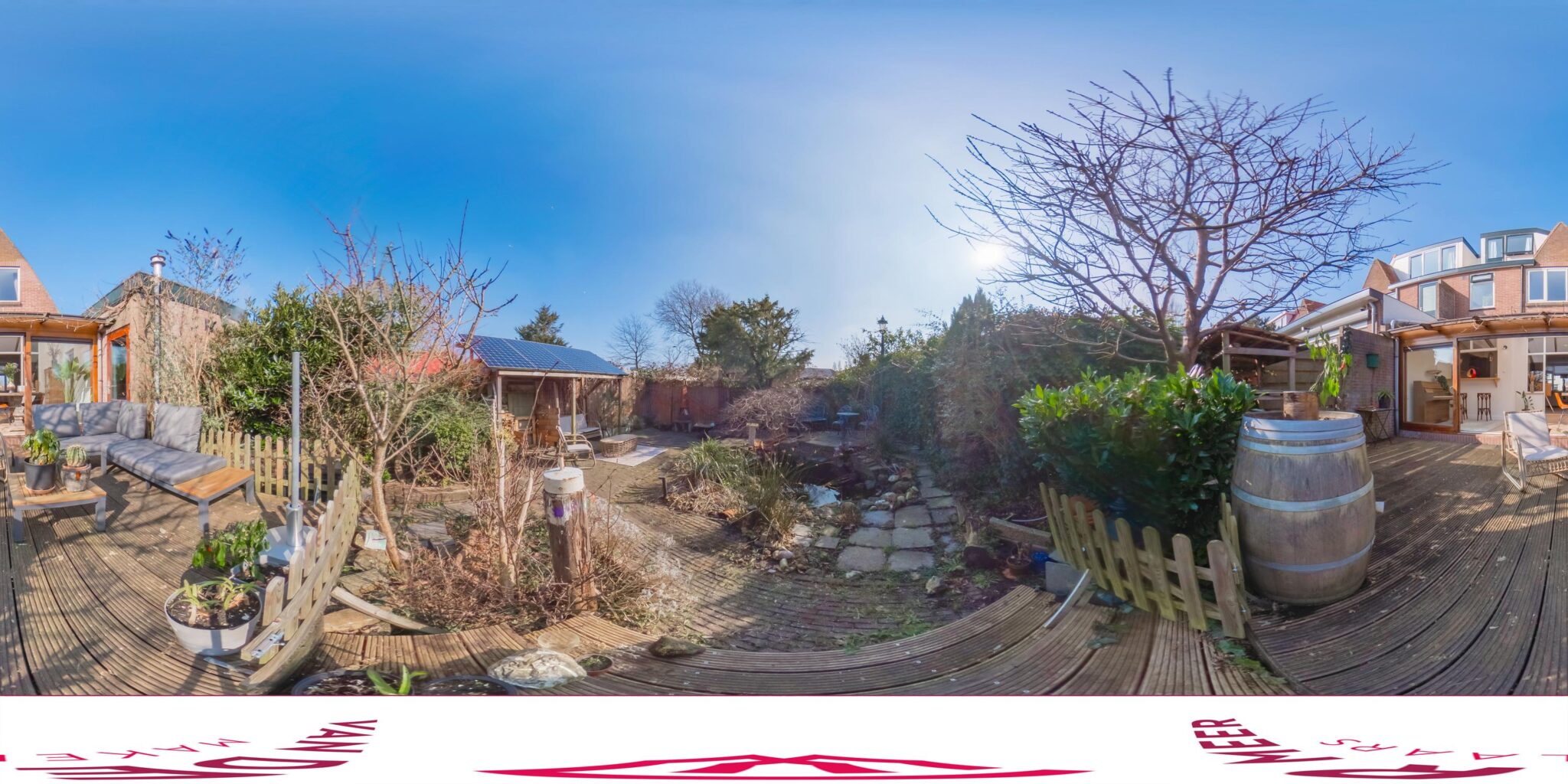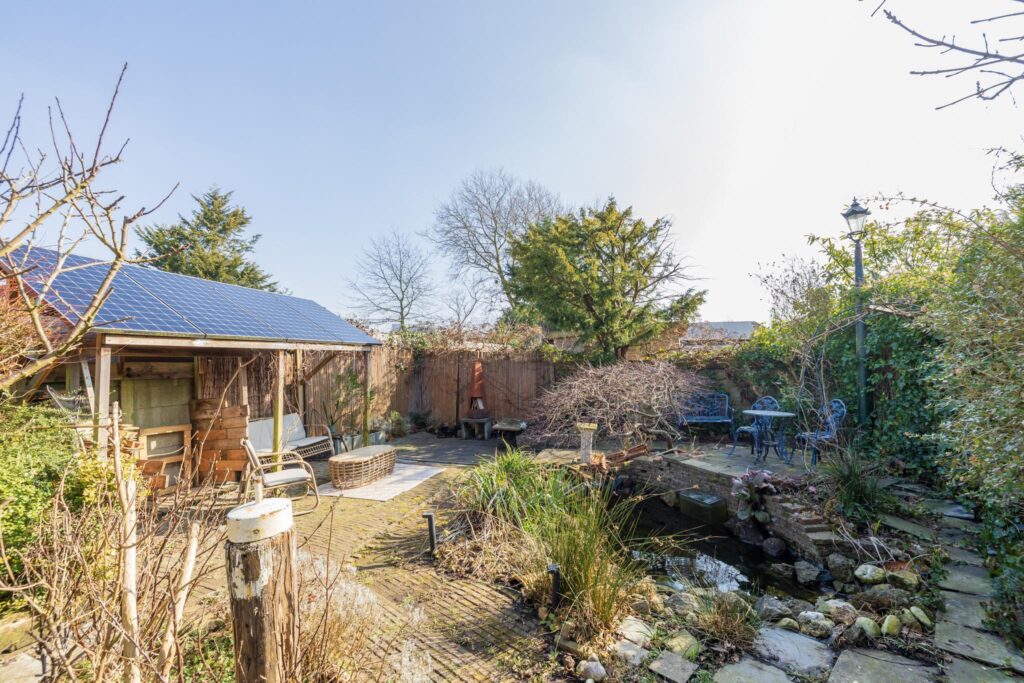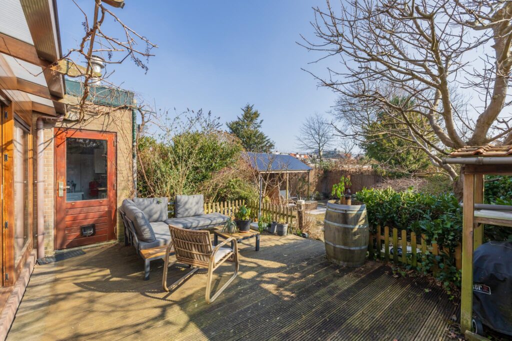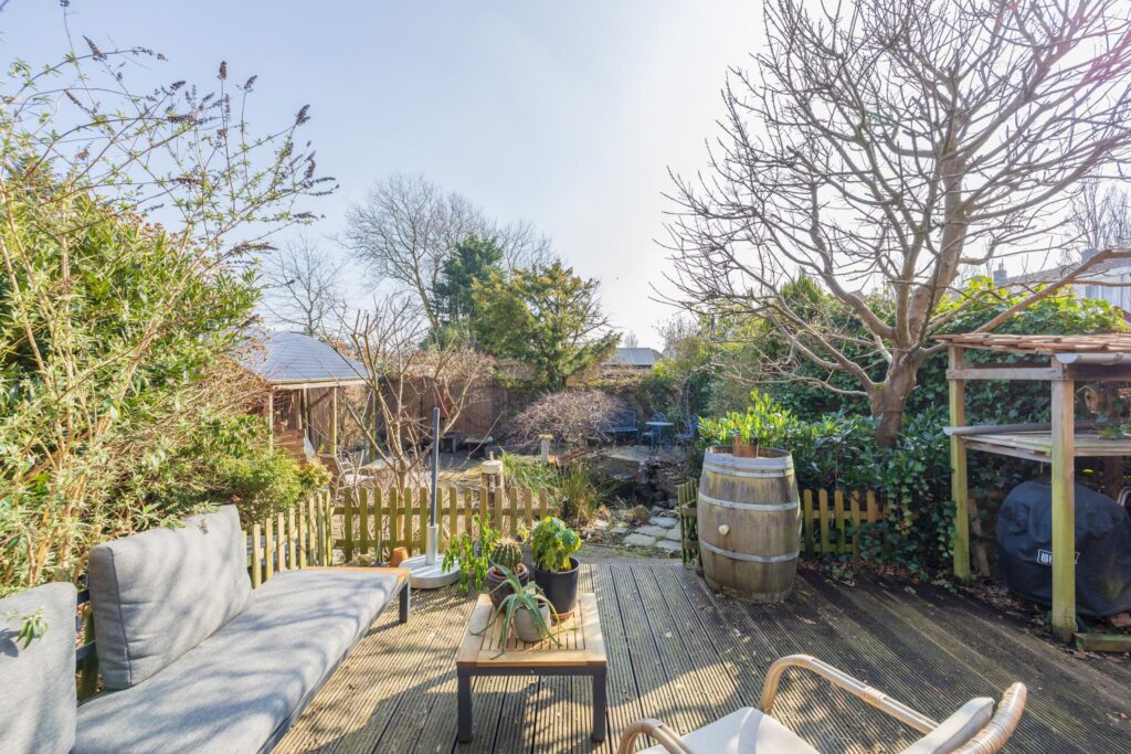 De achtertuin is een van de grote pluspunten van deze woning. Het achterterras sluit aan op de serre en biedt uitzicht op de diepe, fraai aangelegde tuin met een kleine overkapping en houthok. De tuin biedt volop privacy en ruimte voor ontspanning.