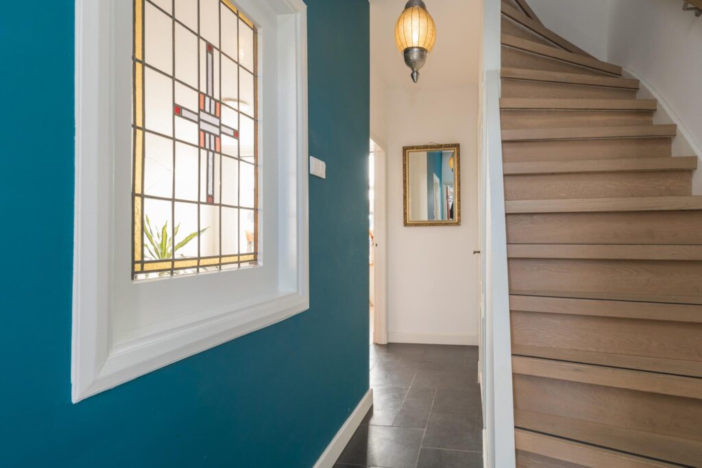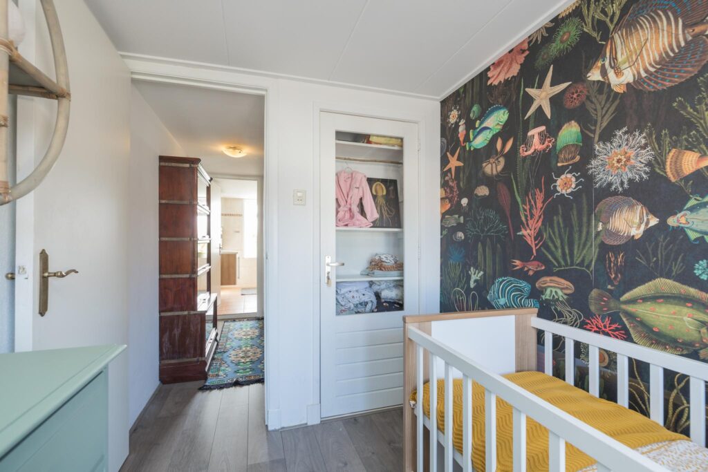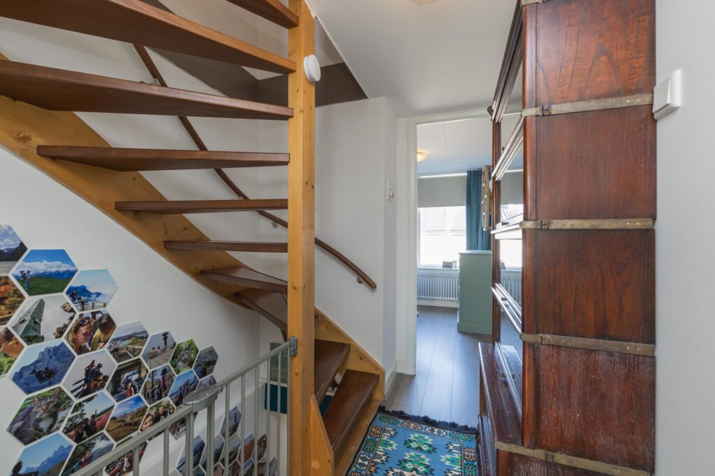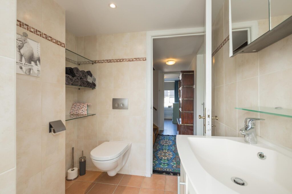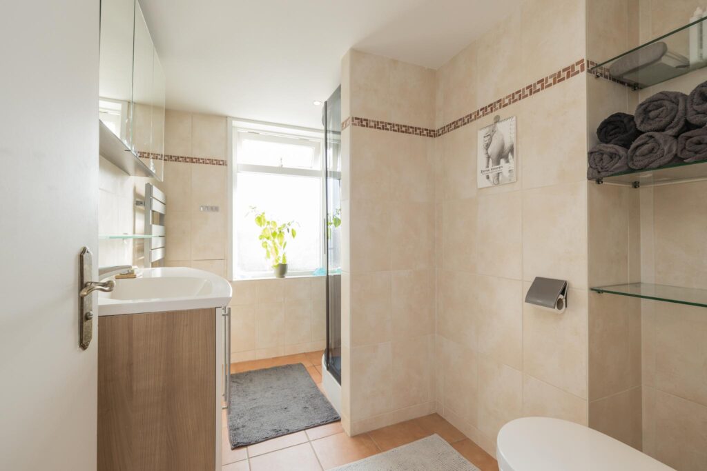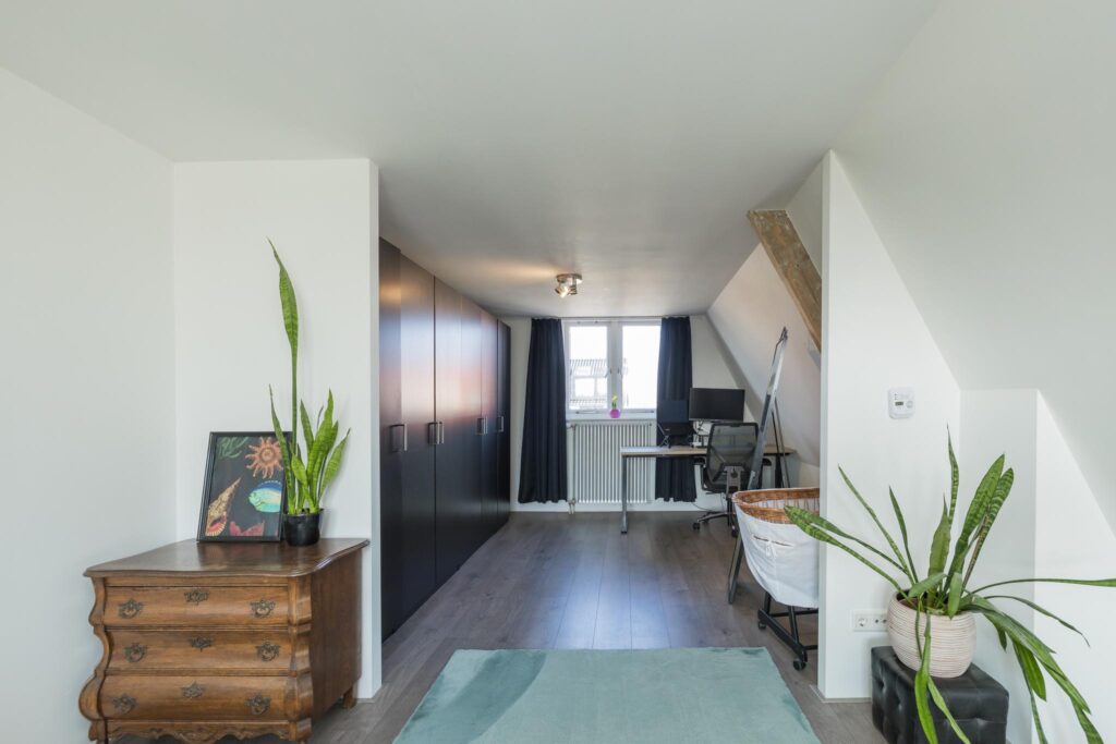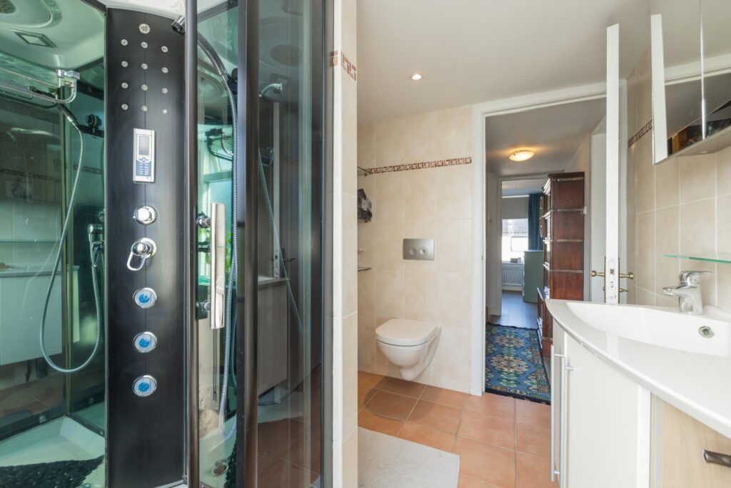 De overloop leidt naar twee slaapkamers (voorheen 3), elk met voldoende lichtinval en ruimte. De badkamer is voorzien van een moderne douchecabine, wastafelmeubel, toilet en lichte betegeling.