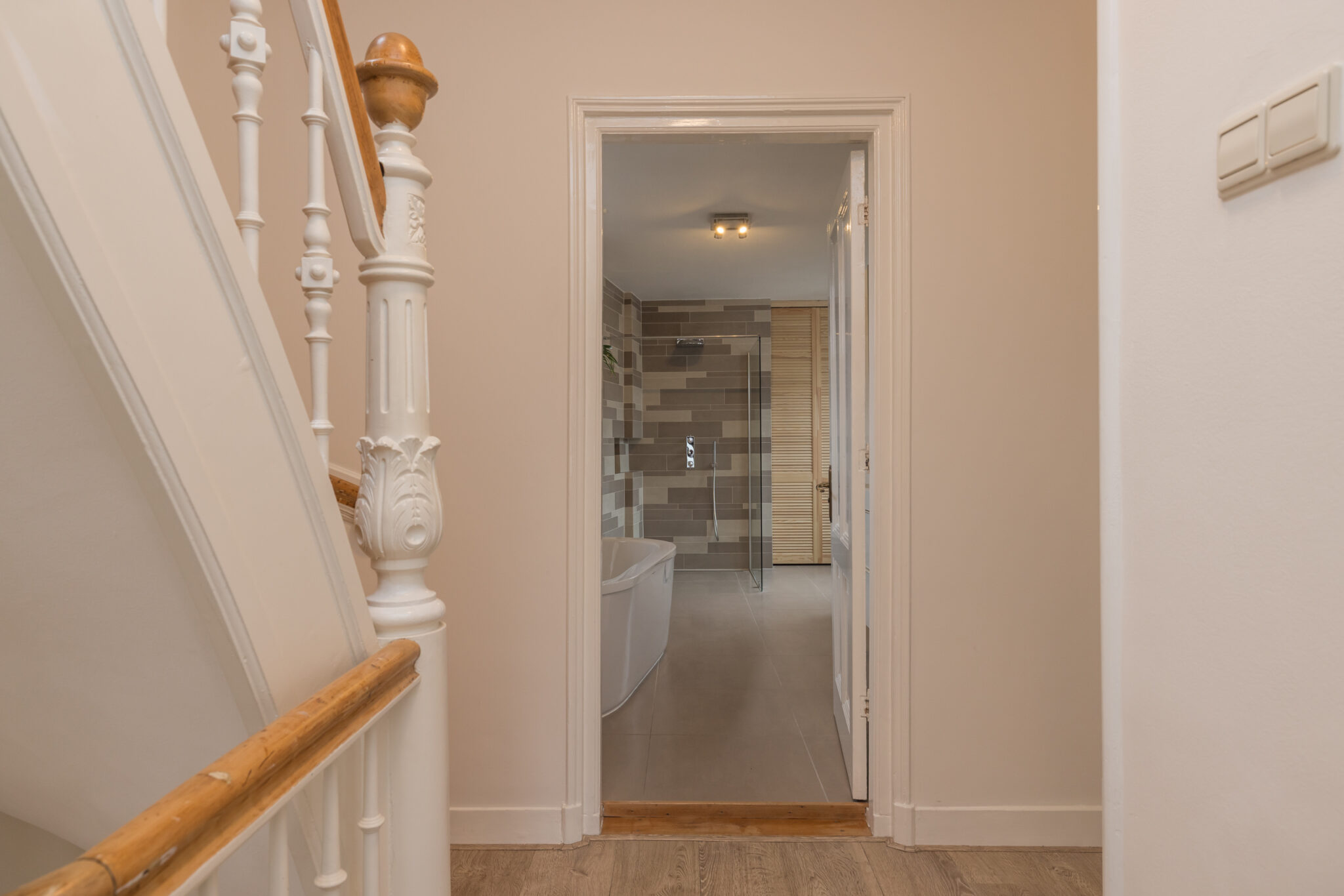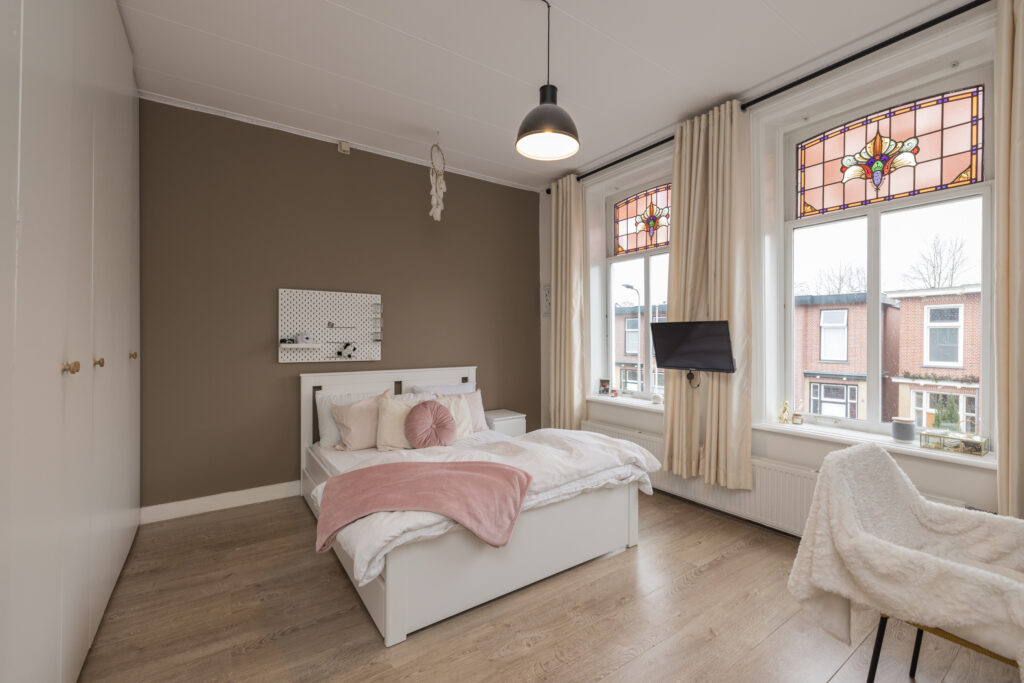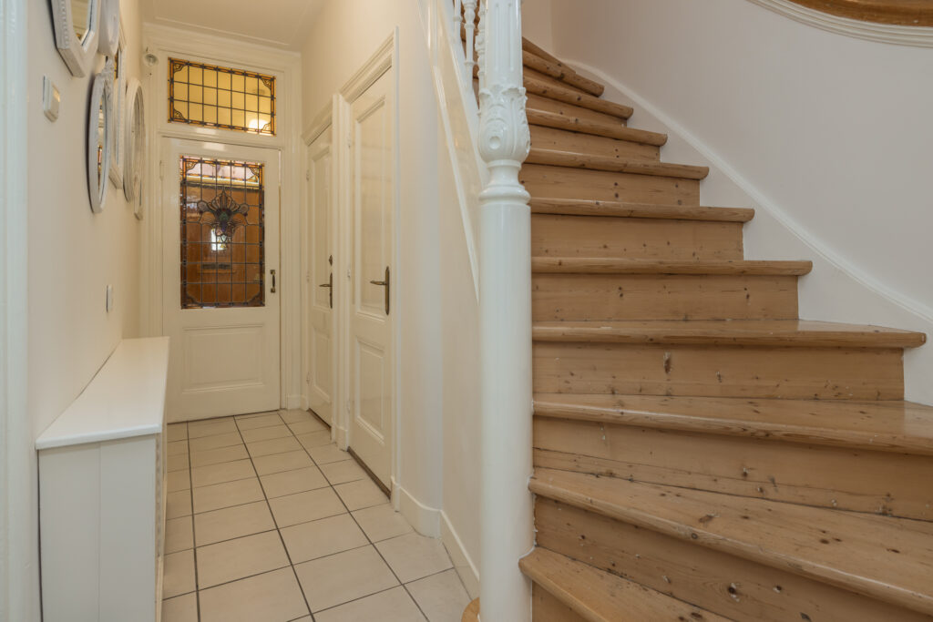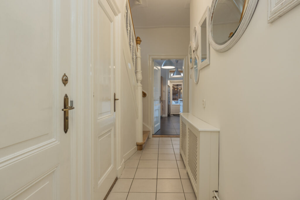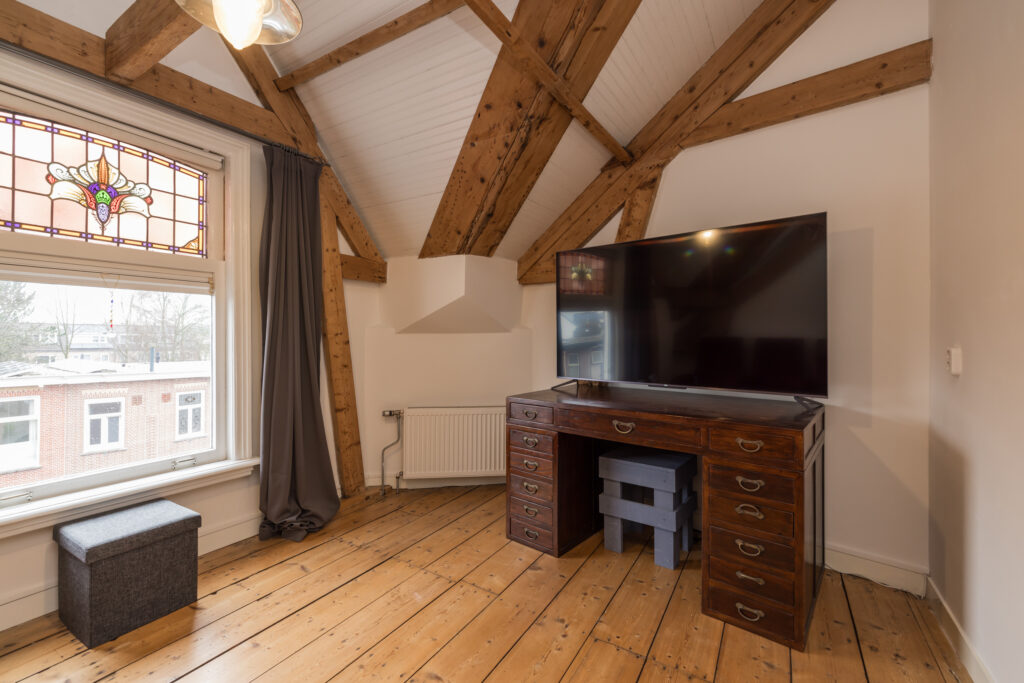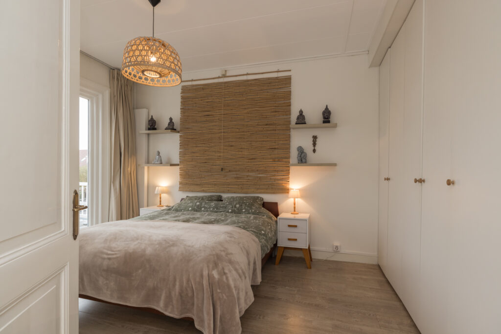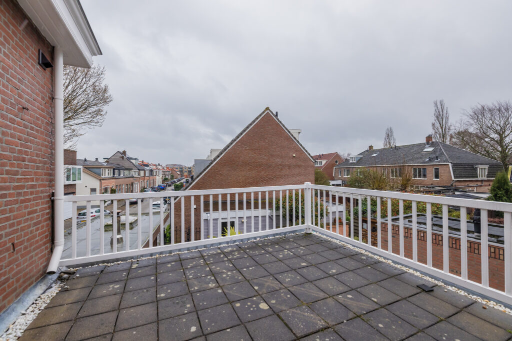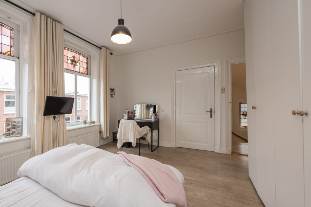 Overloop met toegang tot drie slaapkamers. De royale hoofdslaapkamer aan de achterzijde heeft openslaande deuren naar een dakterras op het zuidoosten en een vaste kastenwand. Aan de voorzijde twee slaapkamers, waarvan één met grote kastenwand en vaste kast. De vernieuwde luxe badkamer is ruim en licht, met ligbad, inloopdouche, dubbele wastafel met groot badkamermeubel, tweede toilet, vloerverwarming en handdoekradiator. Aansluitend een aparte was/stookruimte met cv-opstelling. Vanuit de badkamer openslaande deuren naar het dakterras.