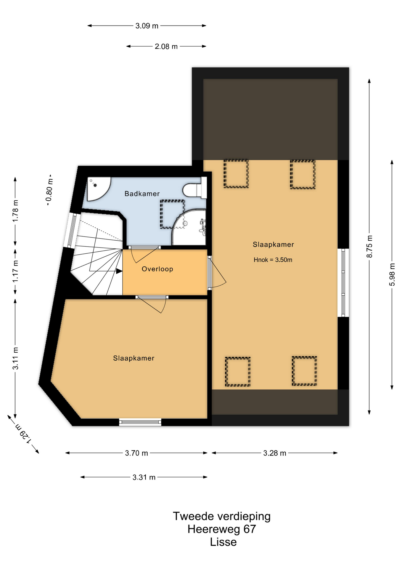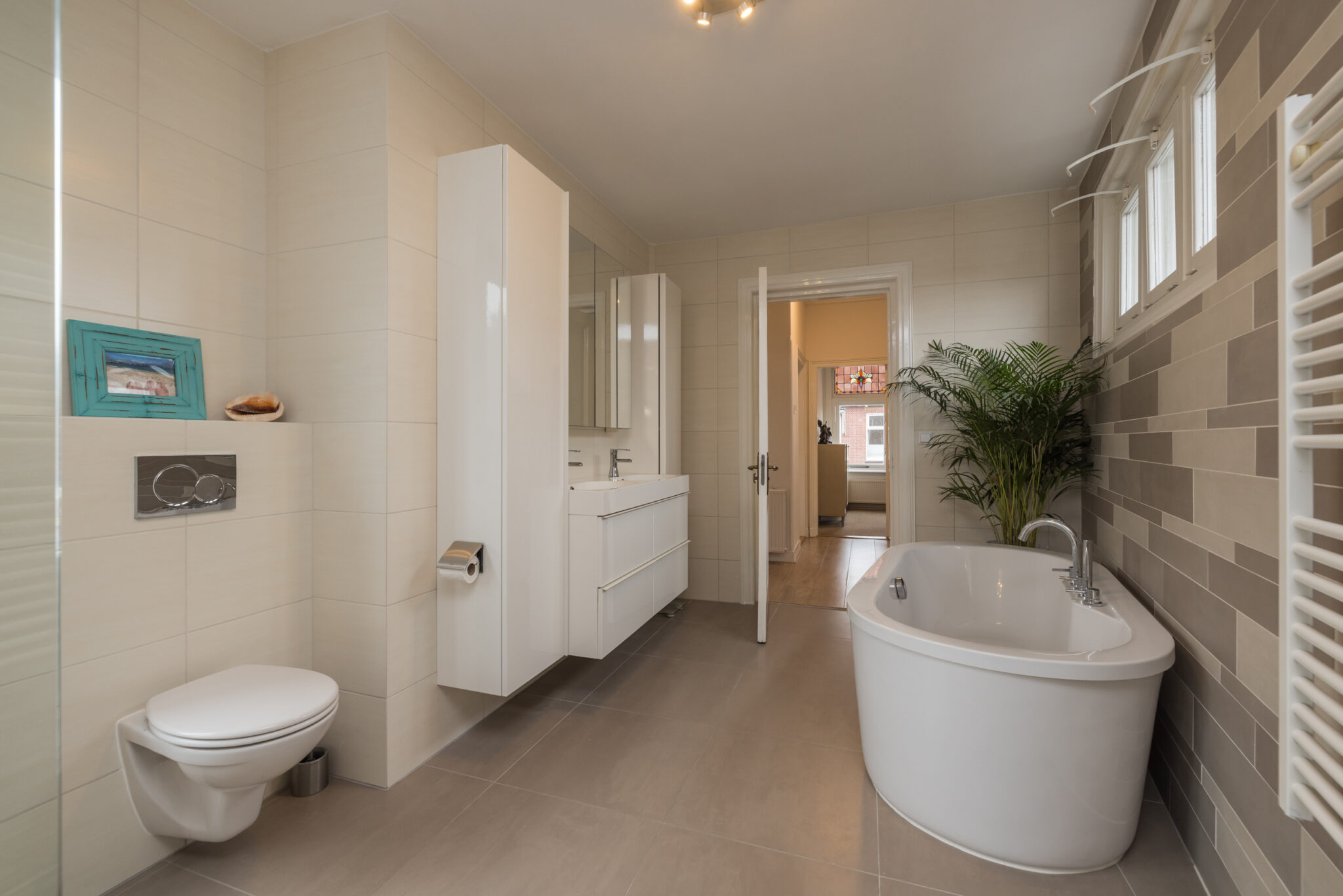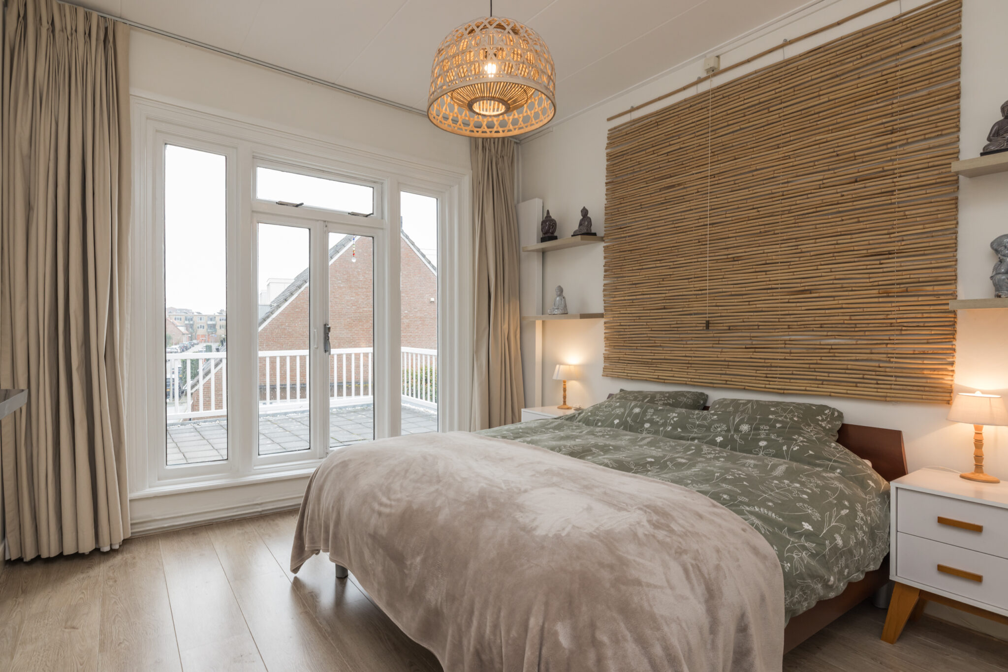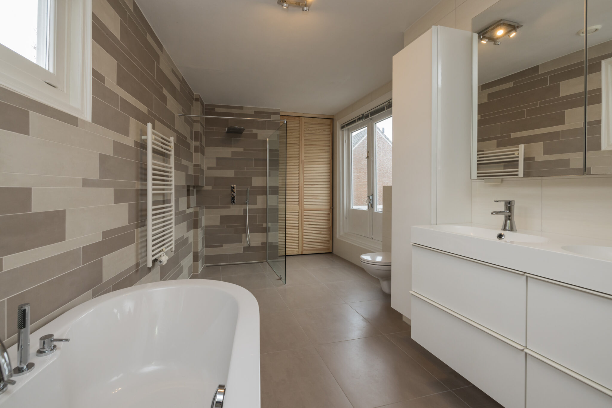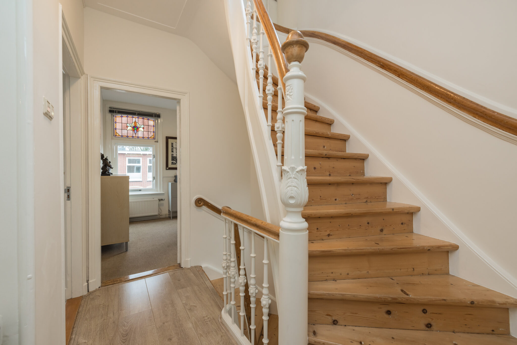 Overloop met toegang tot drie slaapkamers. De royale hoofdslaapkamer aan de achterzijde heeft openslaande deuren naar een dakterras op het zuidoosten en een vaste kastenwand. Aan de voorzijde twee slaapkamers, waarvan één met grote kastenwand en vaste kast. De vernieuwde luxe badkamer is ruim en licht, met ligbad, inloopdouche, dubbele wastafel met groot badkamermeubel, tweede toilet, vloerverwarming en handdoekradiator. Aansluitend een aparte was/stookruimte met cv-opstelling. Vanuit de badkamer openslaande deuren naar het dakterras.