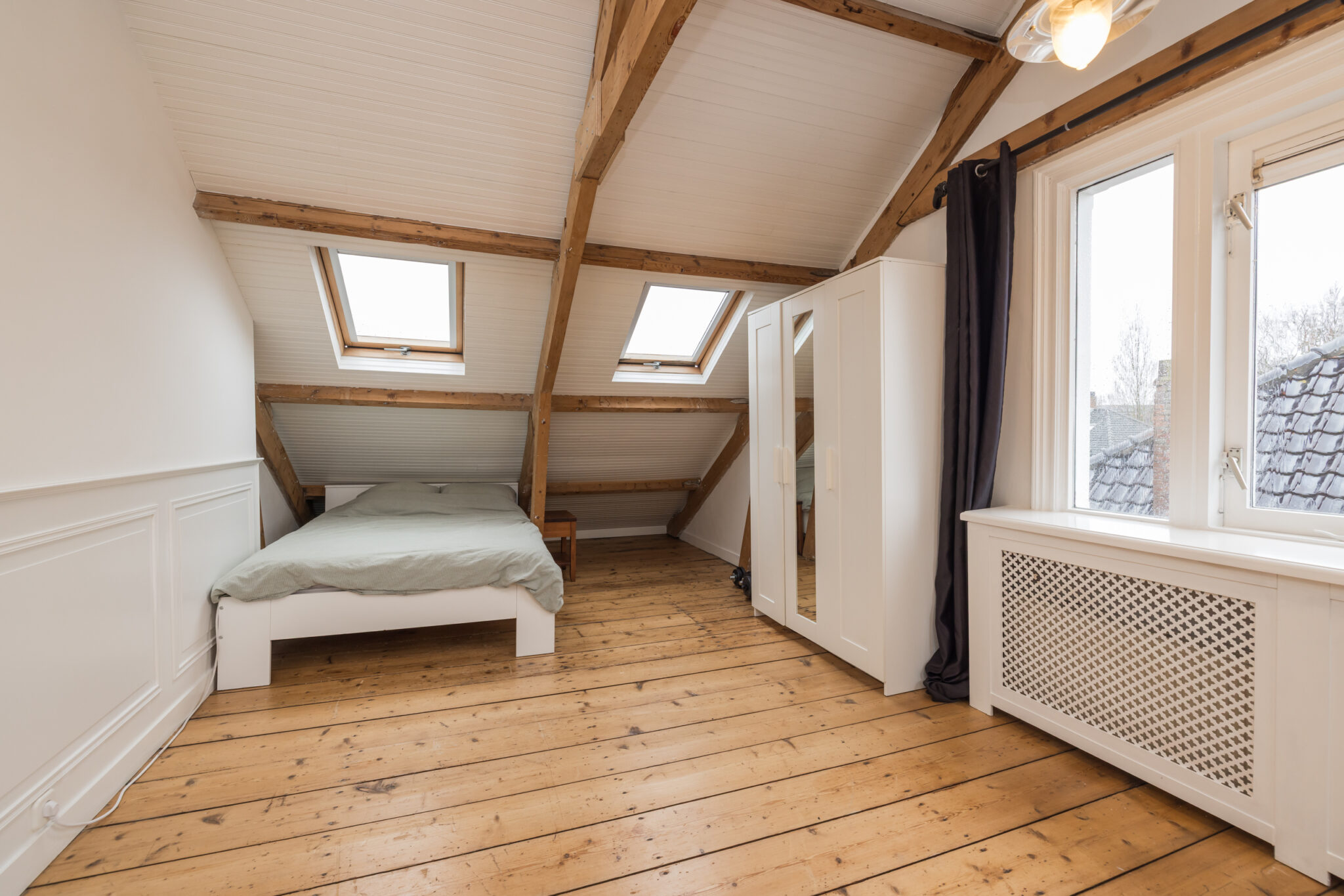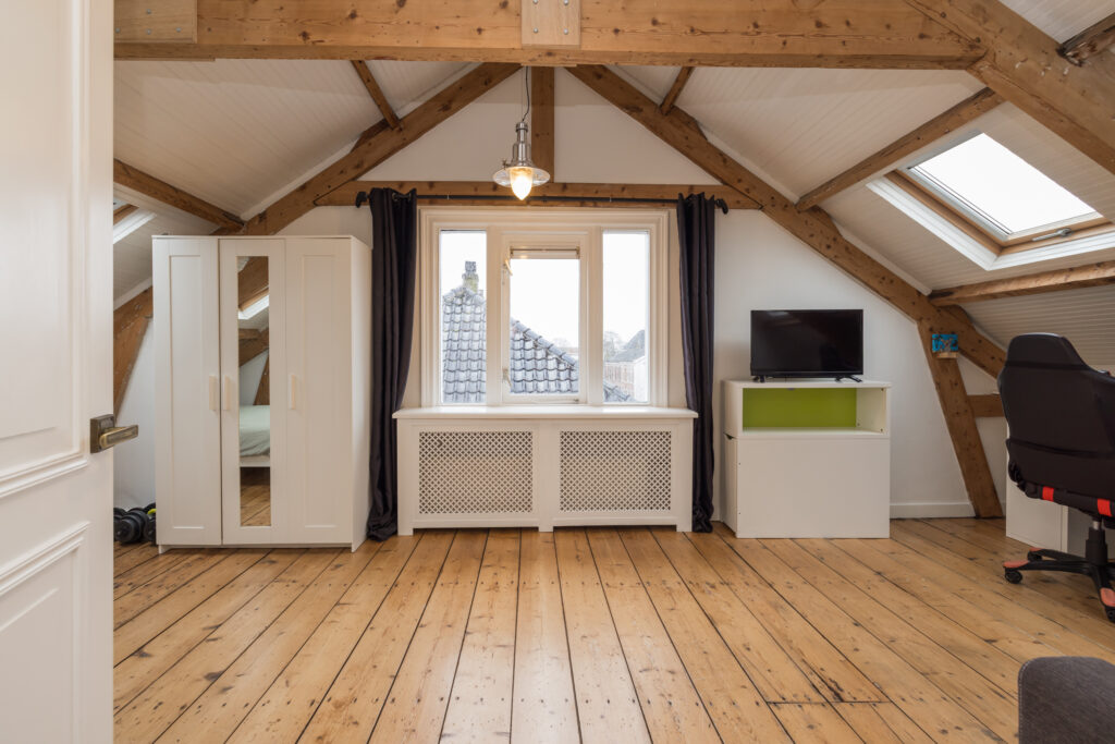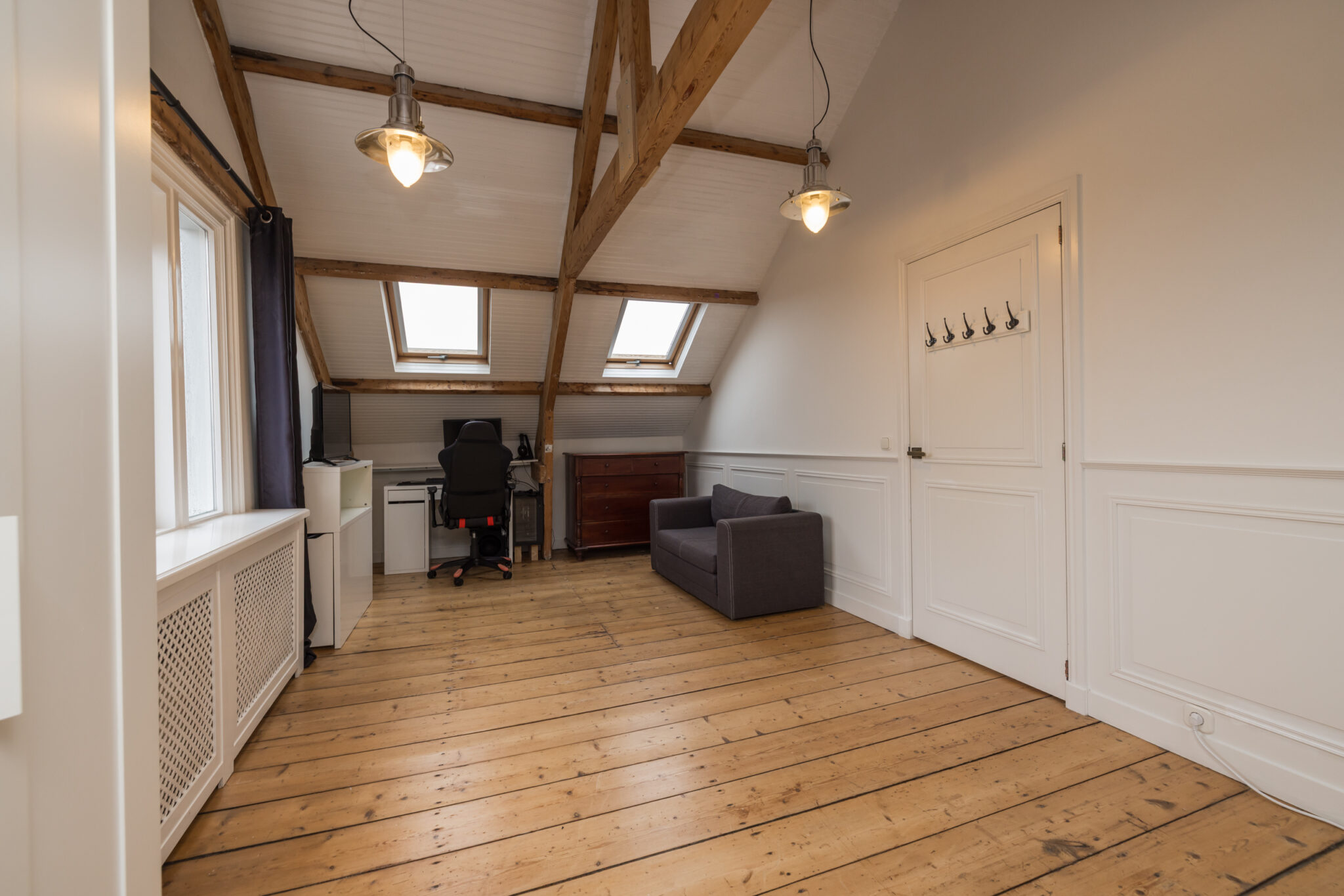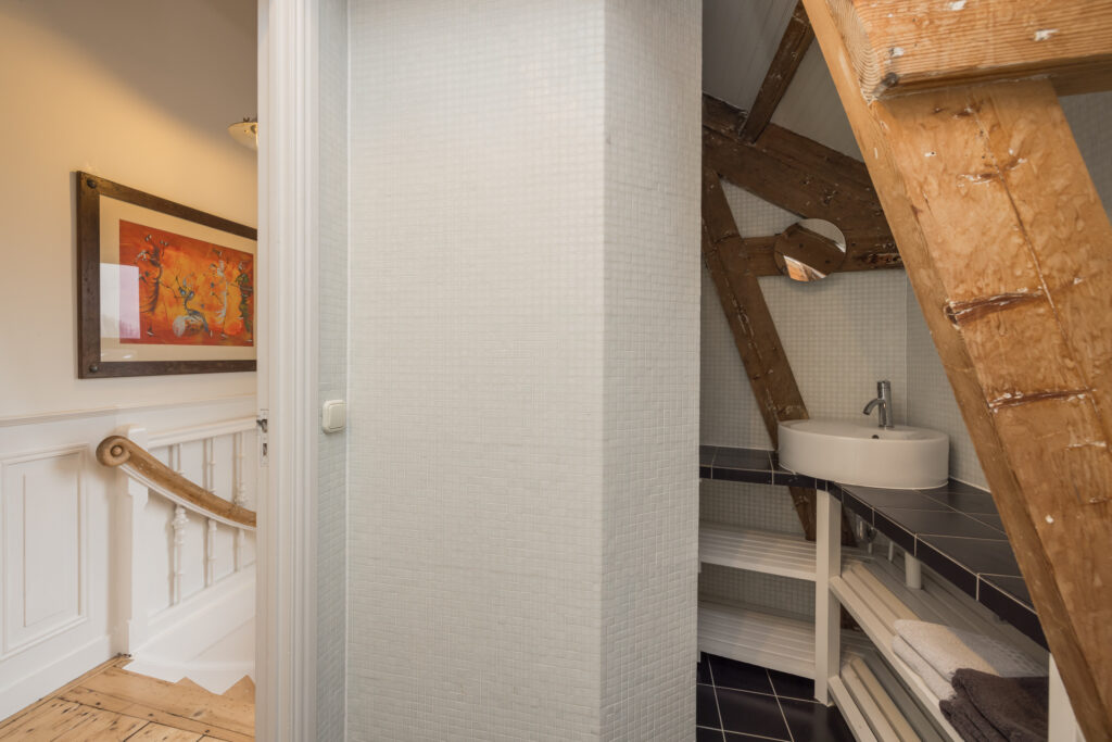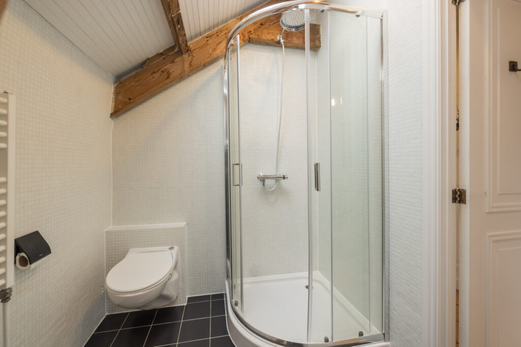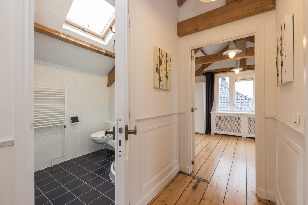Overloop met toegang tot de twee slaapkamers en badkamer: een ruime slaapkamer met houten vloer, zichtbare dakspanten en Velux dakramen met verduistering. Daarnaast een tweede slaapkamer met houten vloer en originele balken. Tweede moderne badkamer met douche, toilet, handdoekradiator en Velux dakraam.