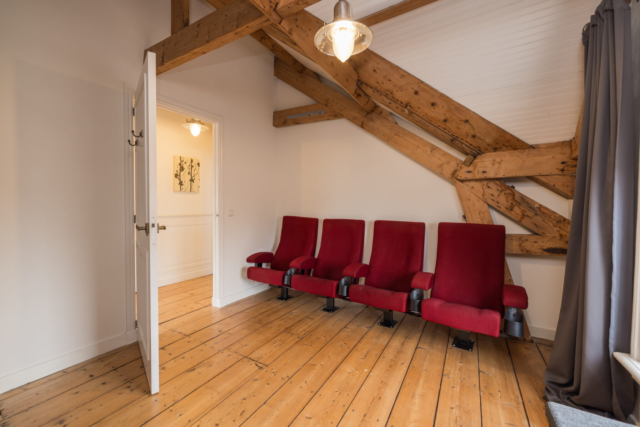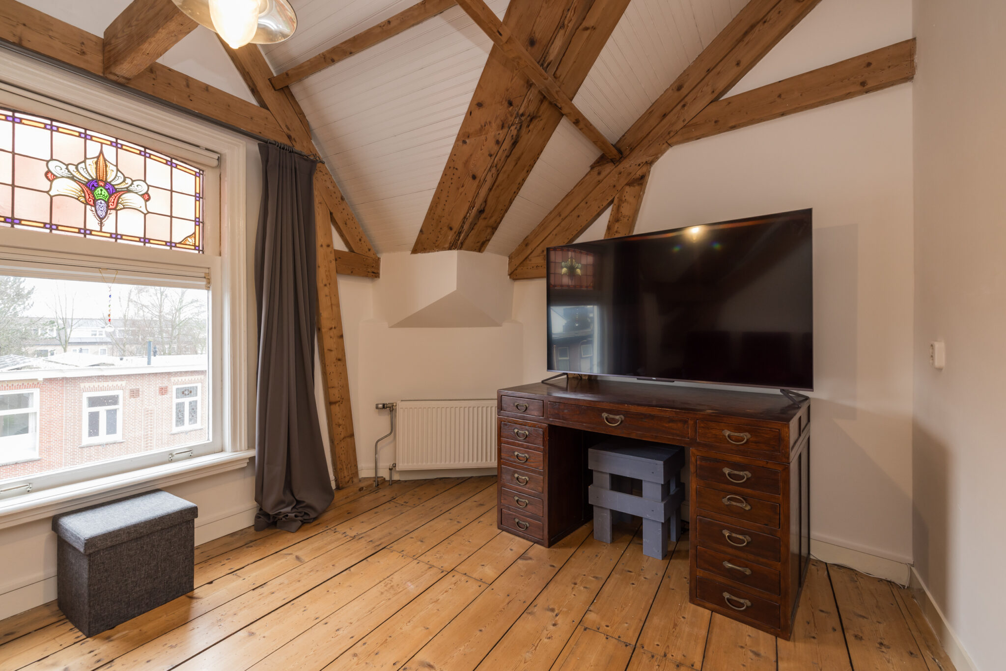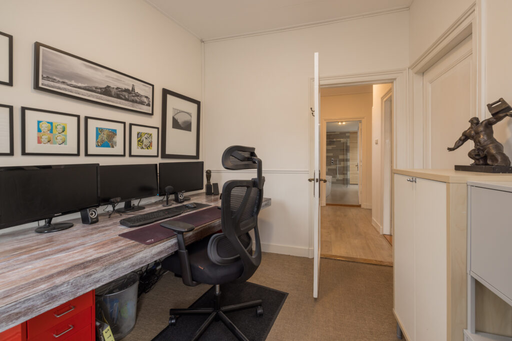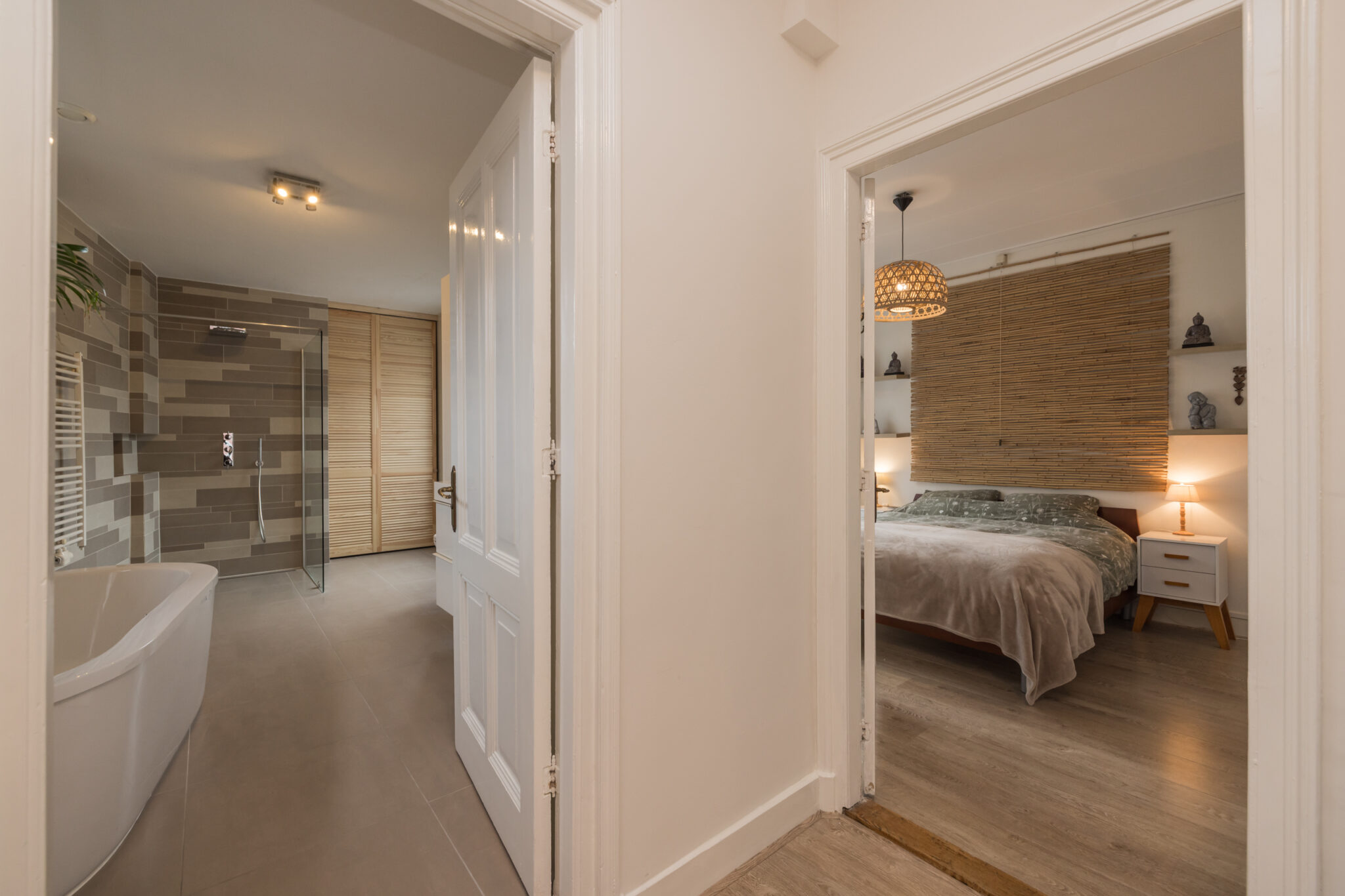 Overloop met toegang tot de twee slaapkamers en badkamer: een ruime slaapkamer met houten vloer, zichtbare dakspanten en Velux dakramen met verduistering. Daarnaast een tweede slaapkamer met houten vloer en originele balken. Tweede moderne badkamer met douche, toilet, handdoekradiator en Velux dakraam.