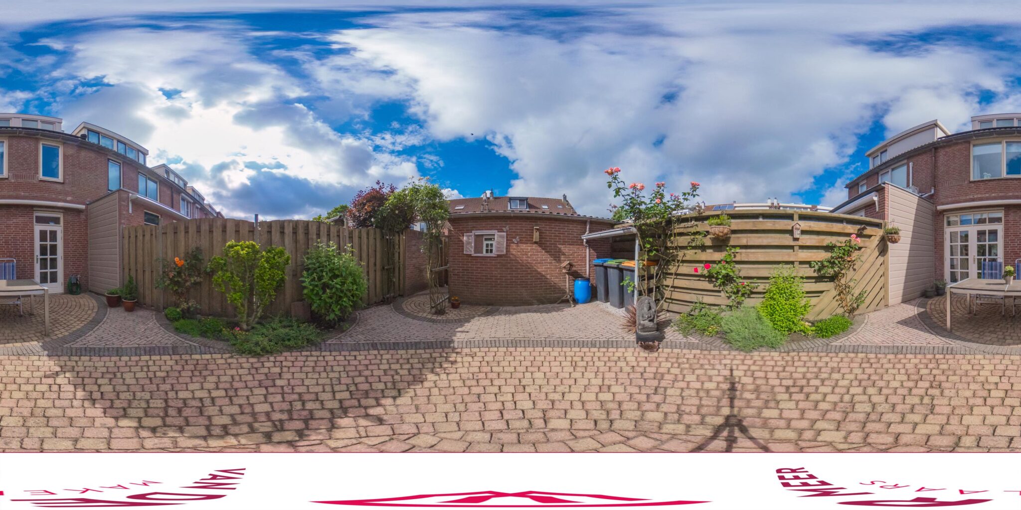 De tuin beschikt over een terras, een vrijstaande vergrote stenen berging en een achterom.