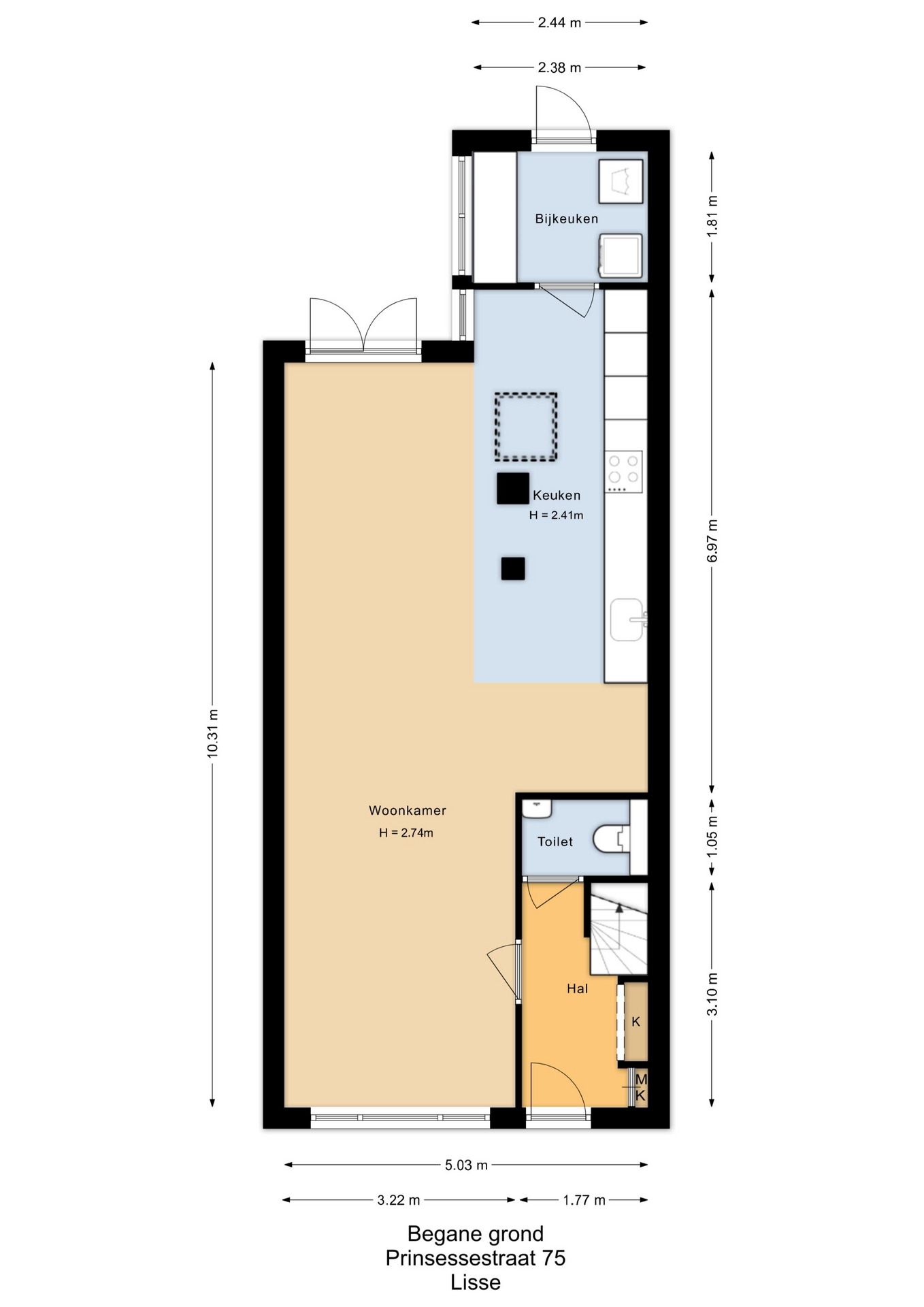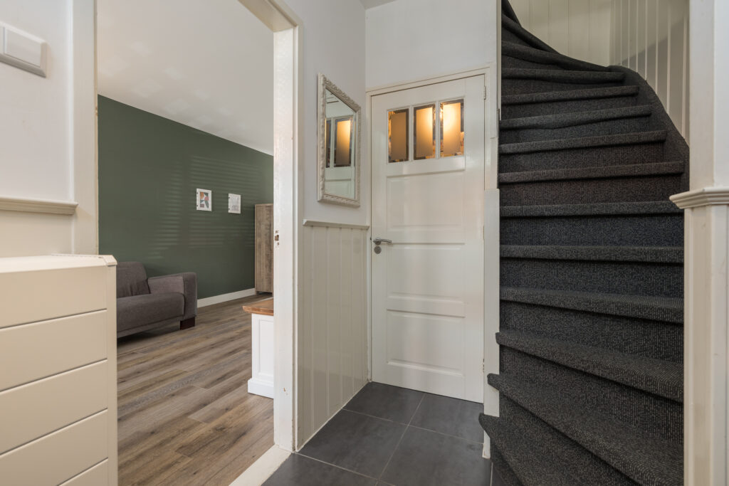 Entree, hal met vernieuwde meterkast, ruime toilet met fonteintje en toegang tot de royale uitgebouwde woonkamer. De woonkamer is op fraaie wijze verlengd en voorzien van een lichtkoepel en openslaande deuren naar de zonnige achtertuin. Aan de achterzijde bevindt zich de moderne keuken met diverse apparatuur, waaronder een inductie 5 pits kookplaat, RVS-afzuigkap, grote koelkast, aparte 5 laden vrieskast, vaatwasmachine, oven, combi magnetron oven, en quooker kraan. Vanuit de keuken is de aangebouwde bijkeuken bereikbaar met aansluitingen voor wasapparatuur en een deur naar de tuin.