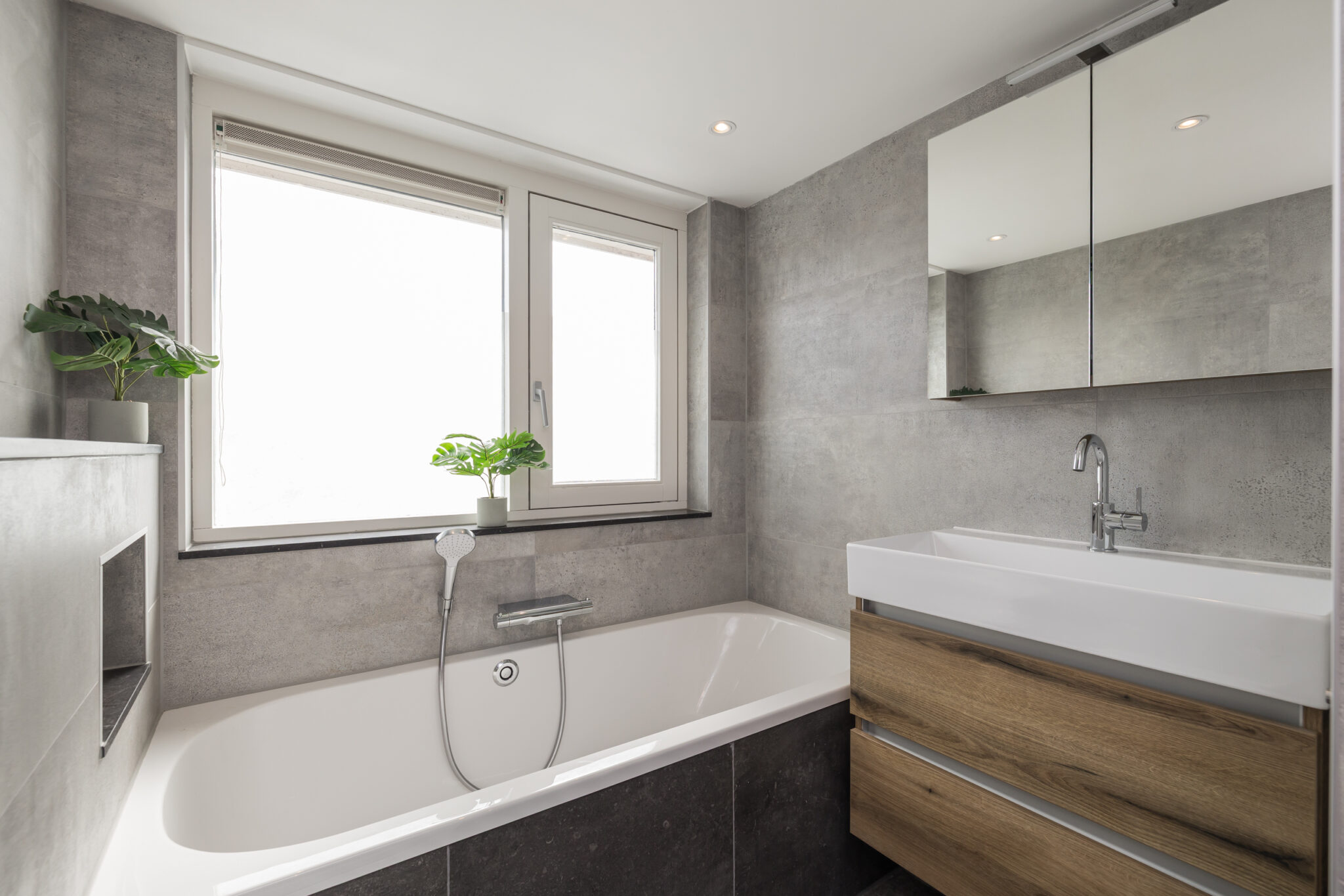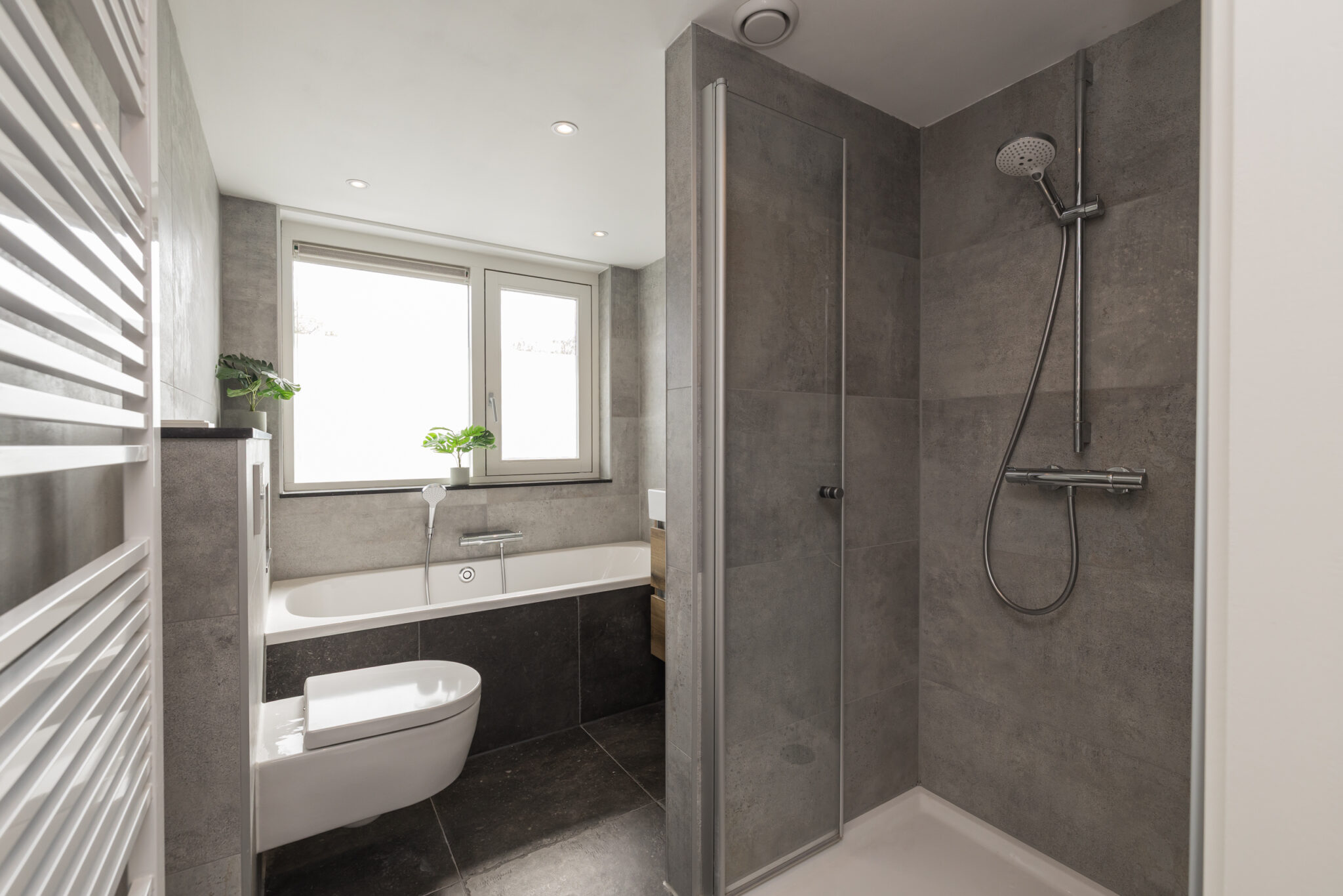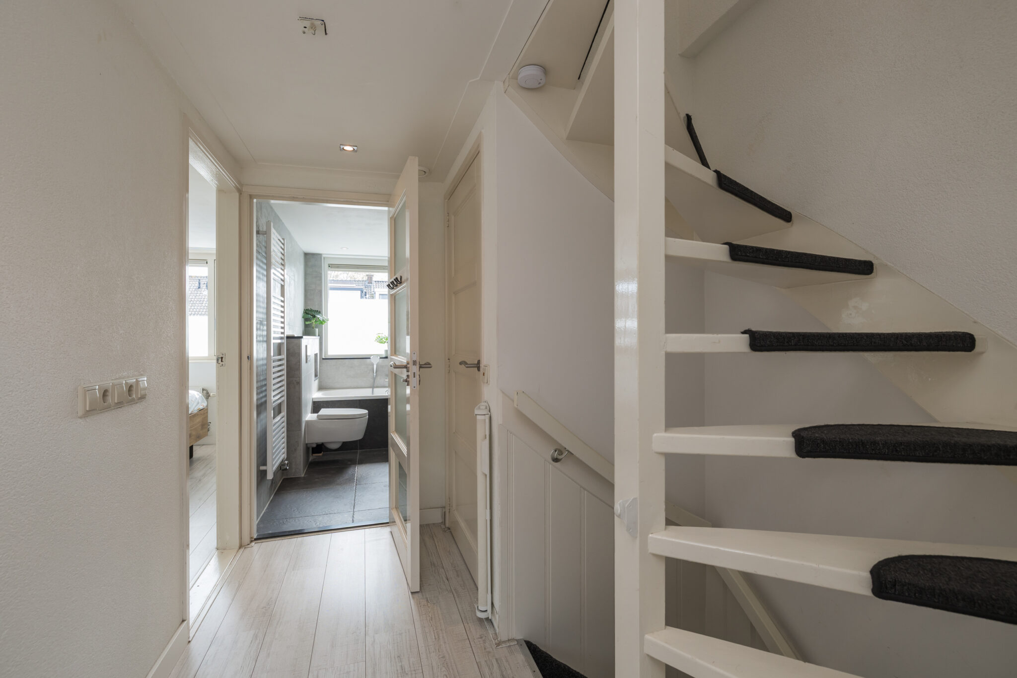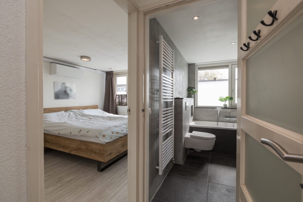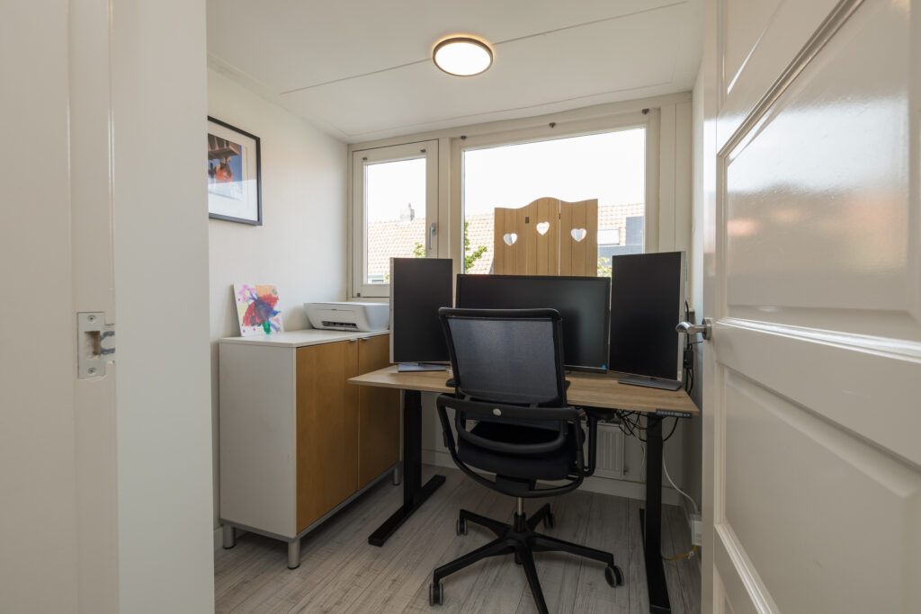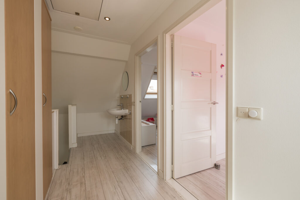Overloop met inbouwspots, kleine slaap/werkkamer aan de voorzijde met dakkapel, slaapkamer aan de voorzijde met inbouwkastenwand en een ruime slaapkamer aan de achterzijde, met inbouwspots eveneens voorzien van inbouwkastenwand. De luxe, geheel betegelde badkamer is compleet uitgevoerd met ligbad, douche, wandcloset, wastafel in meubel, inbouwspots en elektrische designradiator.