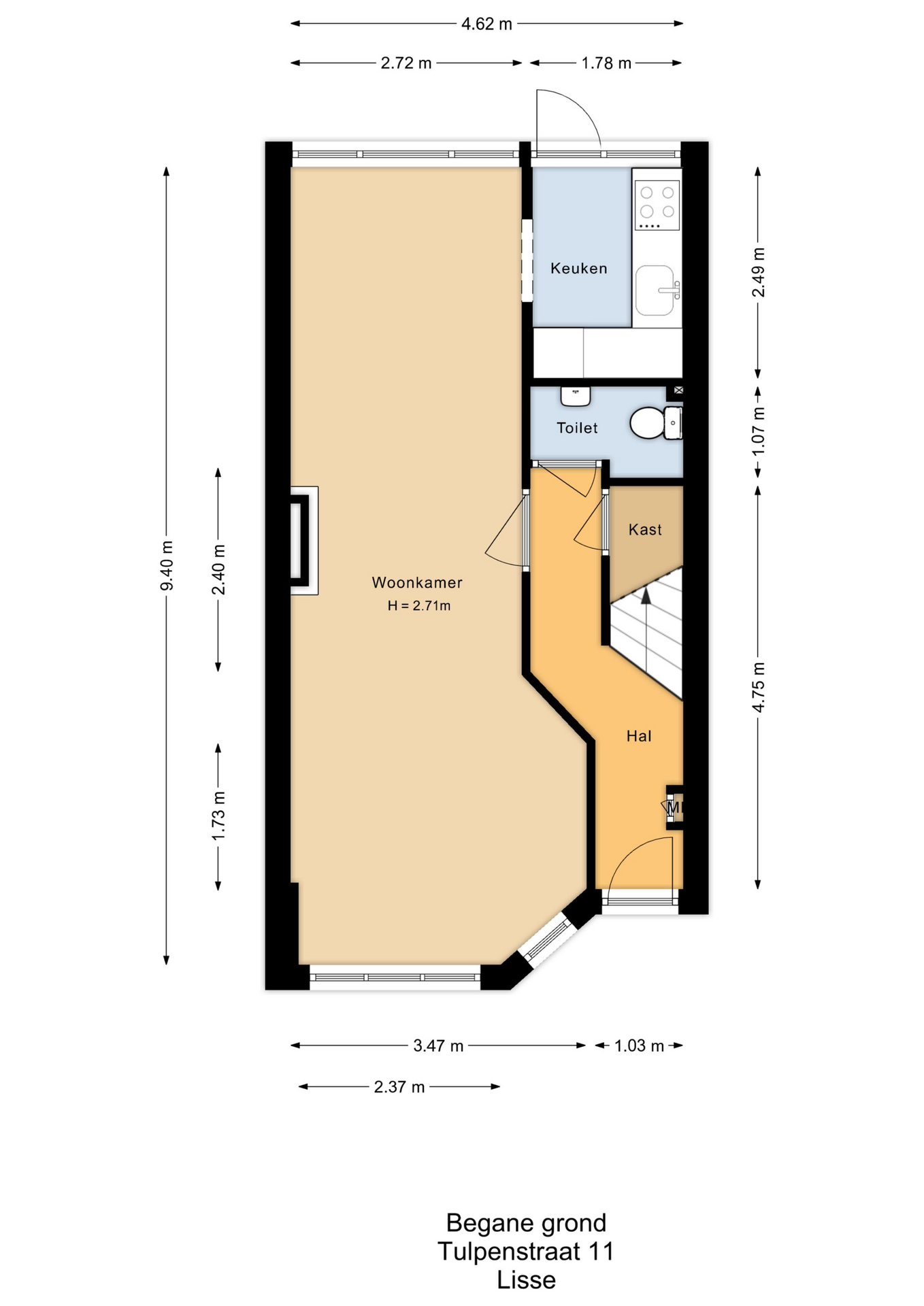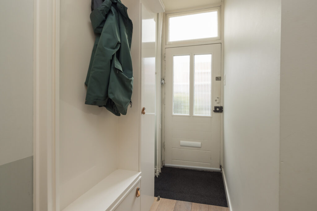 Aan de voorzijde van de woning ligt een goed onderhouden, groene voortuin die het geheel een vriendelijke uitstraling geeft. Binnenkomend via de hal vind je een kelderkast, garderobe en meterkast, het toilet met fontein en de trap naar de verdieping.