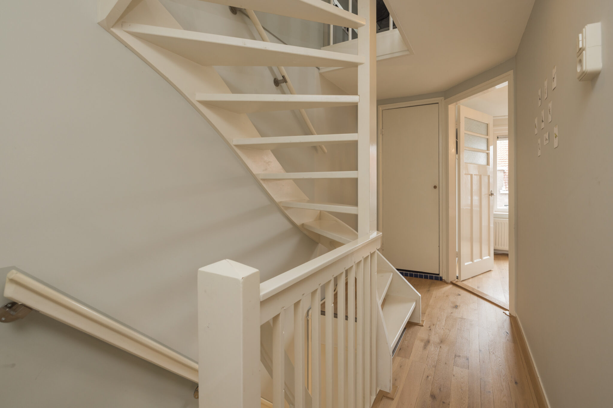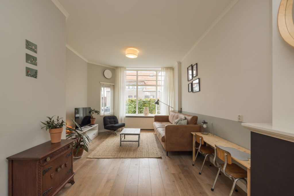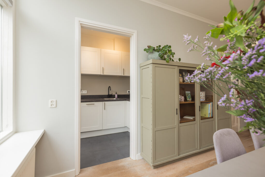 De woonkamer is sfeervol en knus, met een grote raampartij in de erker aan de voorzijde die zorgt voor veel licht en karakter. Vanuit de woonkamer heb je via een open doorgang toegang tot de keuken. De hal en woonkamer zijn voorzien van een mooie houten vloer. De bovenramen aan de voor- en achterzijde zorgen voor de klassieke jaren ’30 uitstraling.