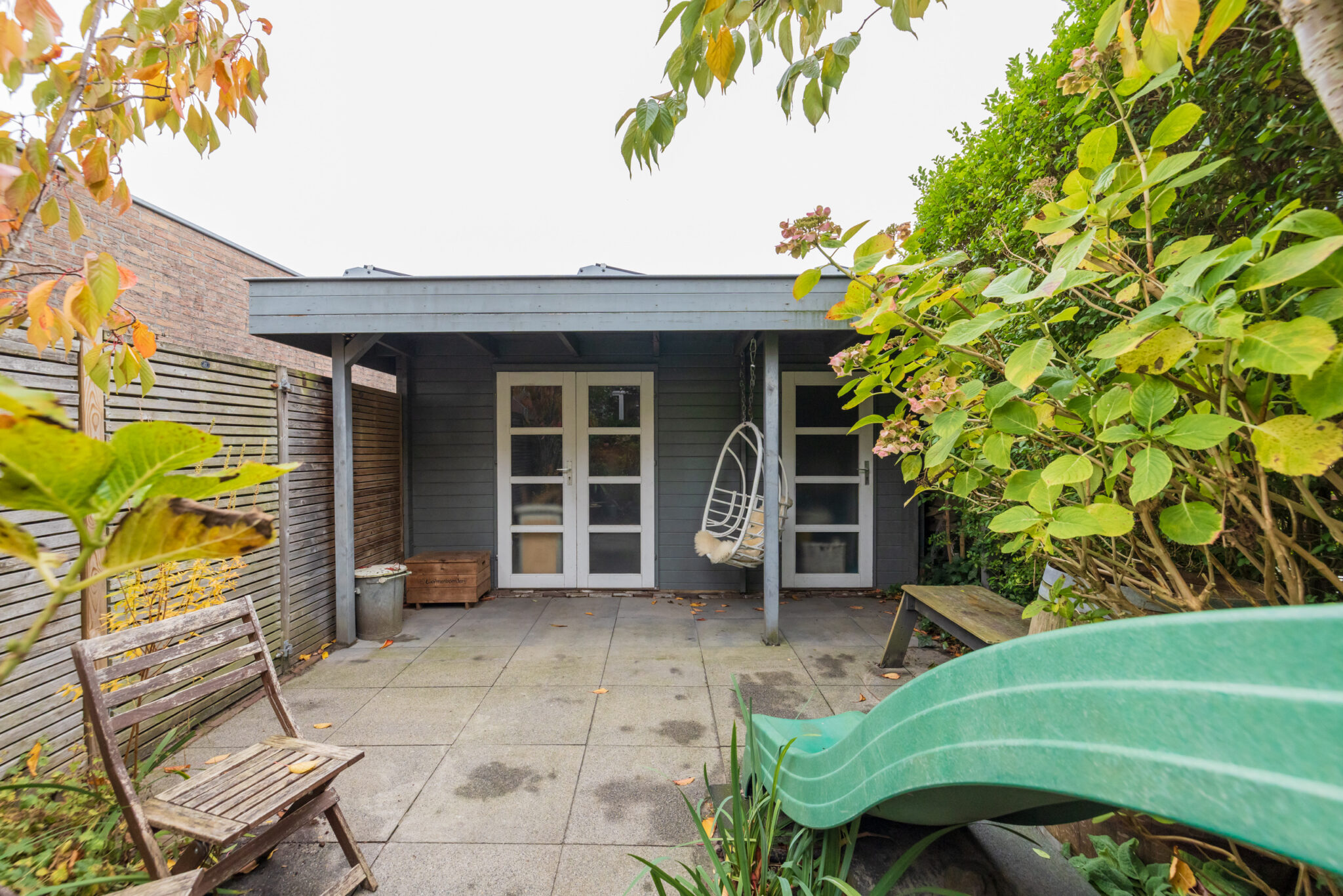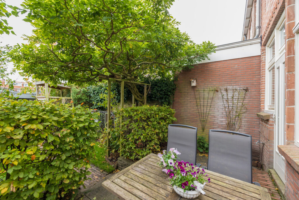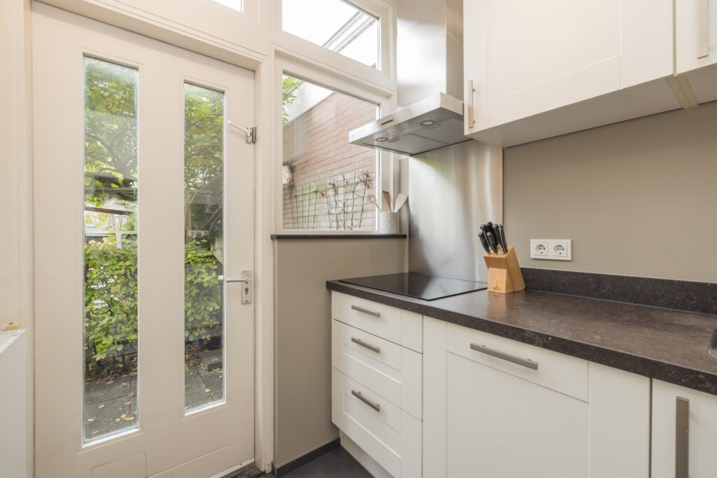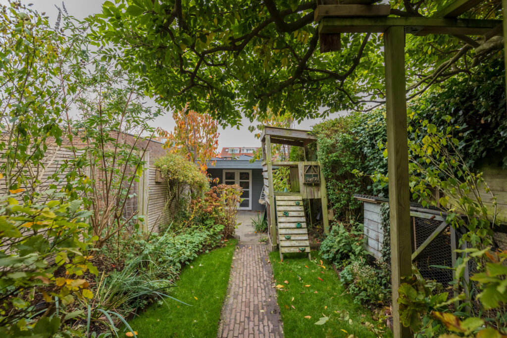 De keuken is verzorgd en praktisch ingedeeld, met een combi-oven/magnetron, koelkast en kookplaat. Vanuit hier stap je zo de achtertuin in — een gezellige, goed onderhouden plek met een handige achterom. Achterin de tuin bevindt zich een modern tuinhuis met twee binnenruimtes, voorzien van elektra.