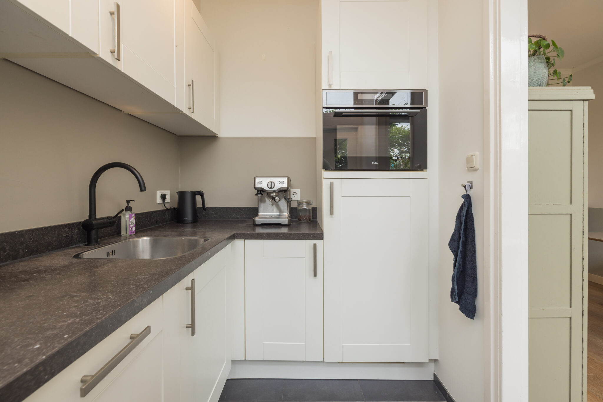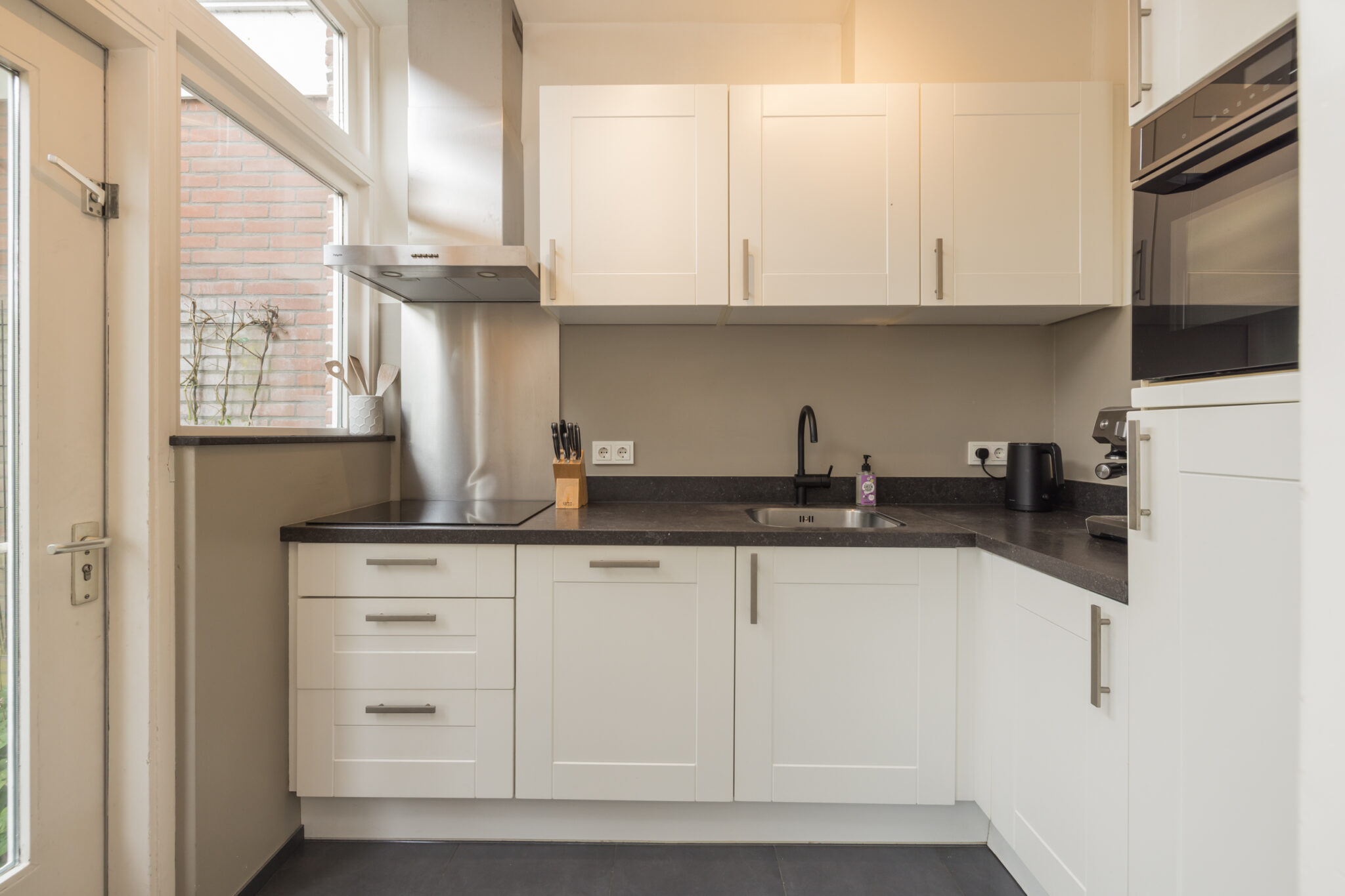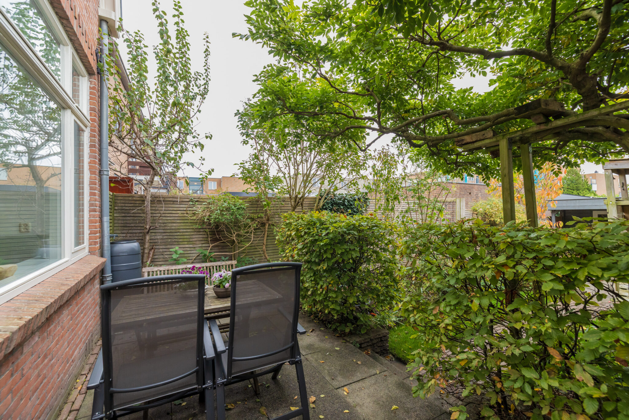De keuken is verzorgd en praktisch ingedeeld, met een combi-oven/magnetron, koelkast en kookplaat. Vanuit hier stap je zo de achtertuin in — een gezellige, goed onderhouden plek met een handige achterom. Achterin de tuin bevindt zich een modern tuinhuis met twee binnenruimtes, voorzien van elektra.