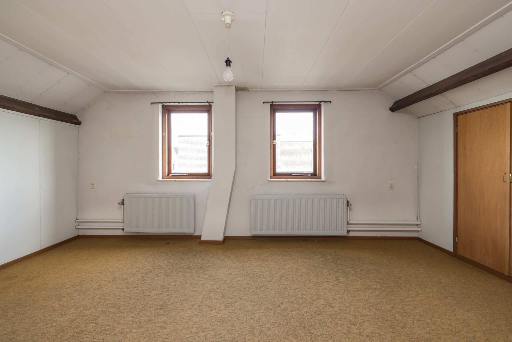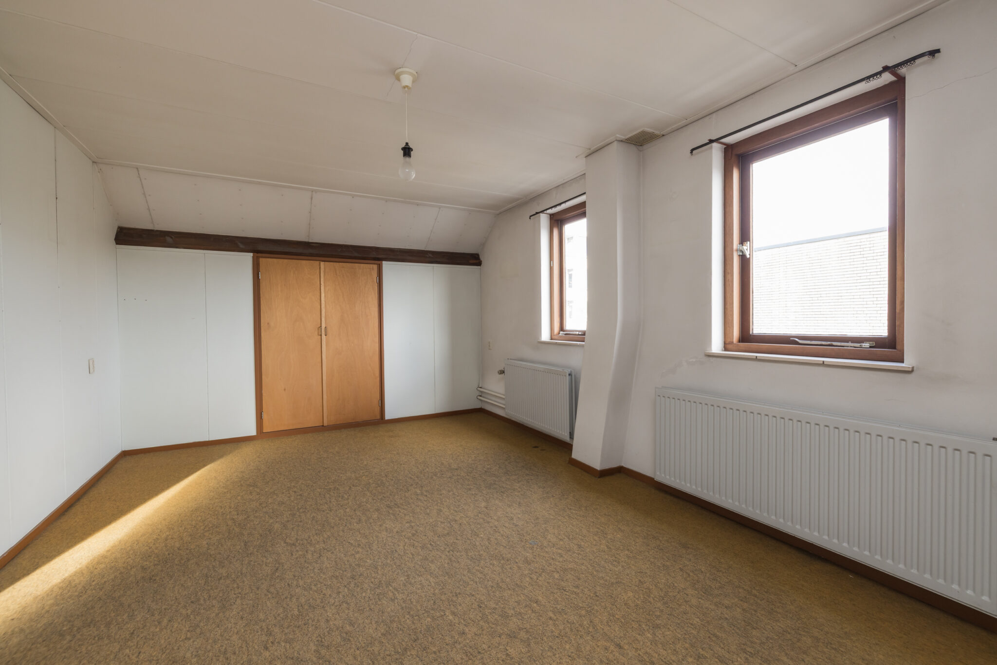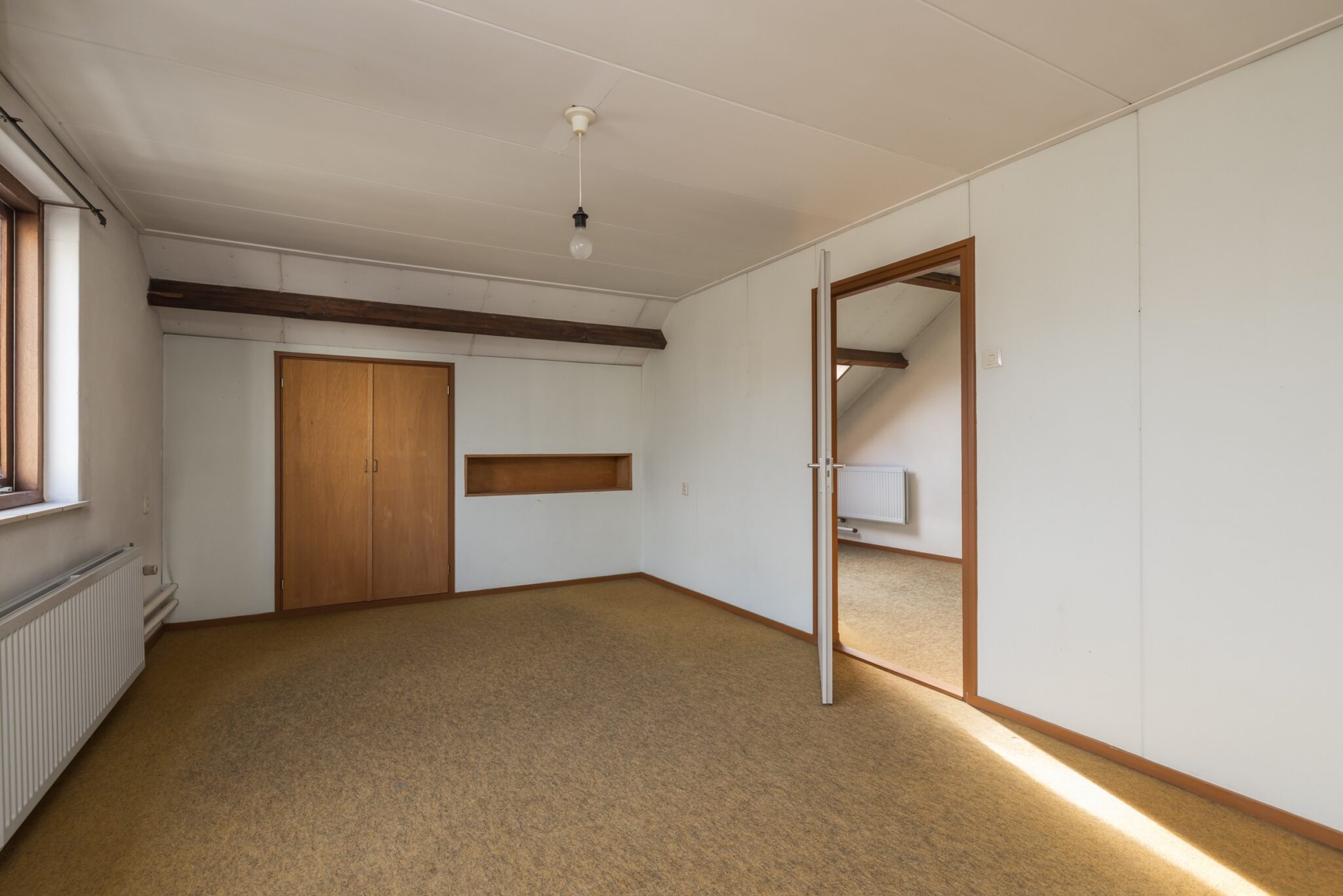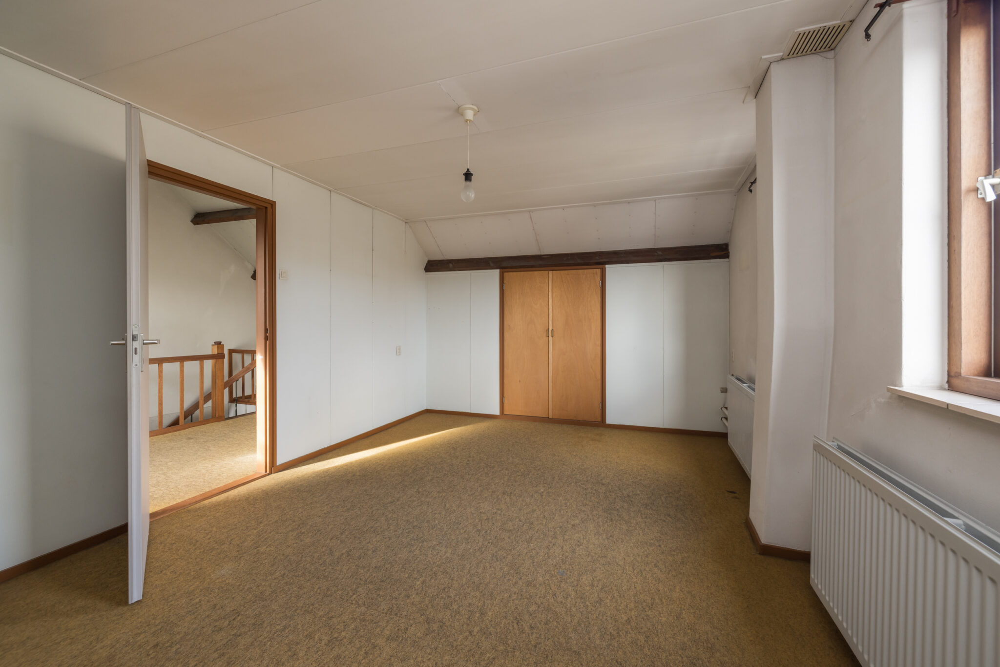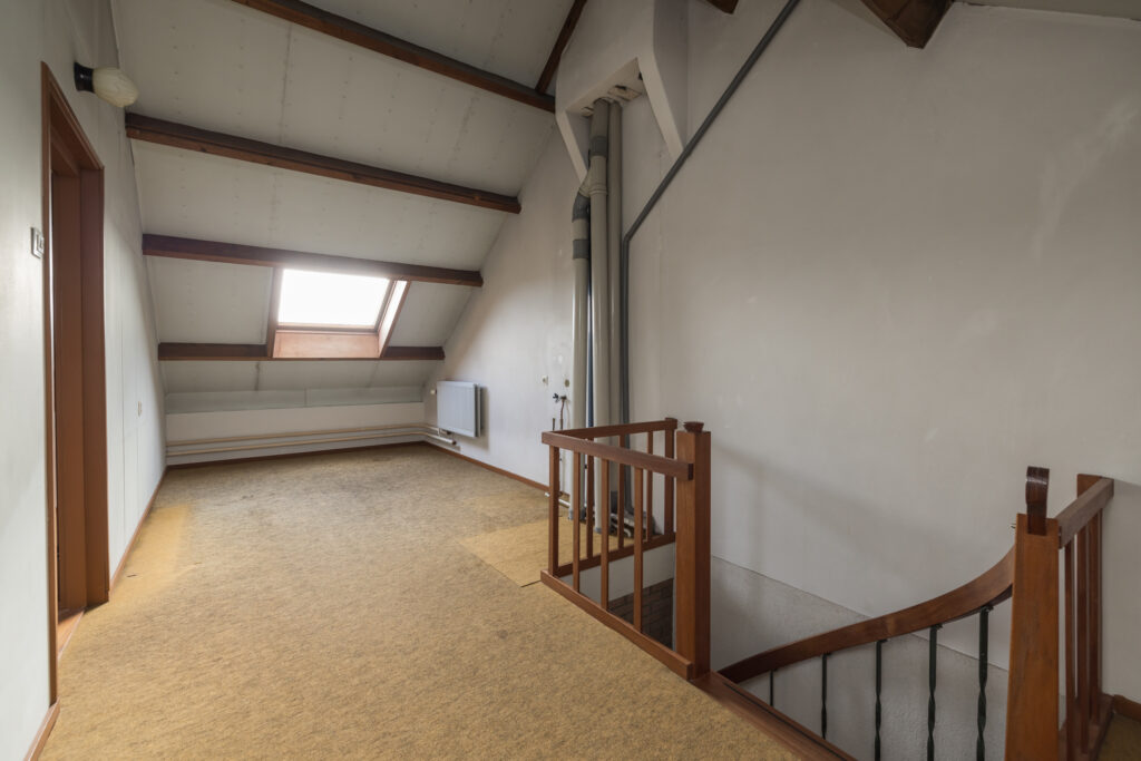 Ruime zolderverdieping, zeer ruime overloop, grote slaapkamer met ramen aan de zijkant en mogelijkheden voor extra slaapkamer(s), werkruimte of hobbyruimte.