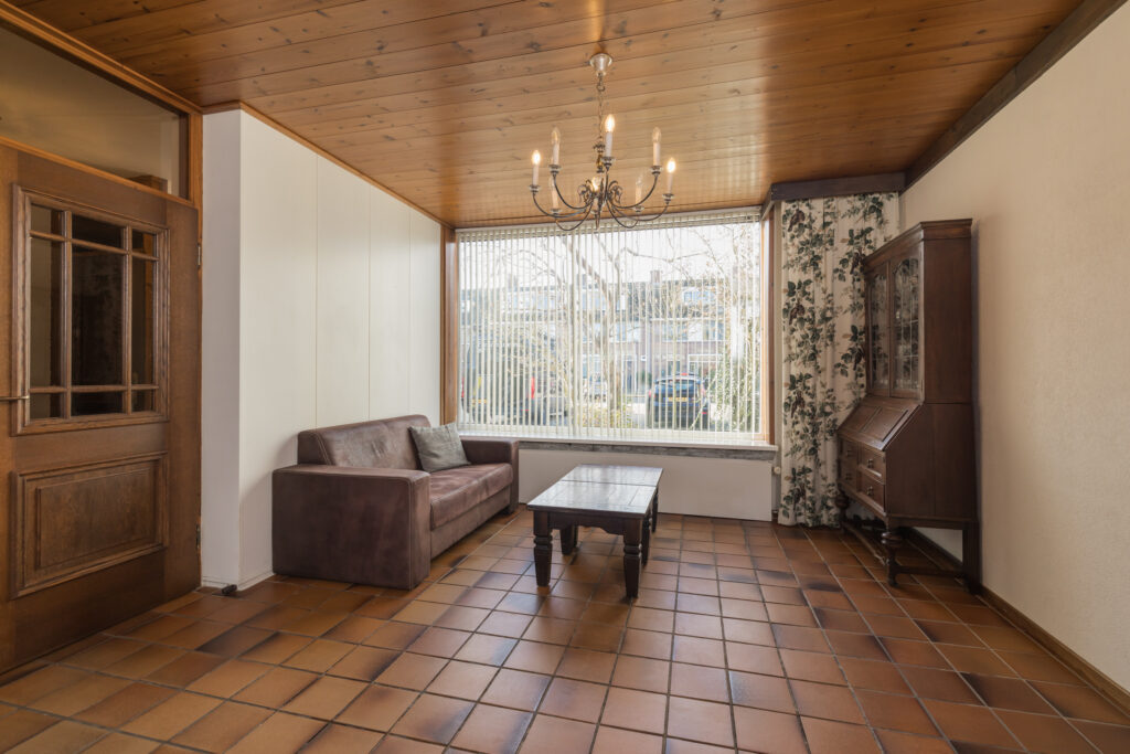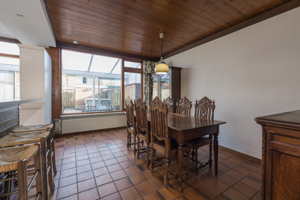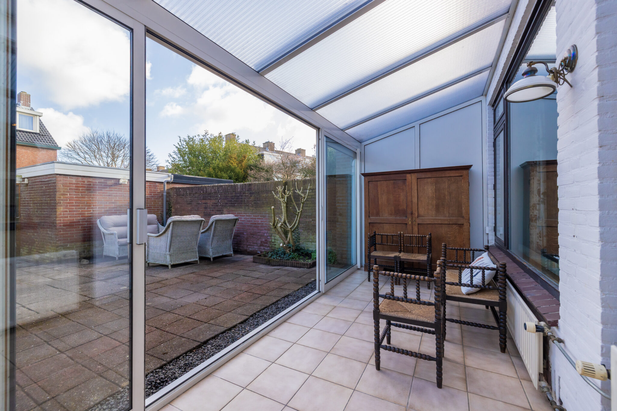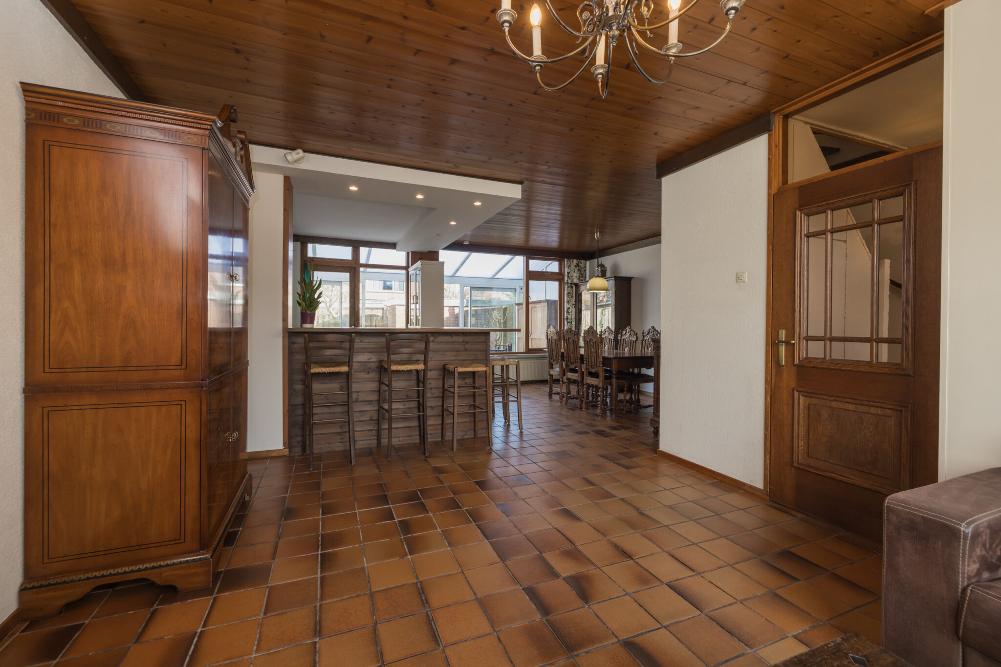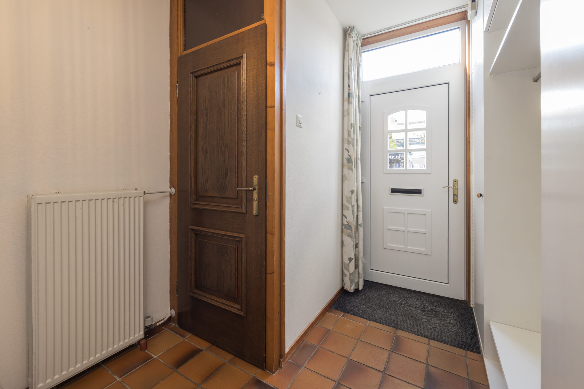 Entree, ruime hal, toilet met fonteintje, garderobekast, trapkast, royale Z-vormige living met toegang naar de serre. Vanuit de serre schuifdeuren naar terras en tuin. De gehele begane grondvloer is voorzien van tegelvoer.