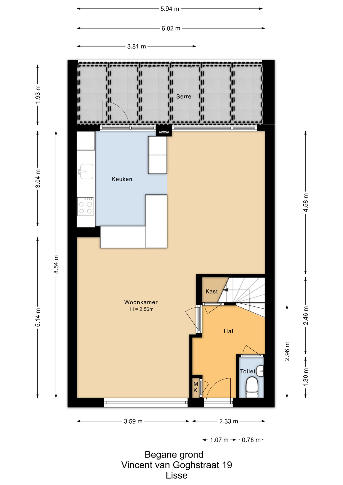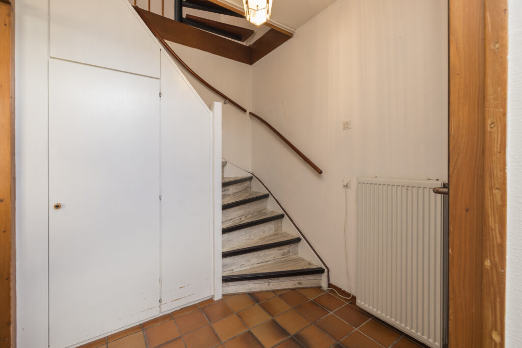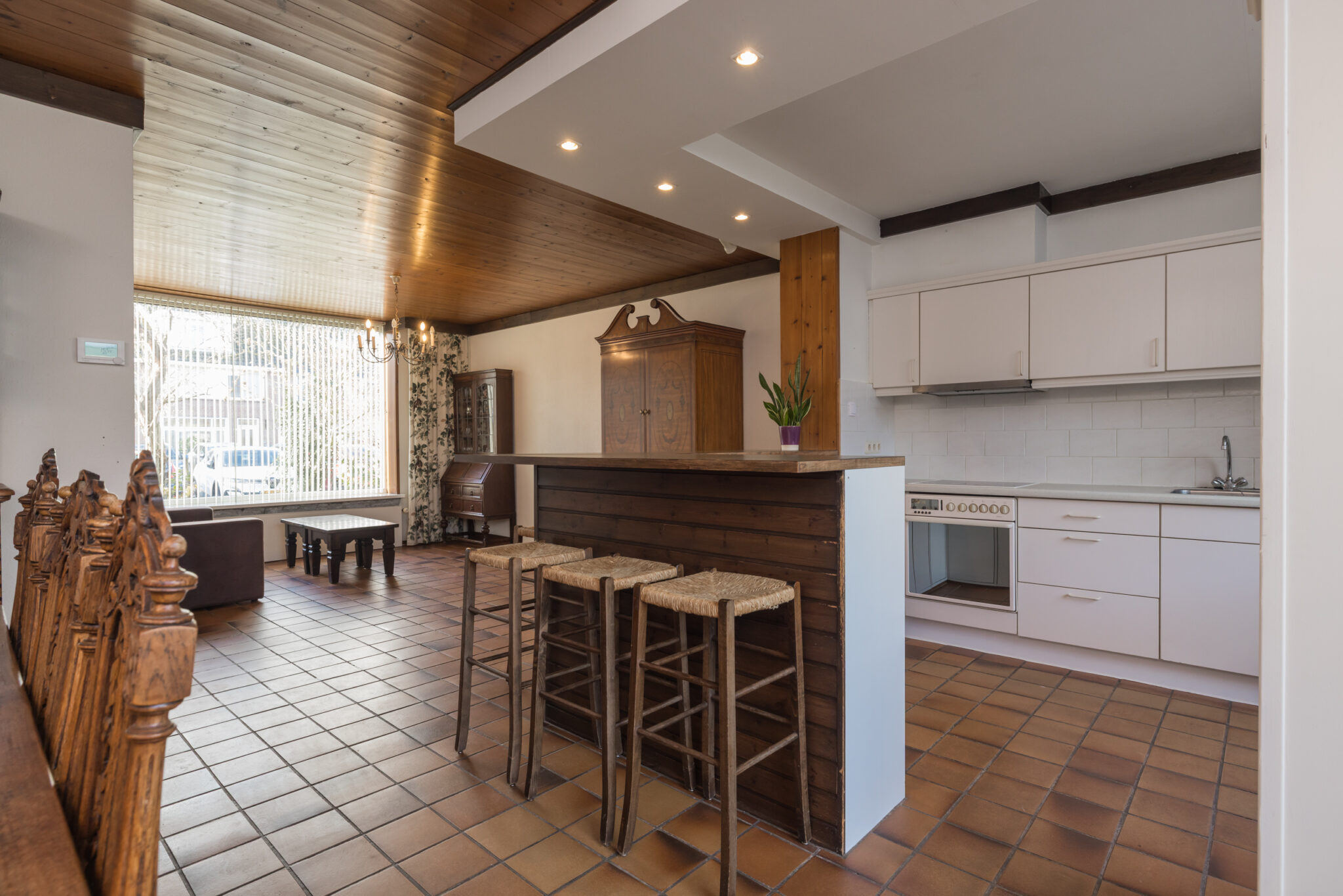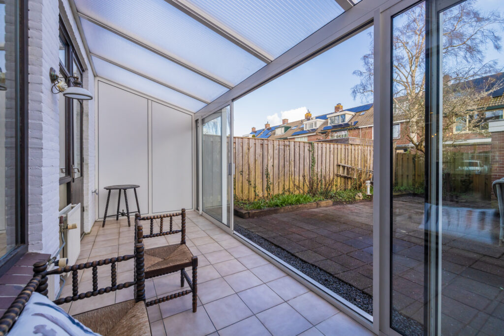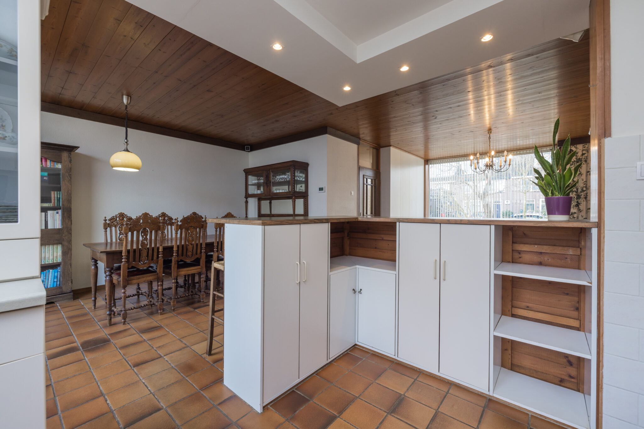 Entree, ruime hal, toilet met fonteintje, garderobekast, trapkast, royale Z-vormige living met toegang naar de serre. Vanuit de serre schuifdeuren naar terras en tuin. De gehele begane grondvloer is voorzien van tegelvoer.