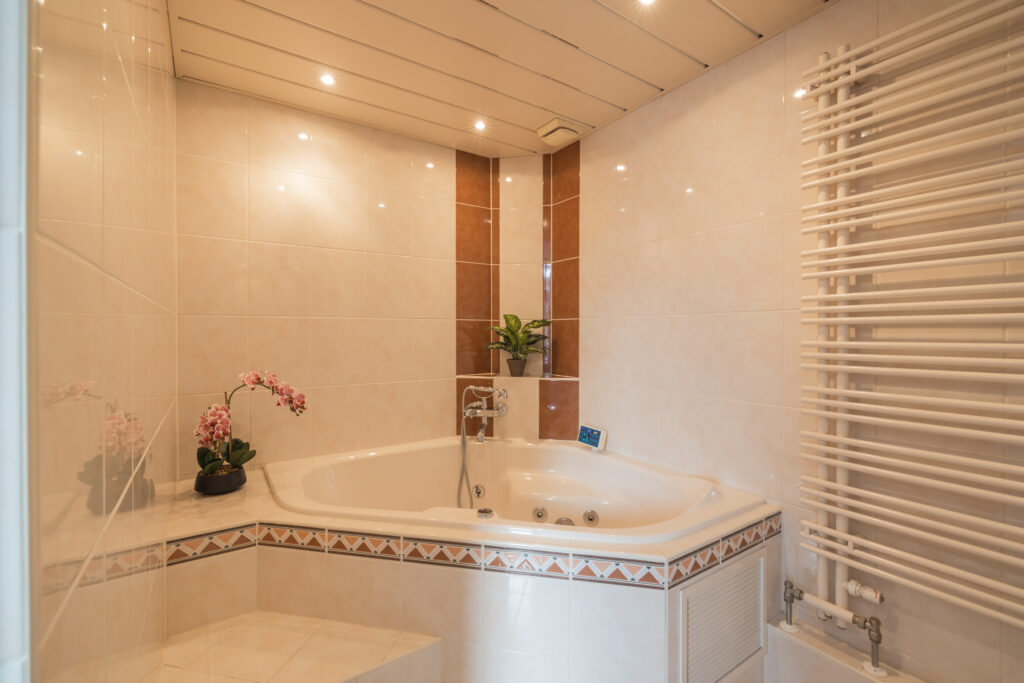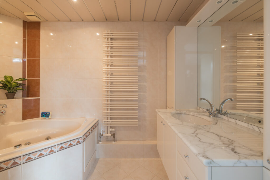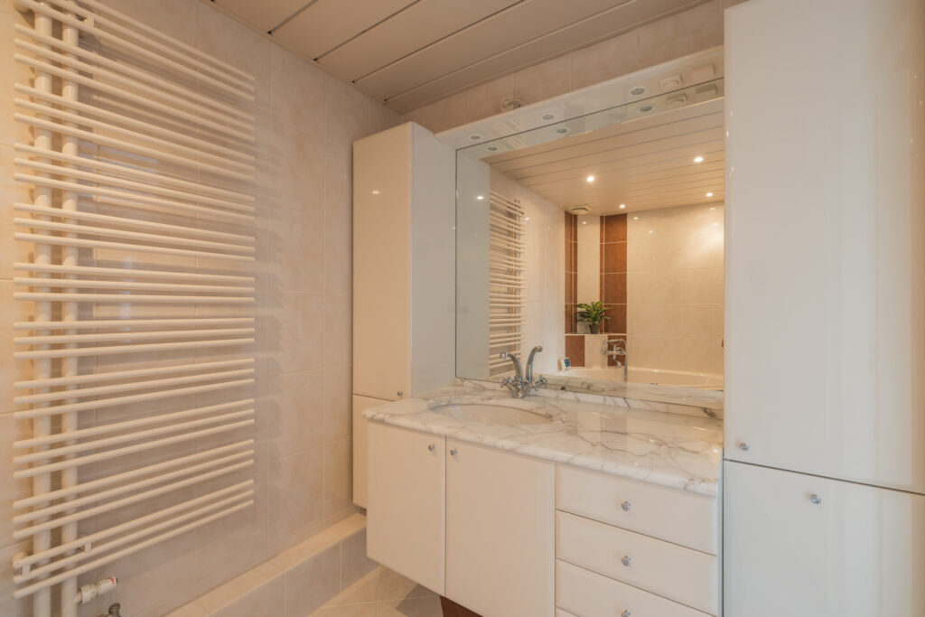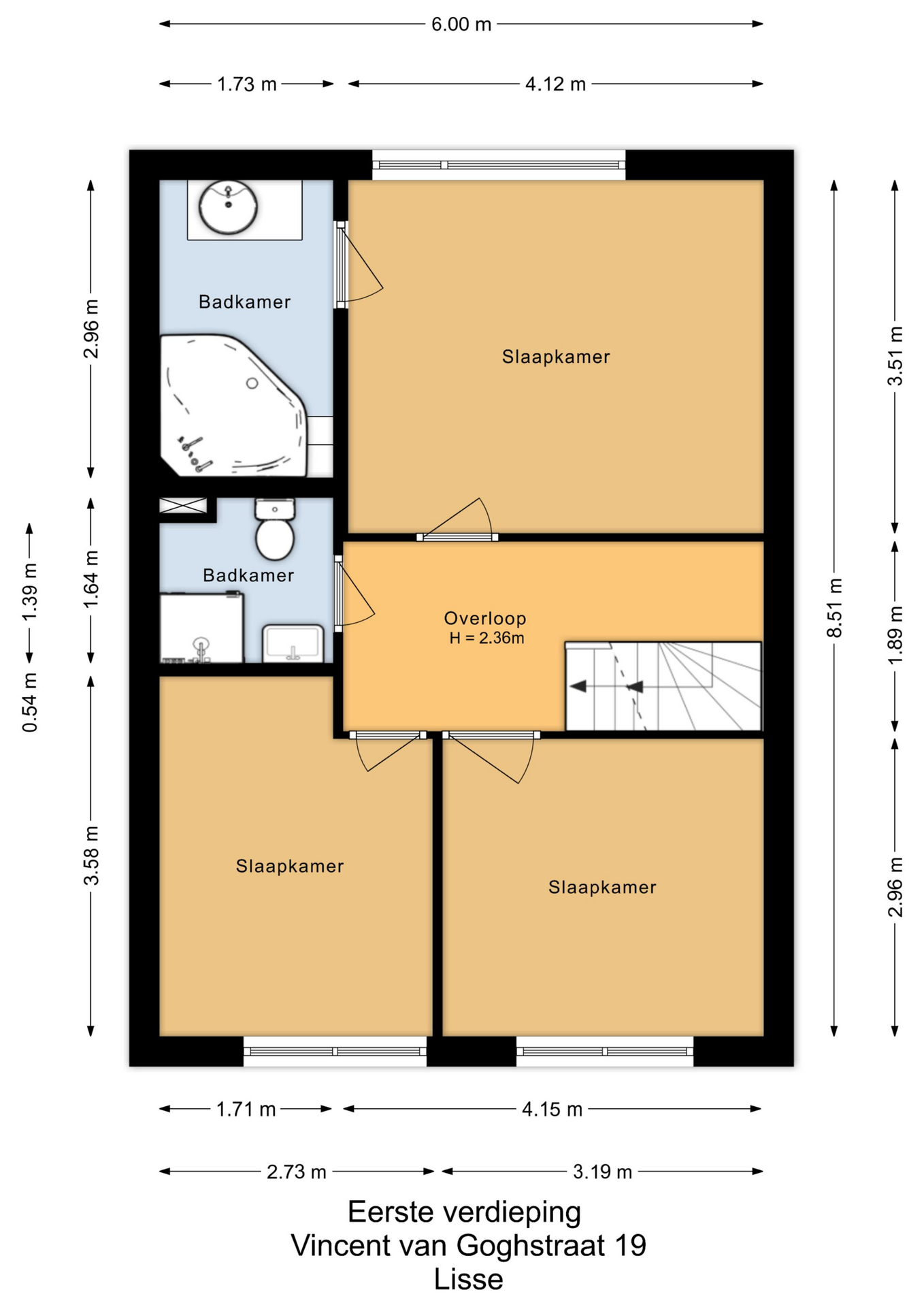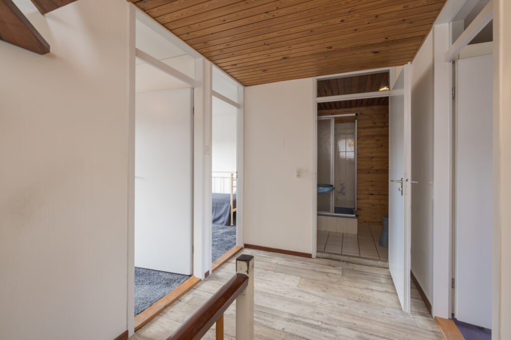 Overloop, 1e grote achterslaapkamer met aangrenzende badkamer met ligbad en wastafel. 2e en 3e ruime slaapkamer aan voorzijde, waarvan 1 met vaste kast, 2e badkamer met douchecabine, toilet en wastafel.