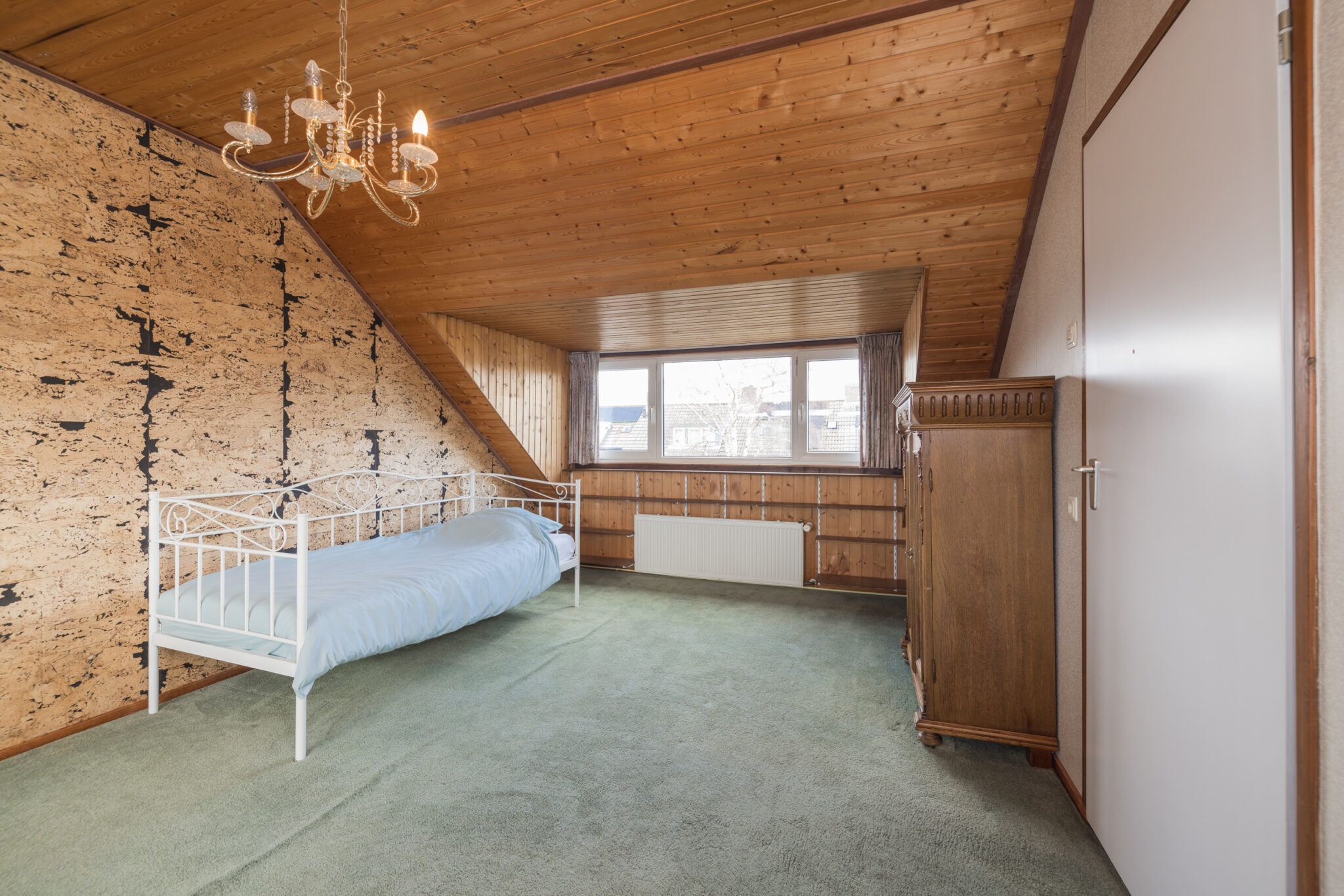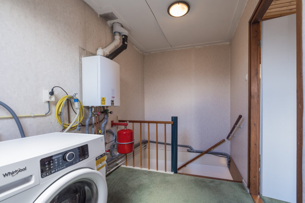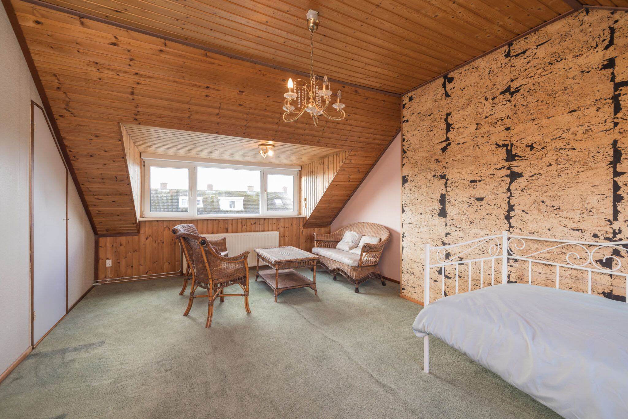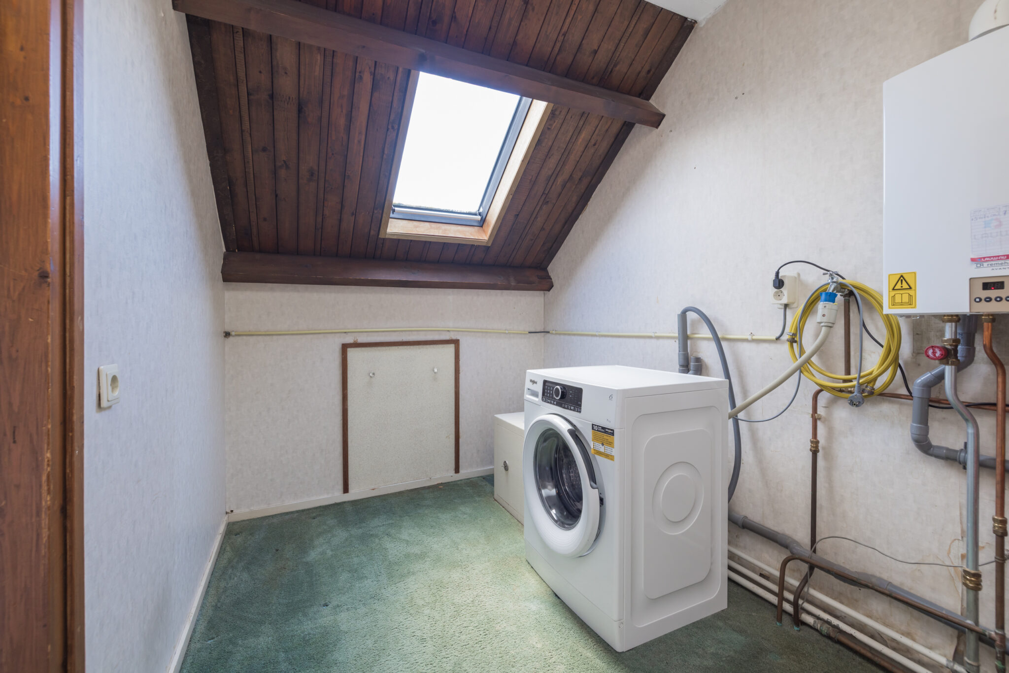 Overloop met dakvenster, bergruimte achter de knieschotten, Remeha CV ketel (2021) en aansluitingen ten behoeve van wasapparatuur, 4e grote zolderslaapkamer met voor- en achter dakkapellen en inloopkast met wastafel. Bergruimte achter de knieschotten.