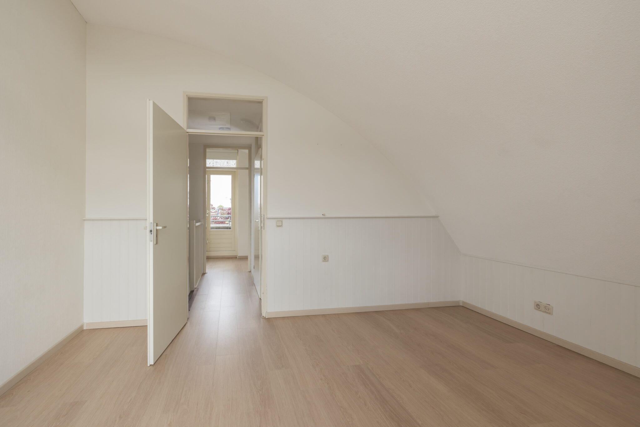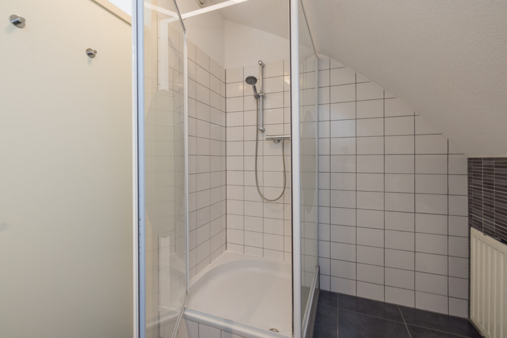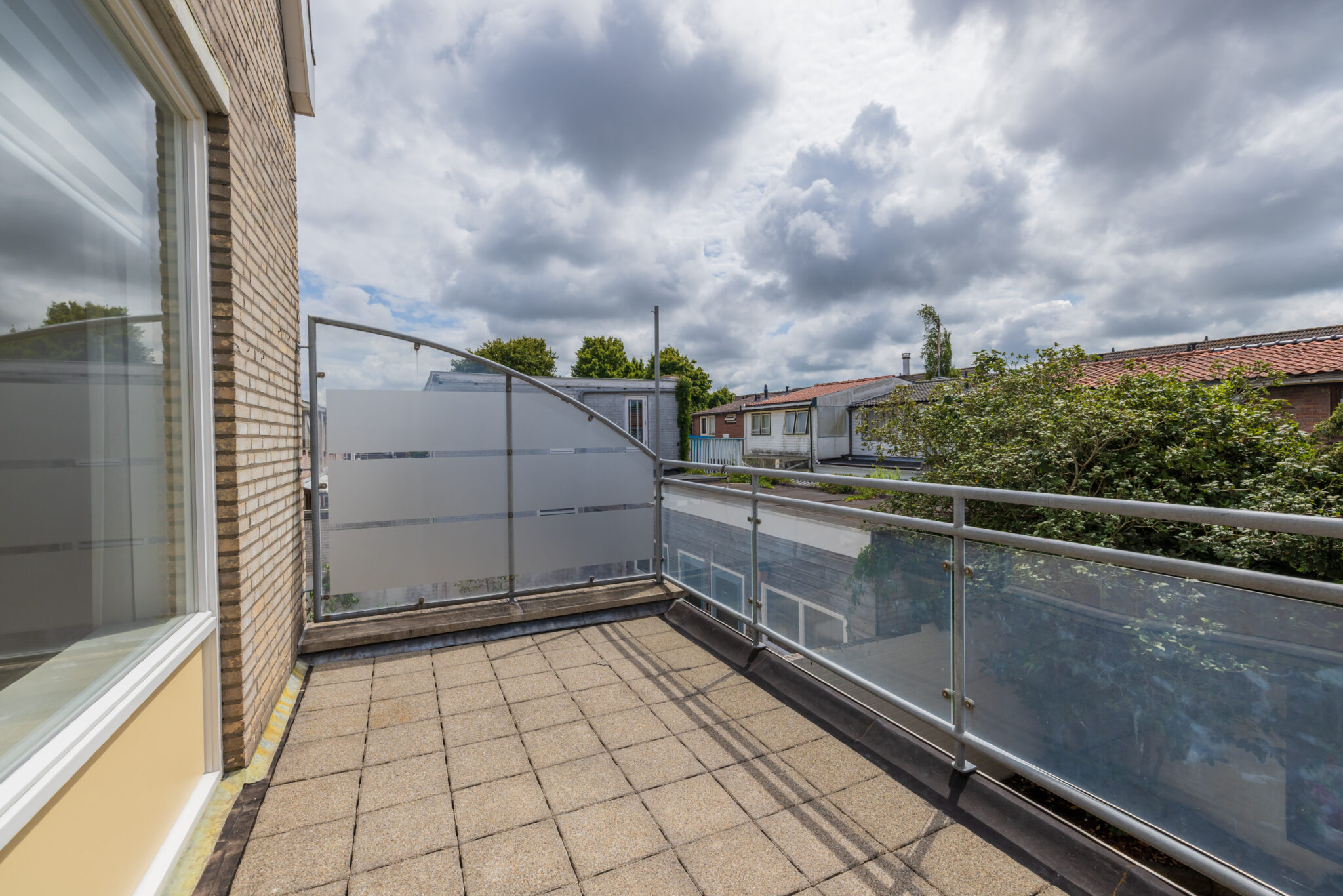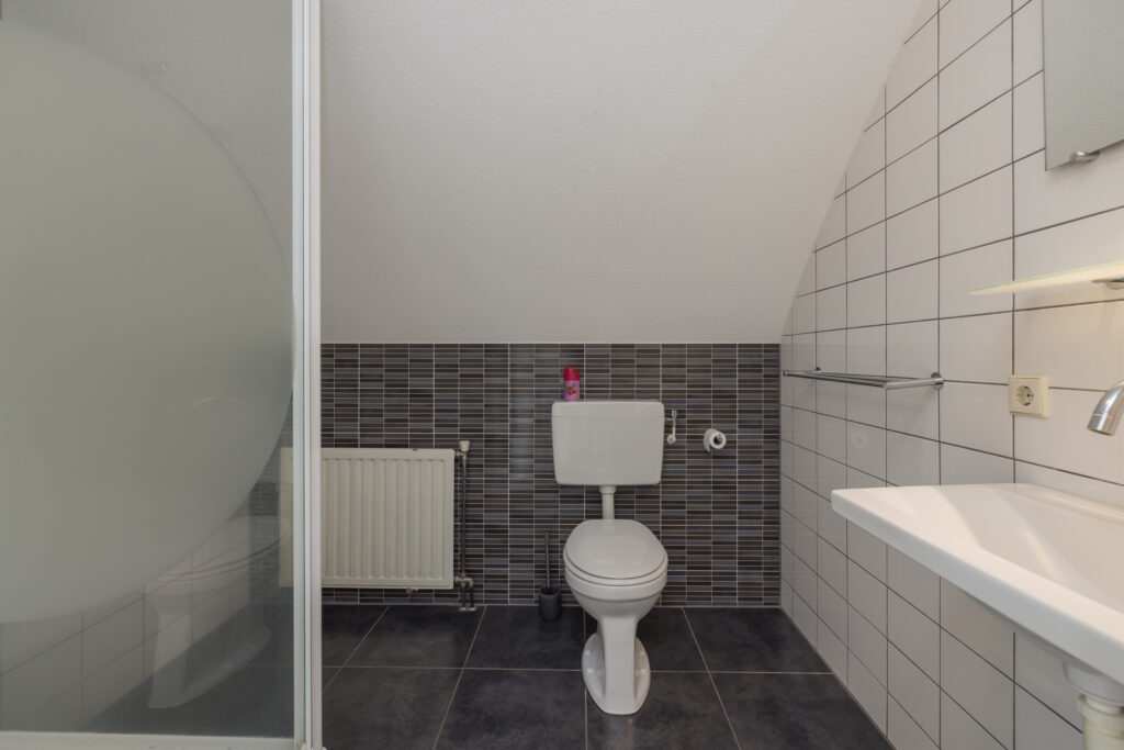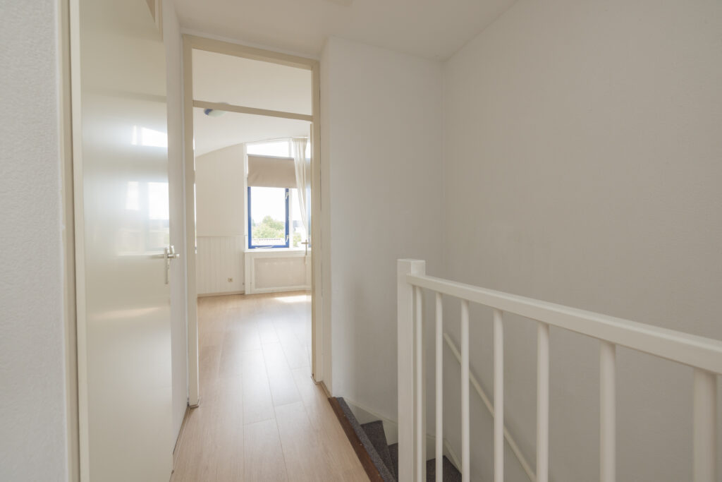 Overloop met luikje naar kleine bergvliering. Ruime hoofdslaapkamer aan de achterzijde, tweede slaapkamer aan de voorzijde met toegang tot een balkon. De nette badkamer beschikt over een douchecabine, tweede toilet en wastafel.