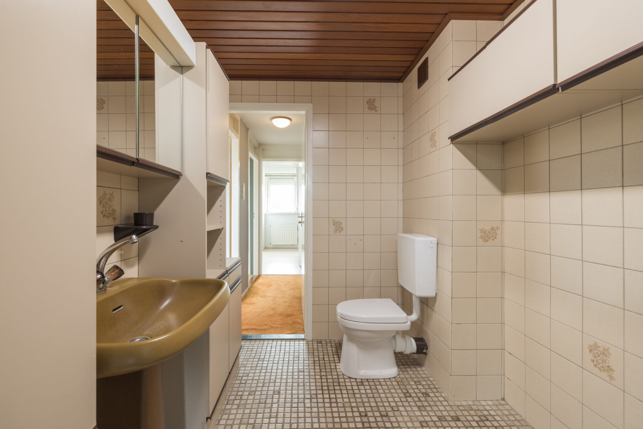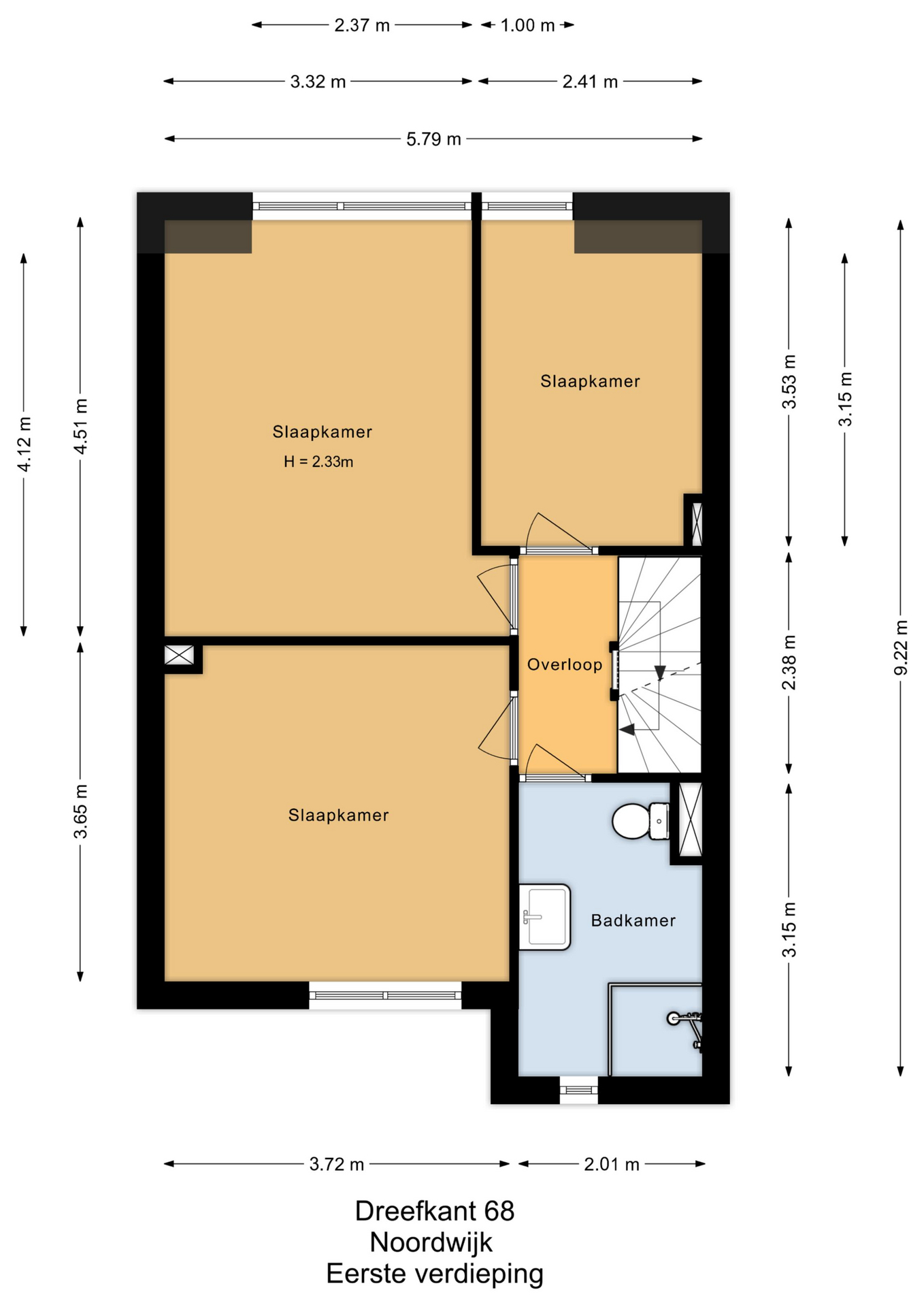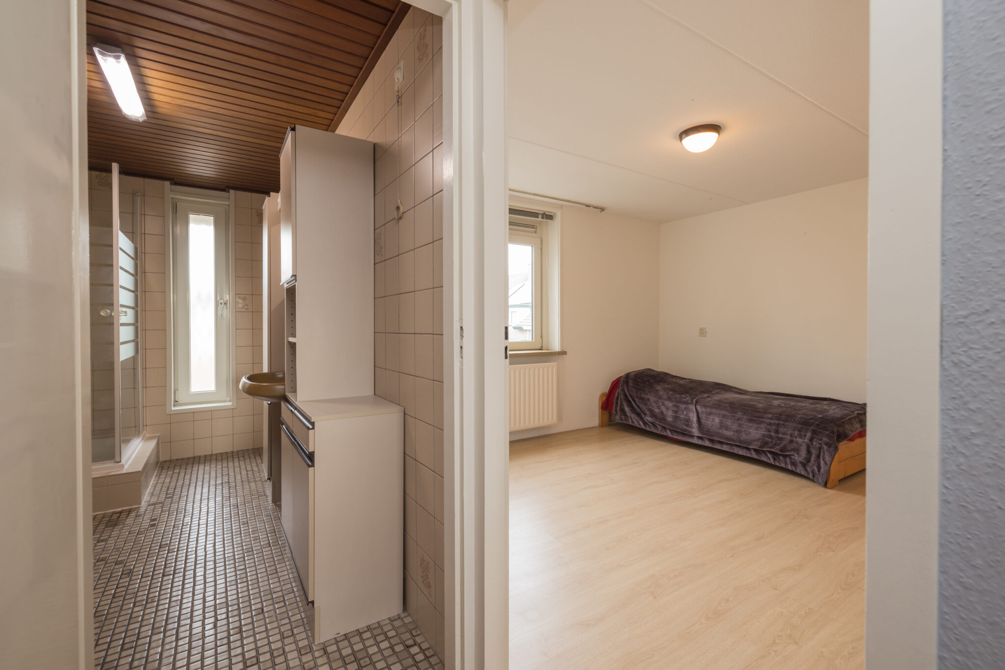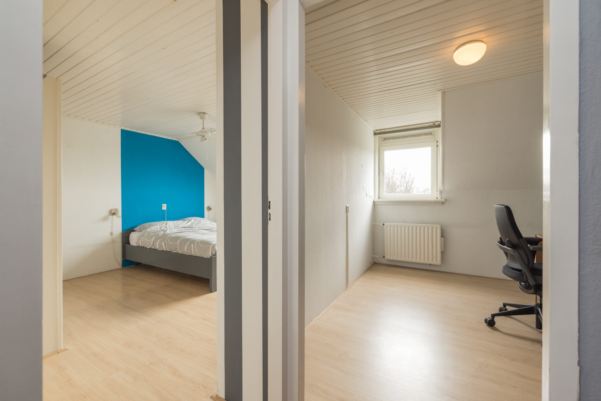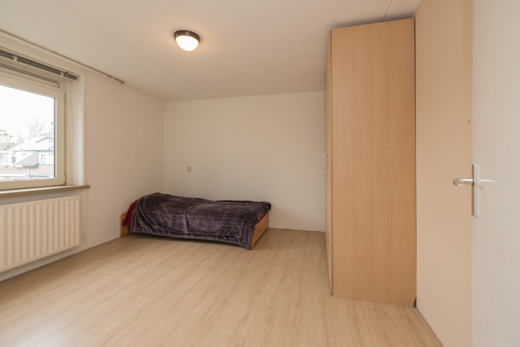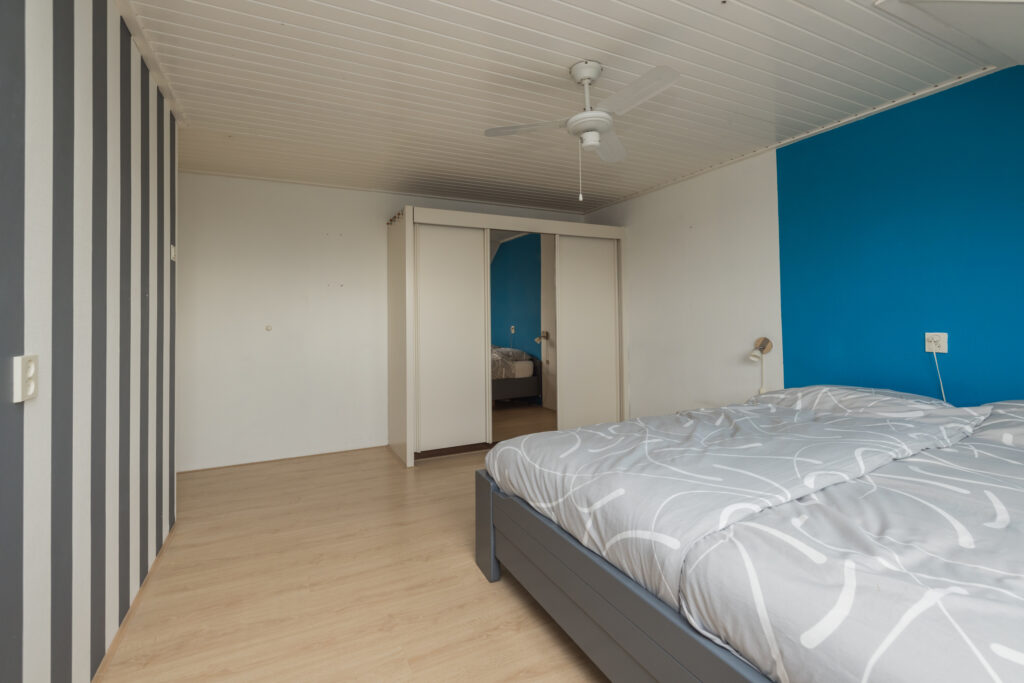 Overloop, 1e royale (ouder)slaapkamer en 2e slaapkamer, beide met dakopbouw, aan de achterzijde. Volledig betegelde badkamer met douche, wastafel, toilet en aansluiting wasapparatuur. Ruime 3e slaapkamer aan de voorzijde.